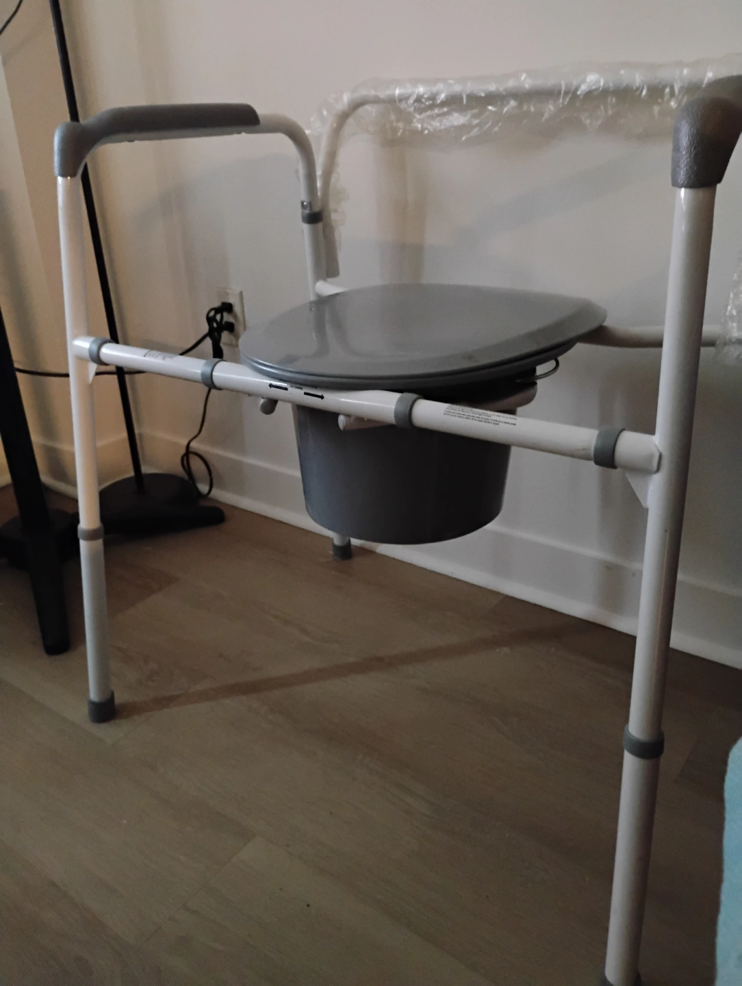12Grey plastic commode chair. Features a removable bucket and lid. Metal frame with armrests. Good for elderly or those with mobility issues.