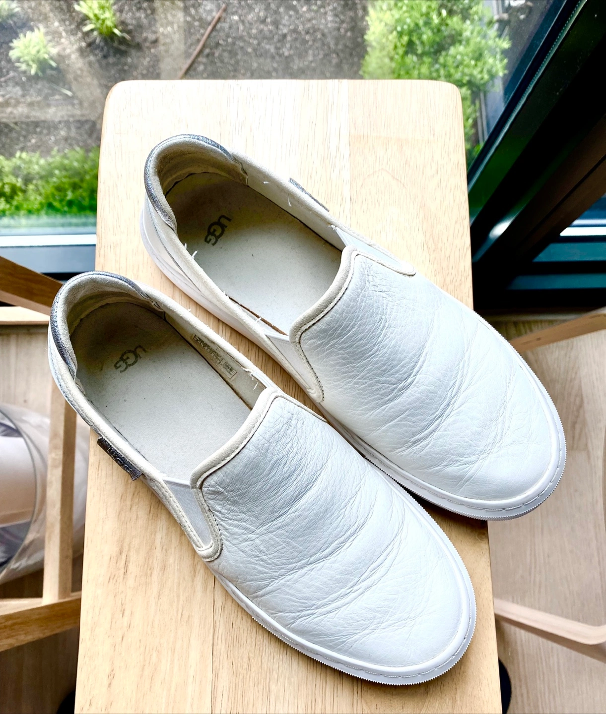 White leather slip-on sneakers. Minimalist design. Good for everyday wear. Slight wear visible.