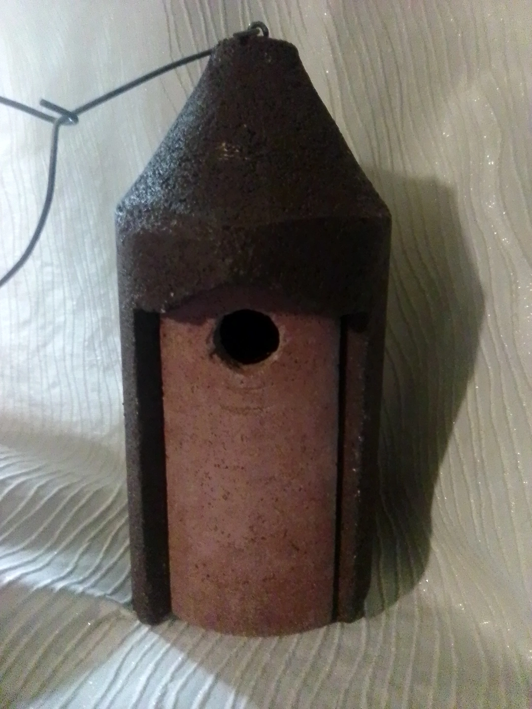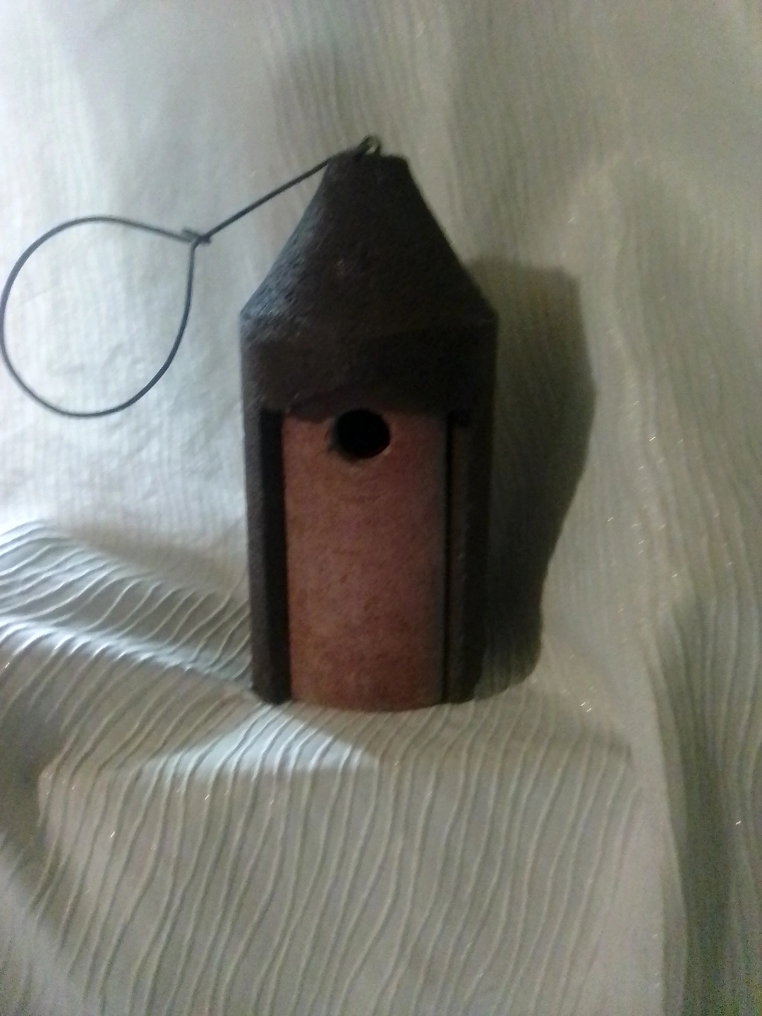 335Small birdhouse. Dark brown exterior. Simple design. Metal hanger. Perfect for attracting birds to your outdoor space.