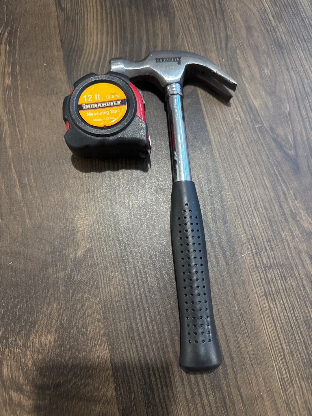 49Claw hammer with rubber grip. Includes a 12ft Durabuilt measuring tape.