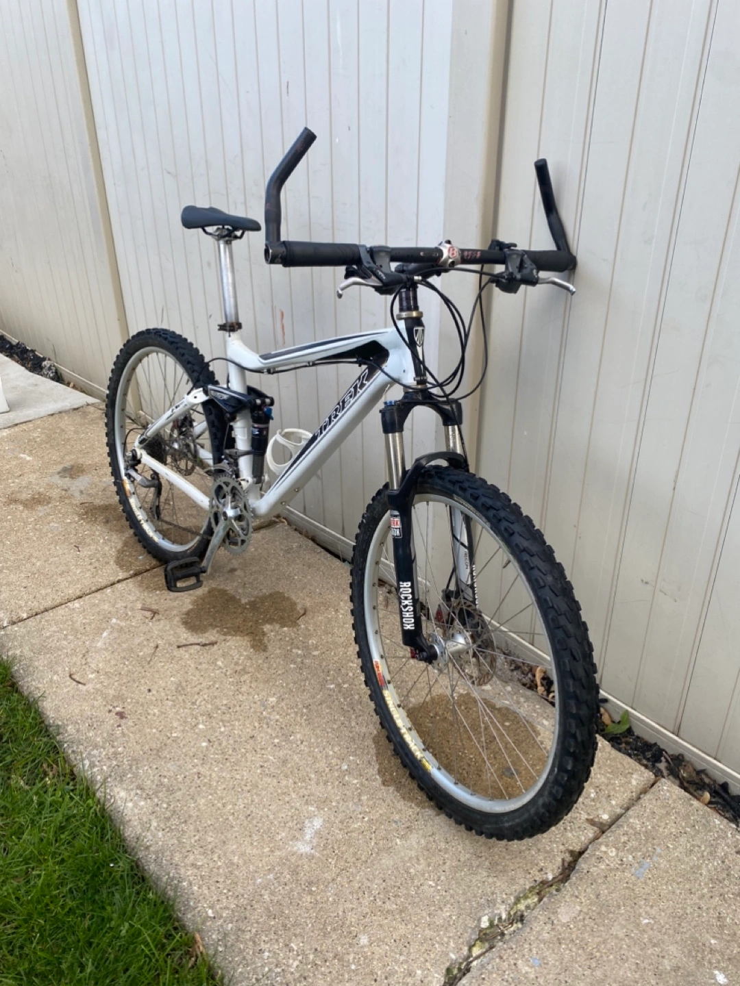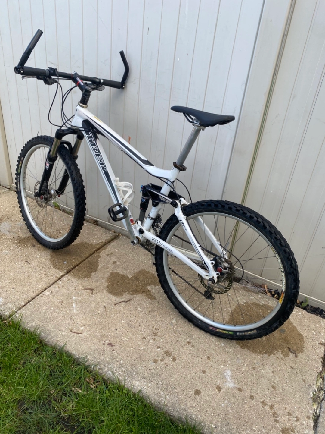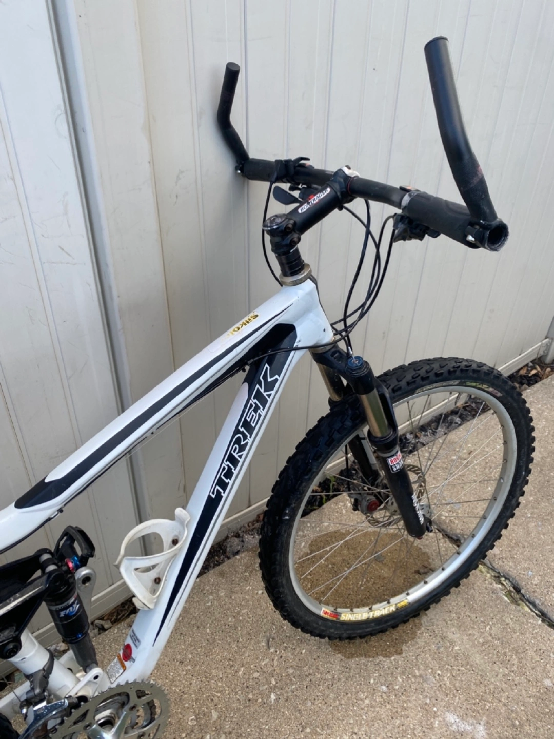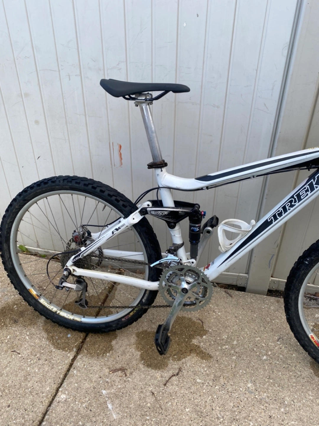 Full suspension mountain bike. White and black frame. Rockshox front fork. Used condition. Needs front derailleur.