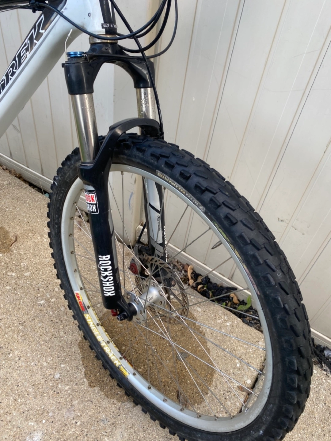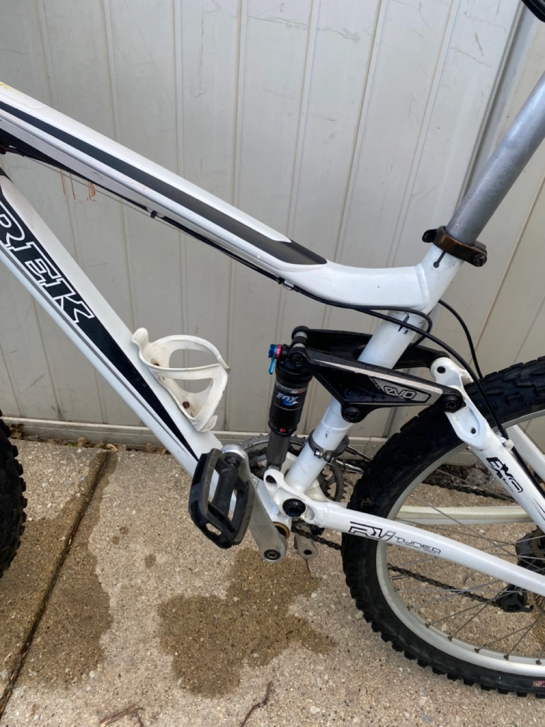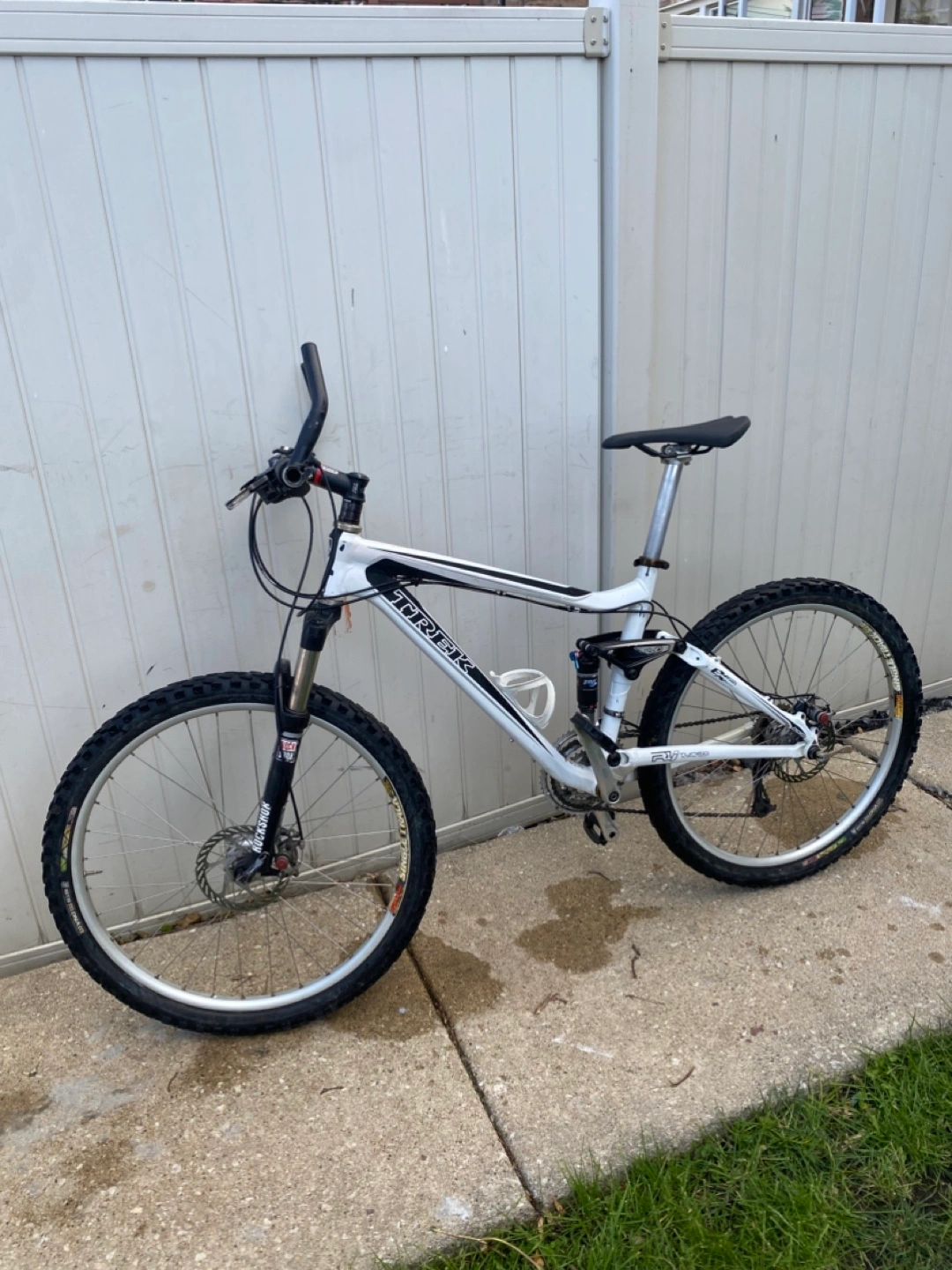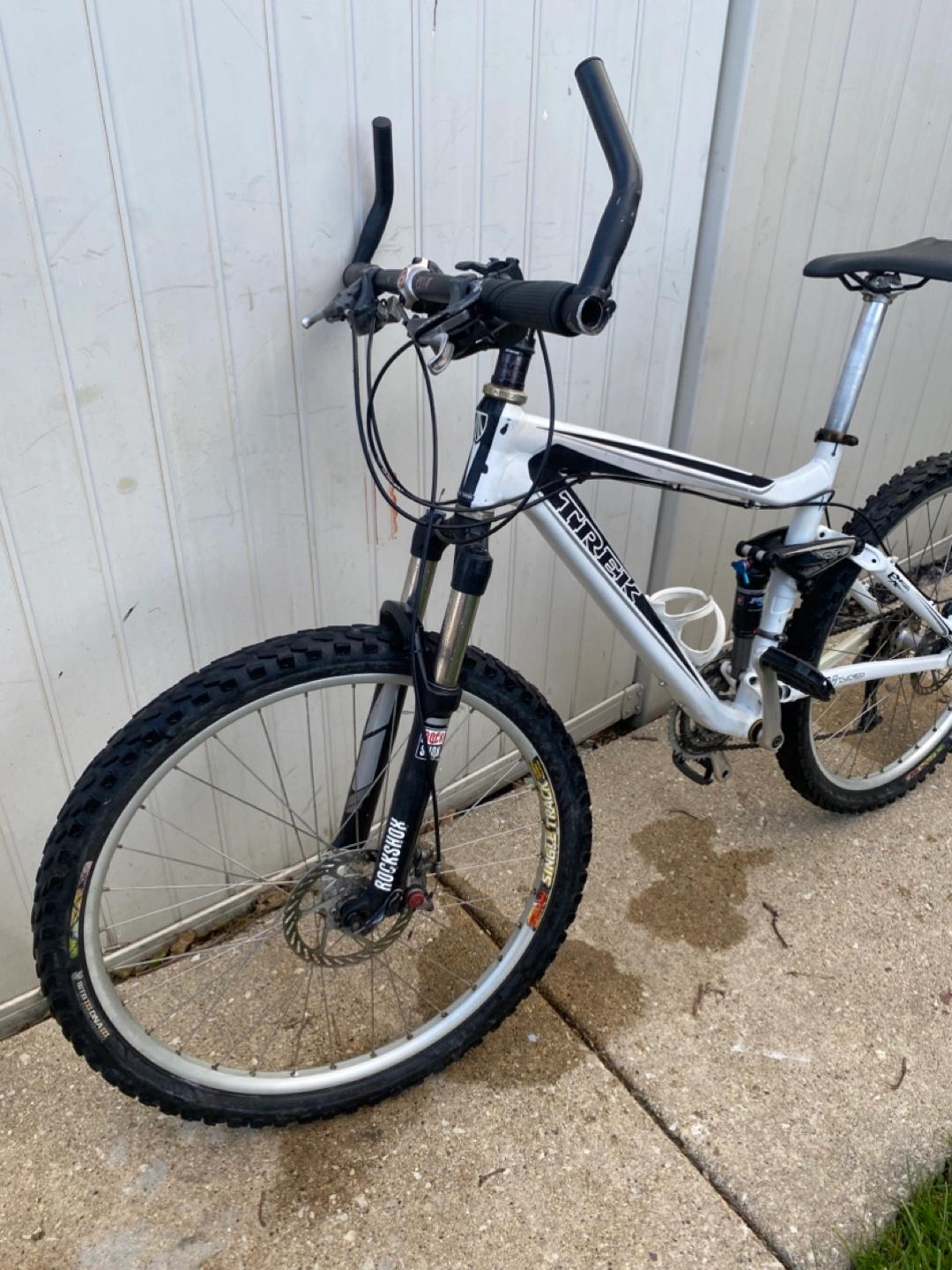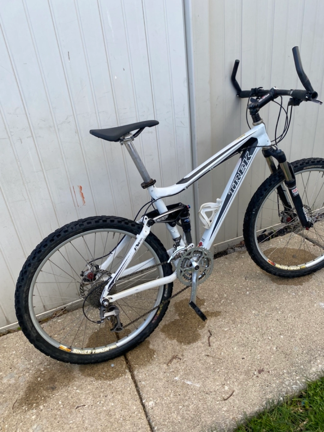 Full suspension mountain bike. White and black frame. Rockshox front fork. Used condition. Needs front derailleur.