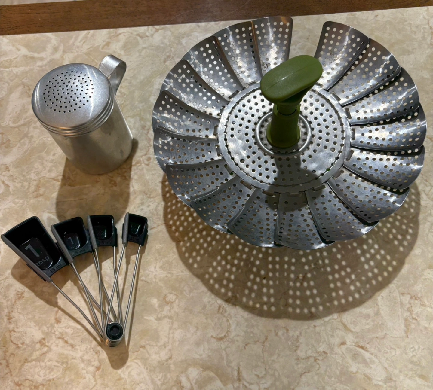 Stainless steel collapsible steamer(missing a leaf but still works) Set of four nesting measuring spoons. Aluminum salt shaker. Great for baking and cooking.