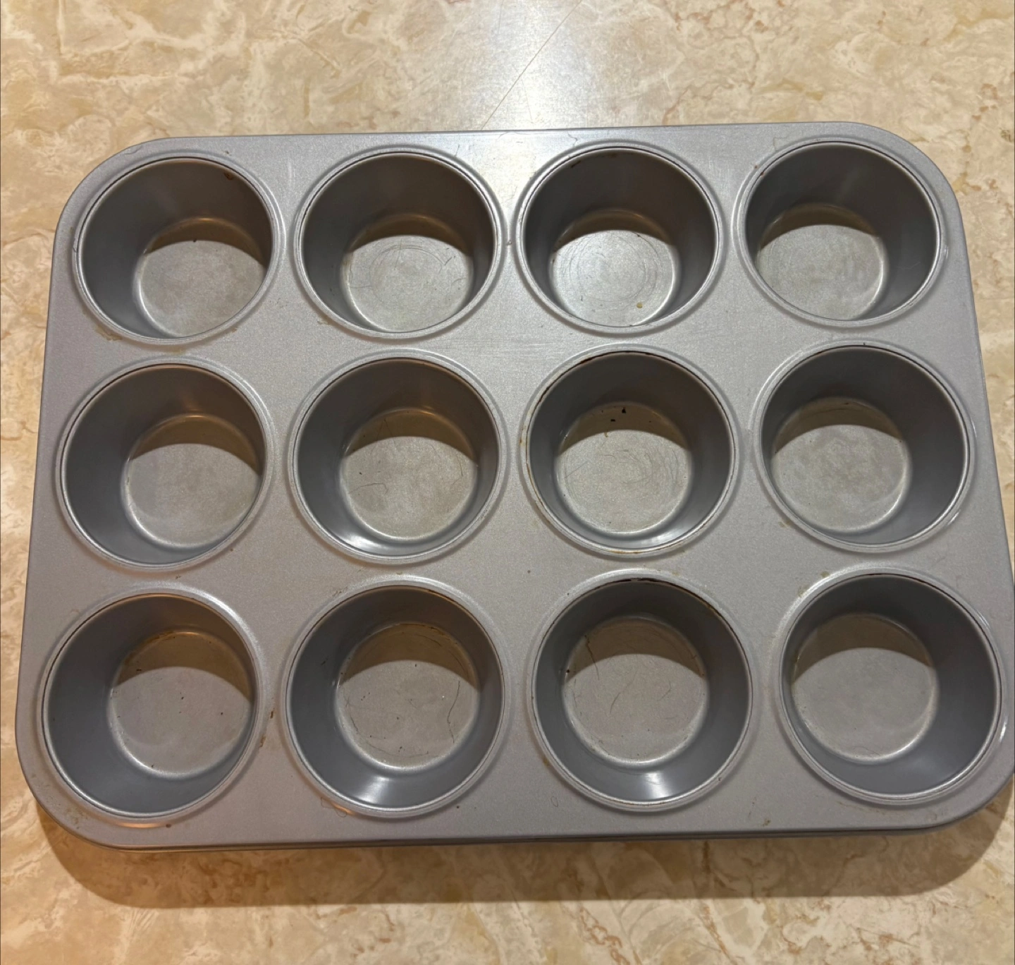 1000+Silver-toned metal muffin tin. Twelve standard-sized cups. Shows minor signs of use.