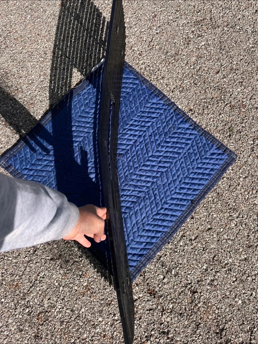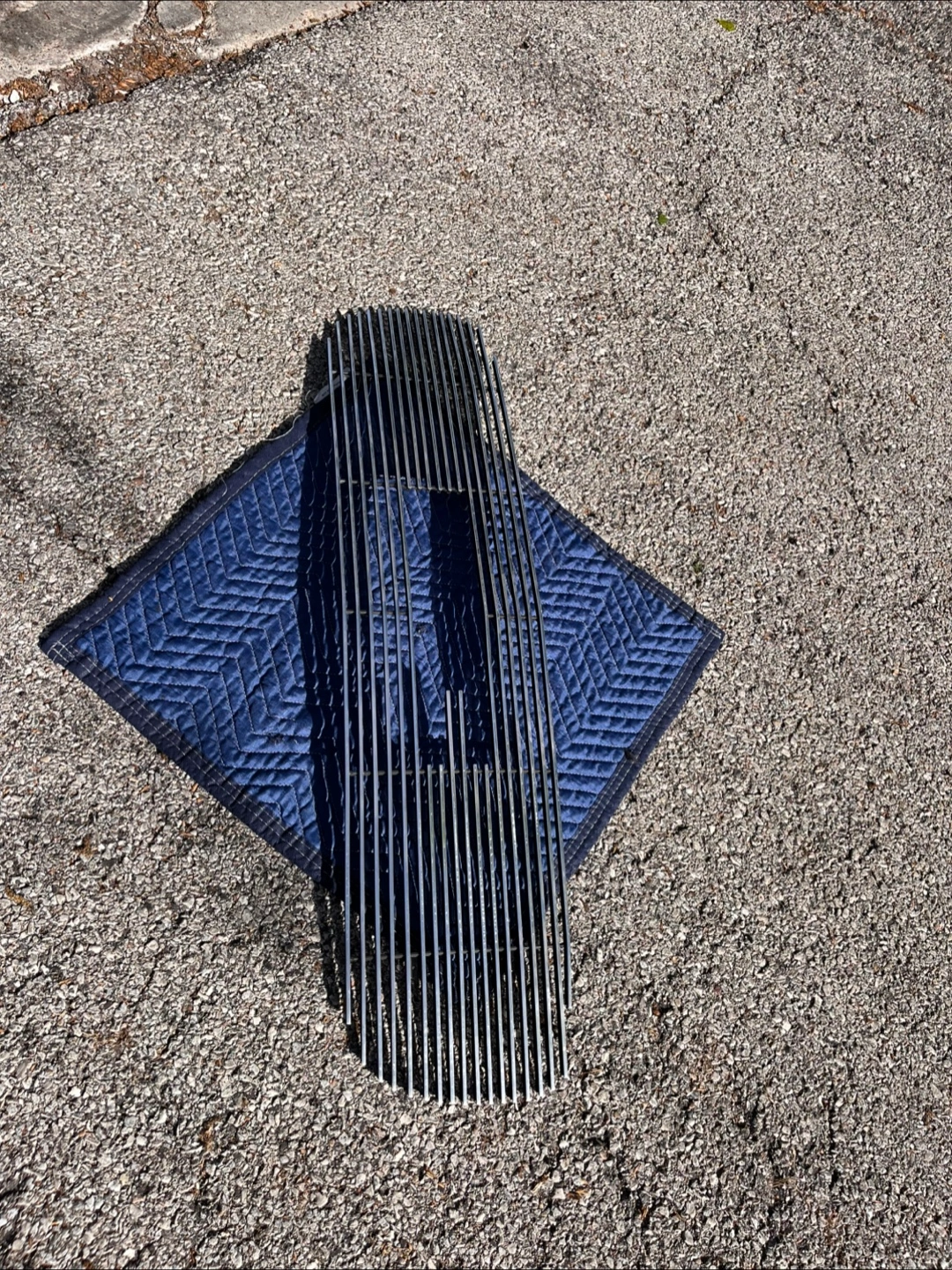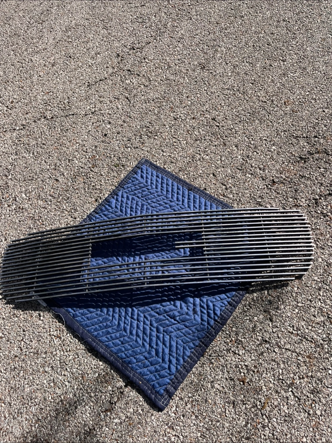 GMC overlay Metal car grill. Long and narrow. Multiple thin vertical bars. Center cutout. Looks like it could be for a classic car.