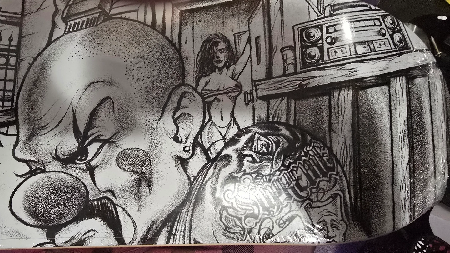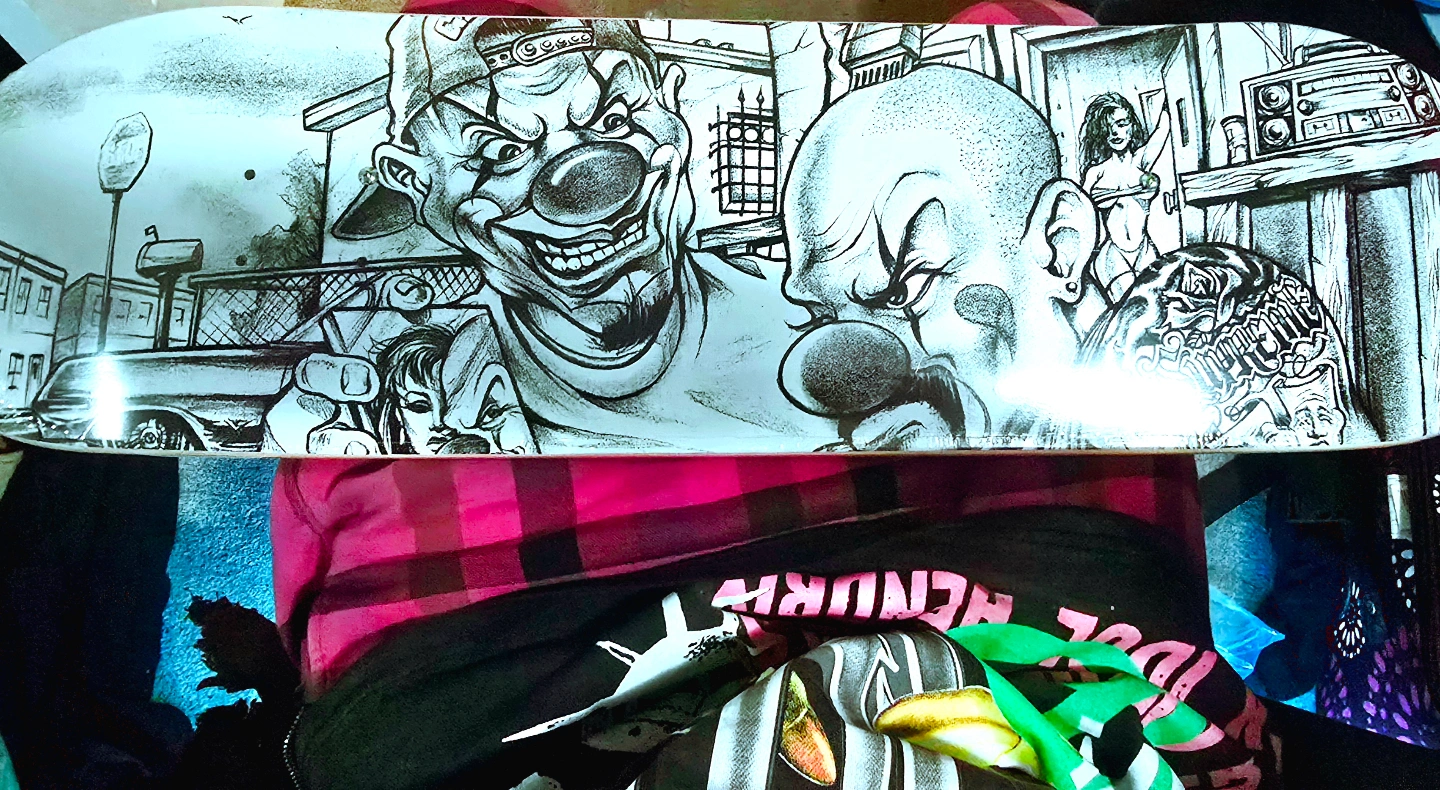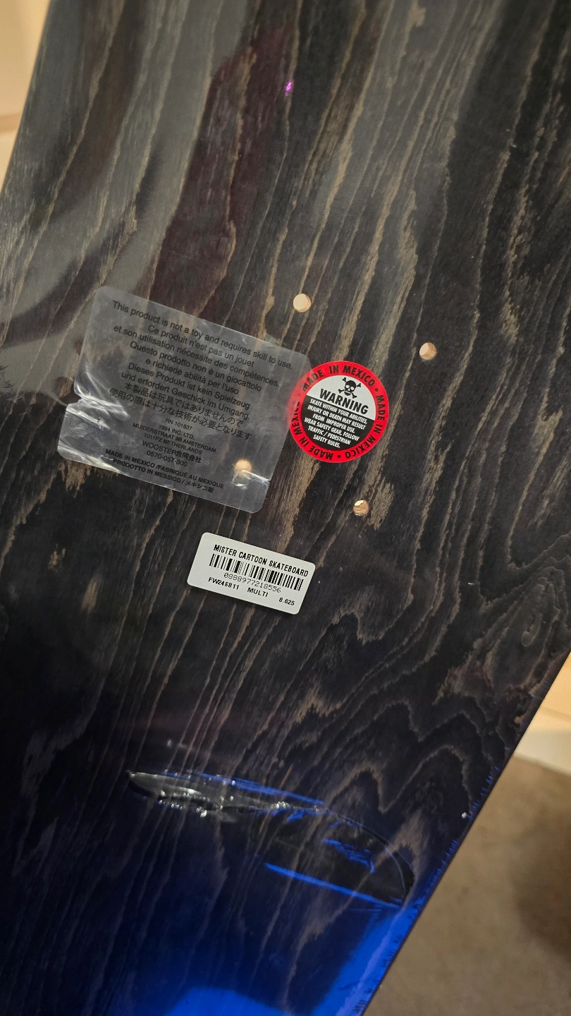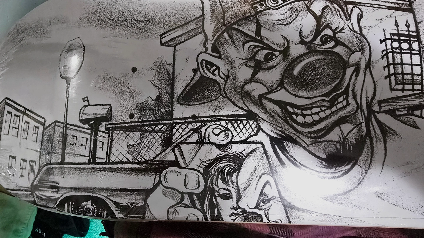 New Mr Cartoon skateboard deck. Features a black and white graphic of clowns and a woman. Made in Mexico. From the S/S4 collection. Very cool graphic tale of jealousy, resentment, betrayal & murder, spread throughout the Mister Cartoon collab collection. I was going to skate it, but then remembered I'm 38, if I break a hip? I'm done for. I mean, the government will pay for my assisted suicide to make way for 2 new Somaliland newcomer, which is nice. But still... A part of me wonders if I truly DO want to just end it all?... This isn't a cry for help, this is a SCREAM. A screamin' deal. Buy it, enable my LSD habit.