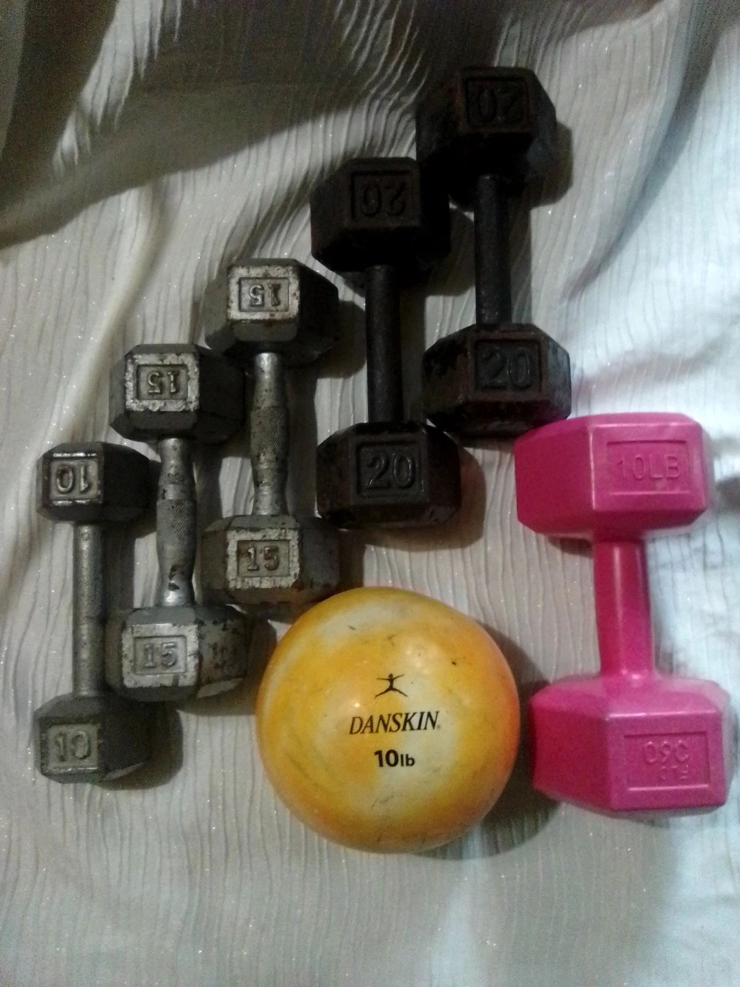 335Set of used dumbbells, various weights. Includes one 10lb medicine ball. Some rust and wear.