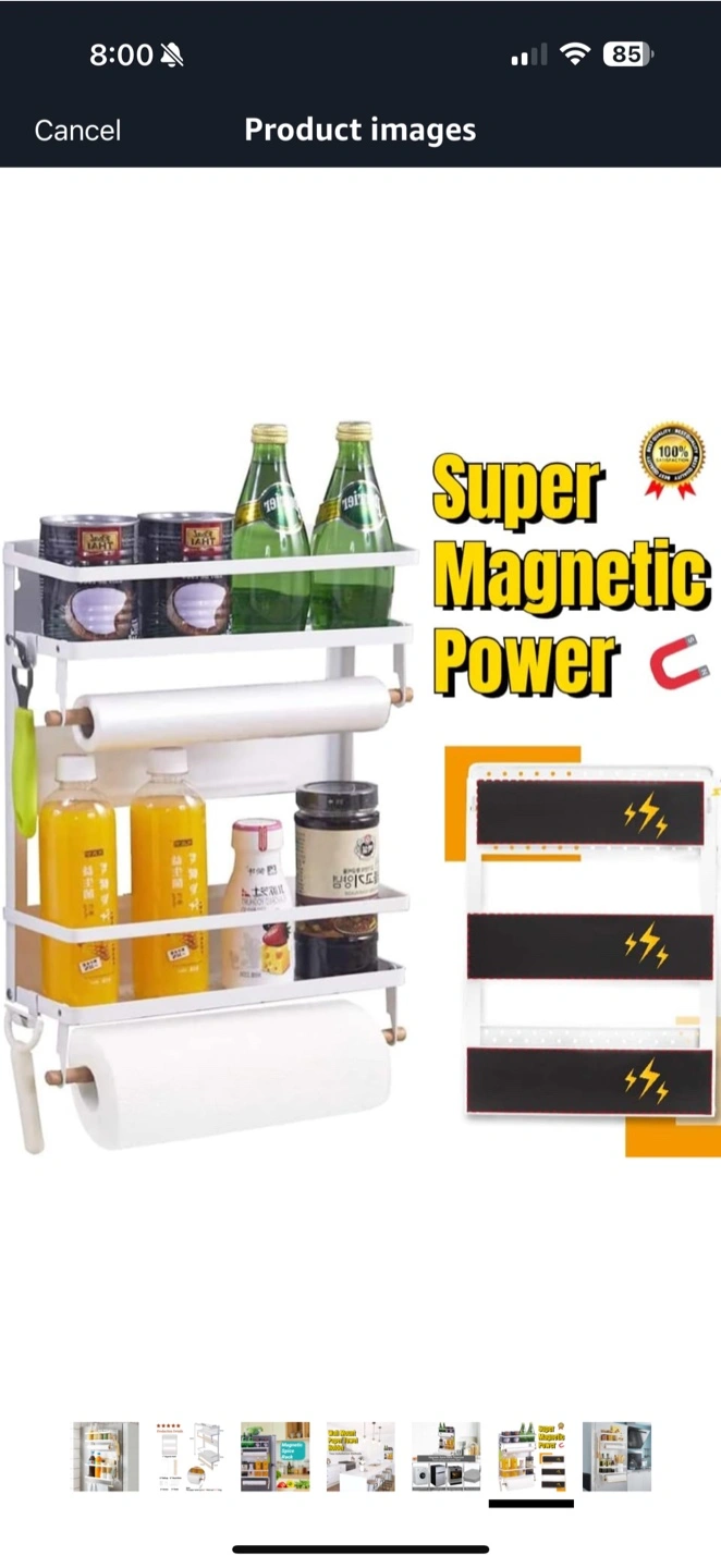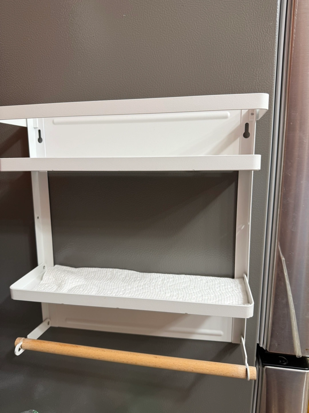 10White metal two-tiered magnetic spice rack. Includes a paper towel holder. Strong magnets, easy to install. Great for kitchens and pantries.