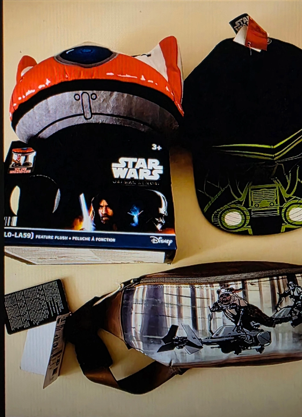 Star Wars bundle includes LO-LA59 plush toy, black baseball cap with green design, and brown fanny pack. All items appear new. Great gift for Star Wars fans.