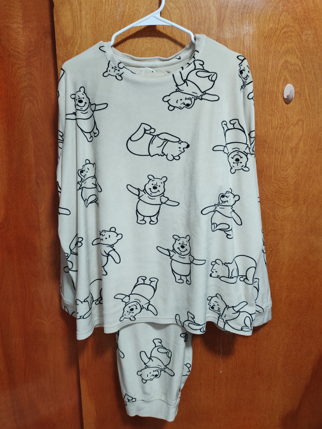 Pajama set in a cream color. Winnie the Pooh character print. Long-sleeved top. Matching pants included. Enjoy snuggling up in them after a long day. #freecycle