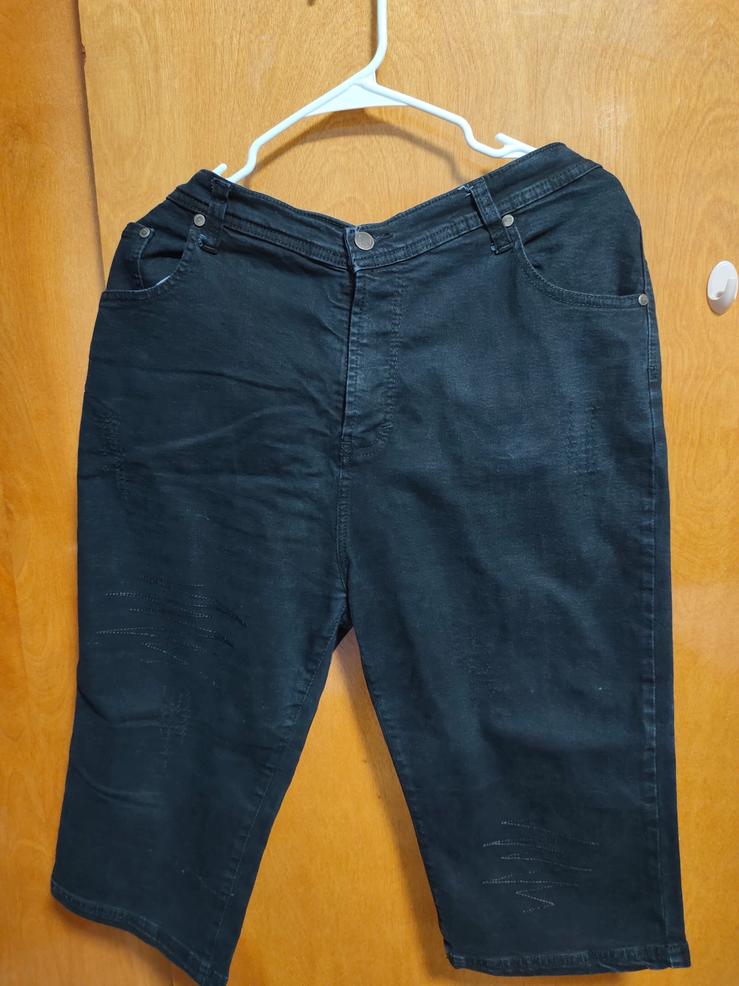 Black denim capri pants on a white hanger. Features pockets on the front and back. Could be perfect for a relaxing day out, paired with your favorite shoes. Rarely used. #freecycle