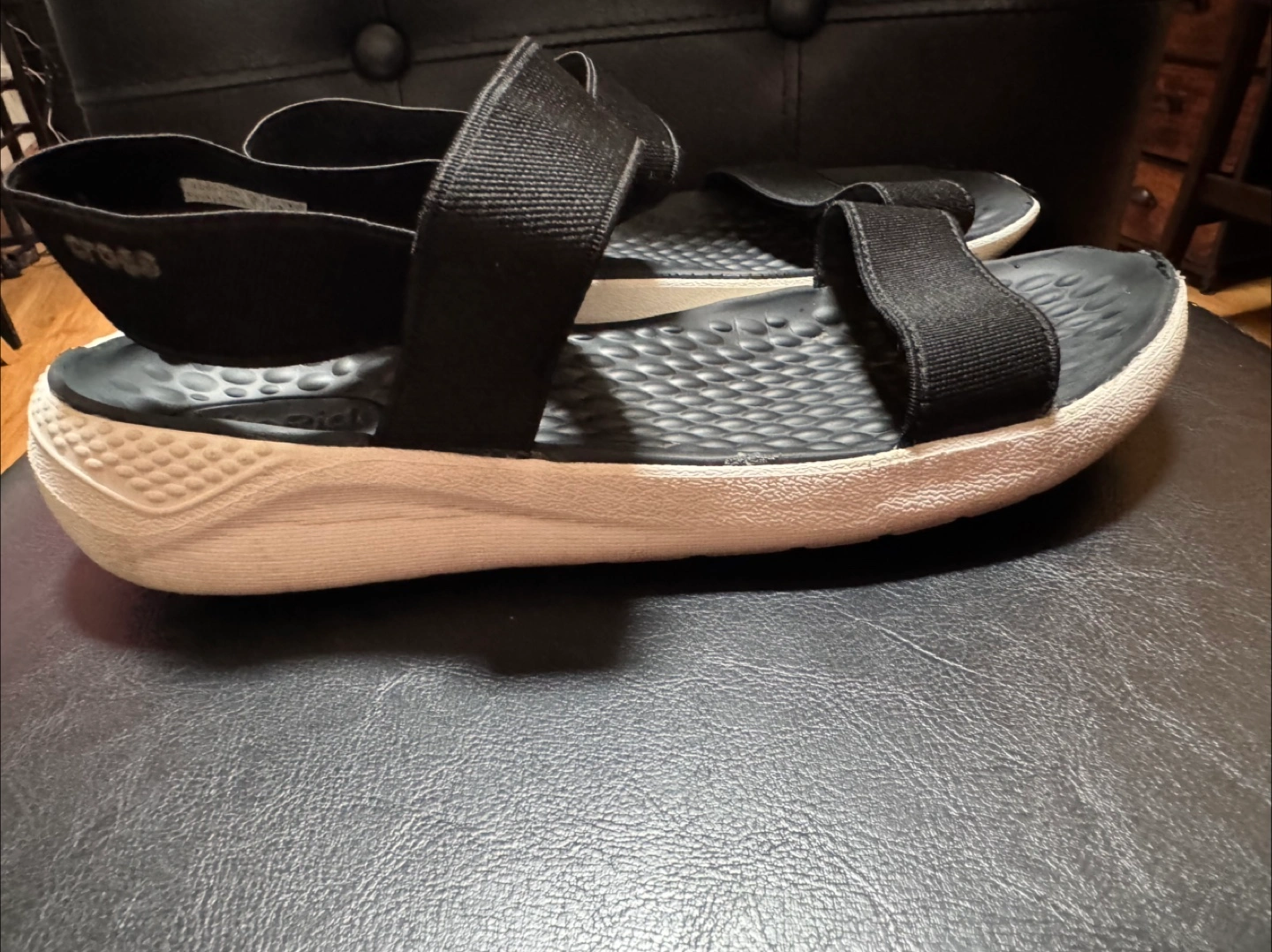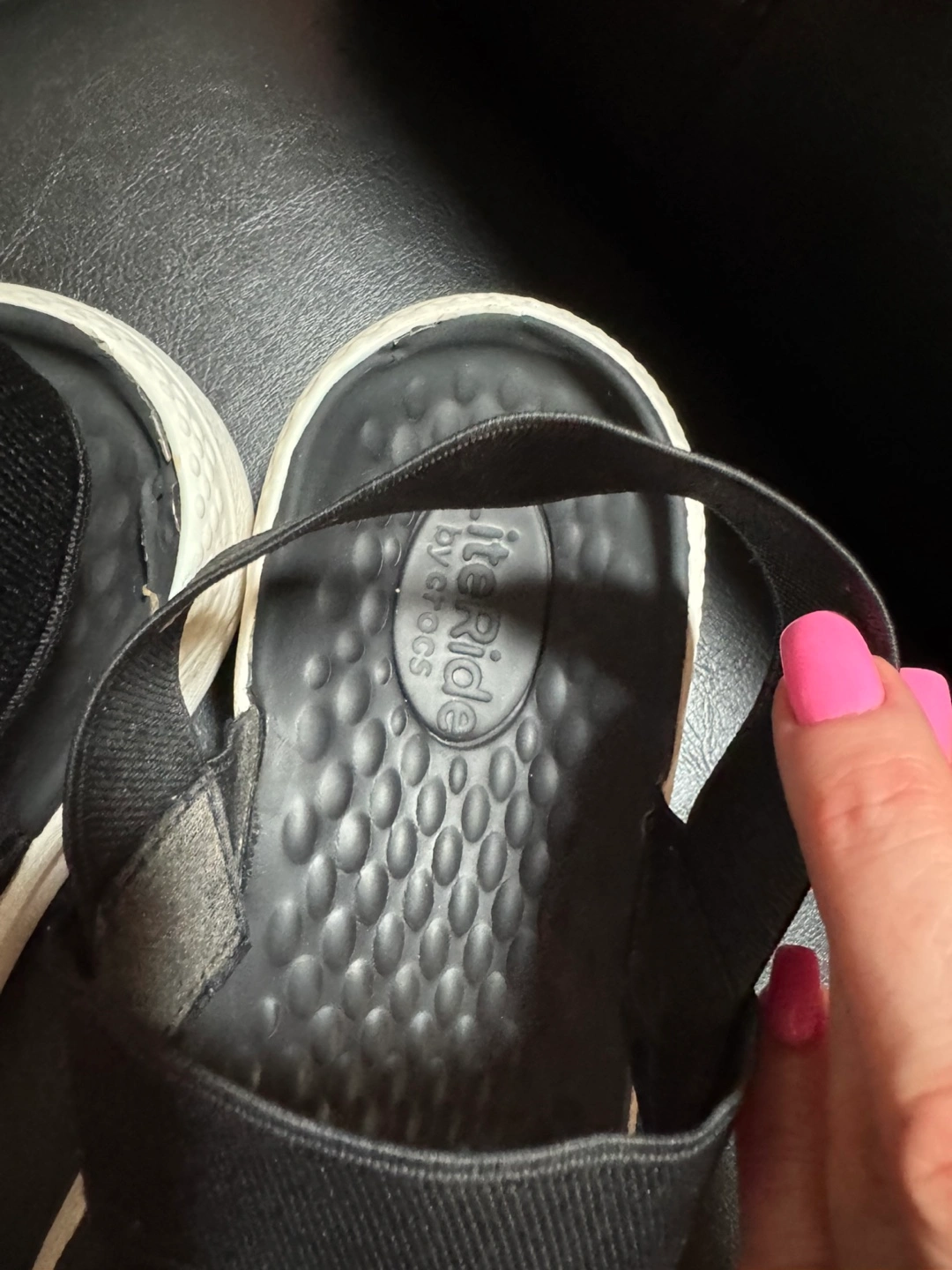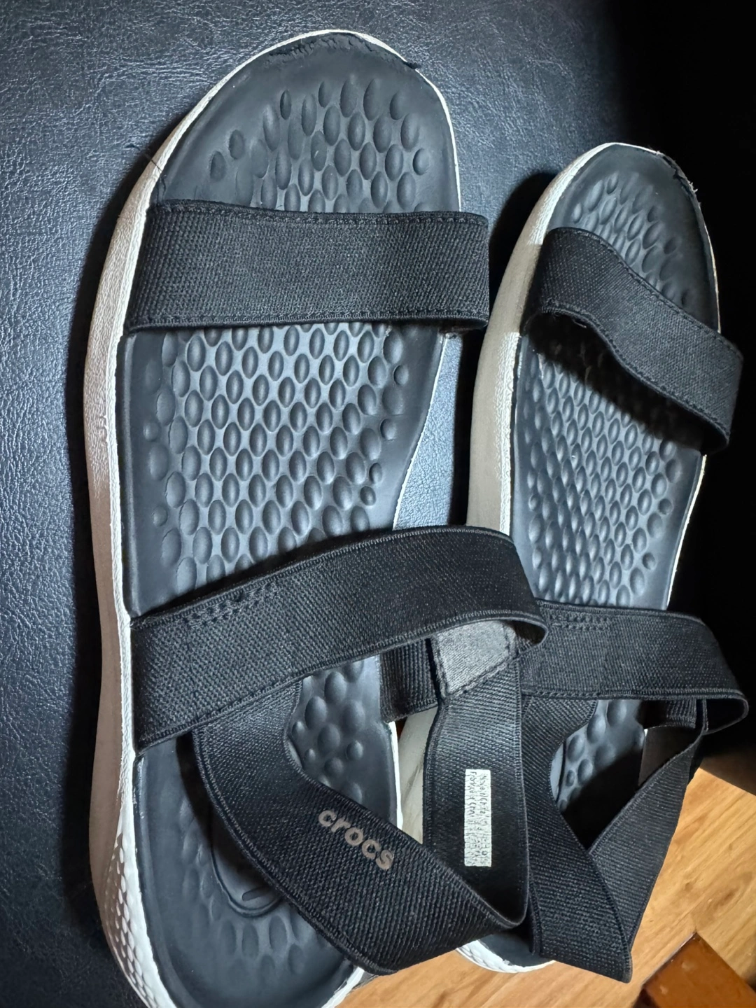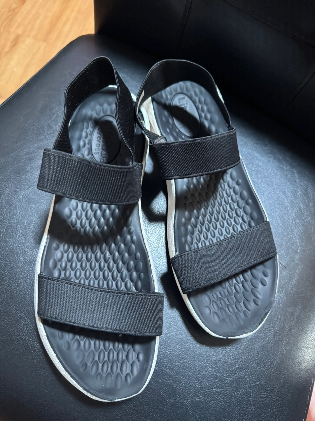 Black sandals. White sole. Textured footbed. Multiple straps, comfortable.