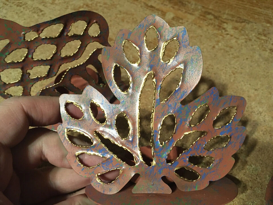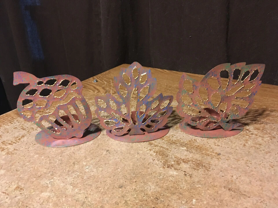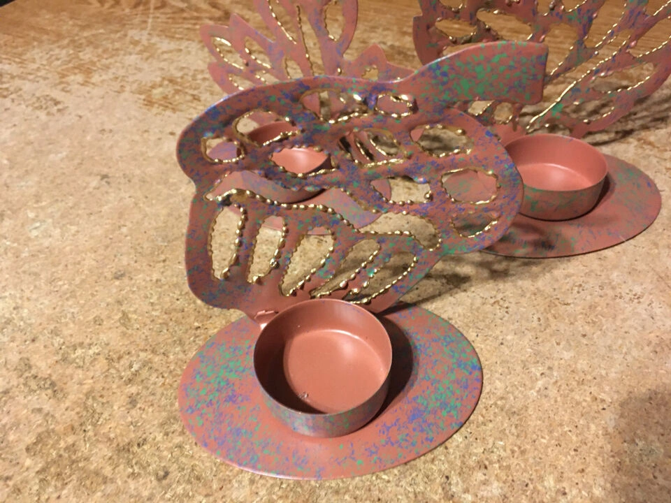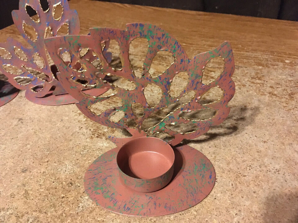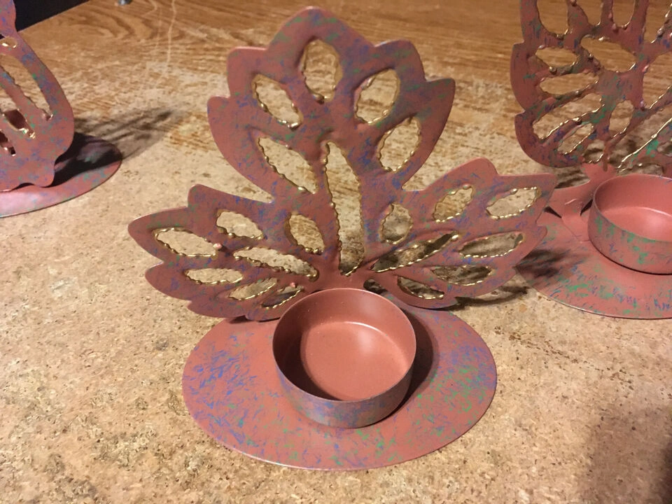 Decorative metal candle holders. Leaves feature cut-out details. Each candle holder contains a cup-shaped spot for a candle. They could be just what you need to create a cozy atmosphere in your space. pick up at house