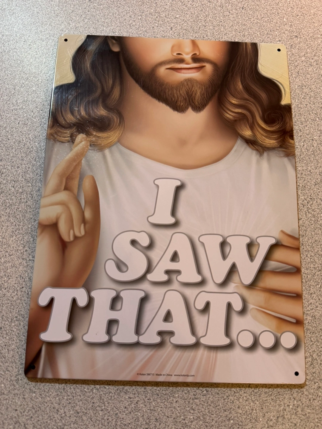 Metal sign with an image of Jesus. Includes the words "I SAW THAT" on the front. Would be a nice addition to a room.