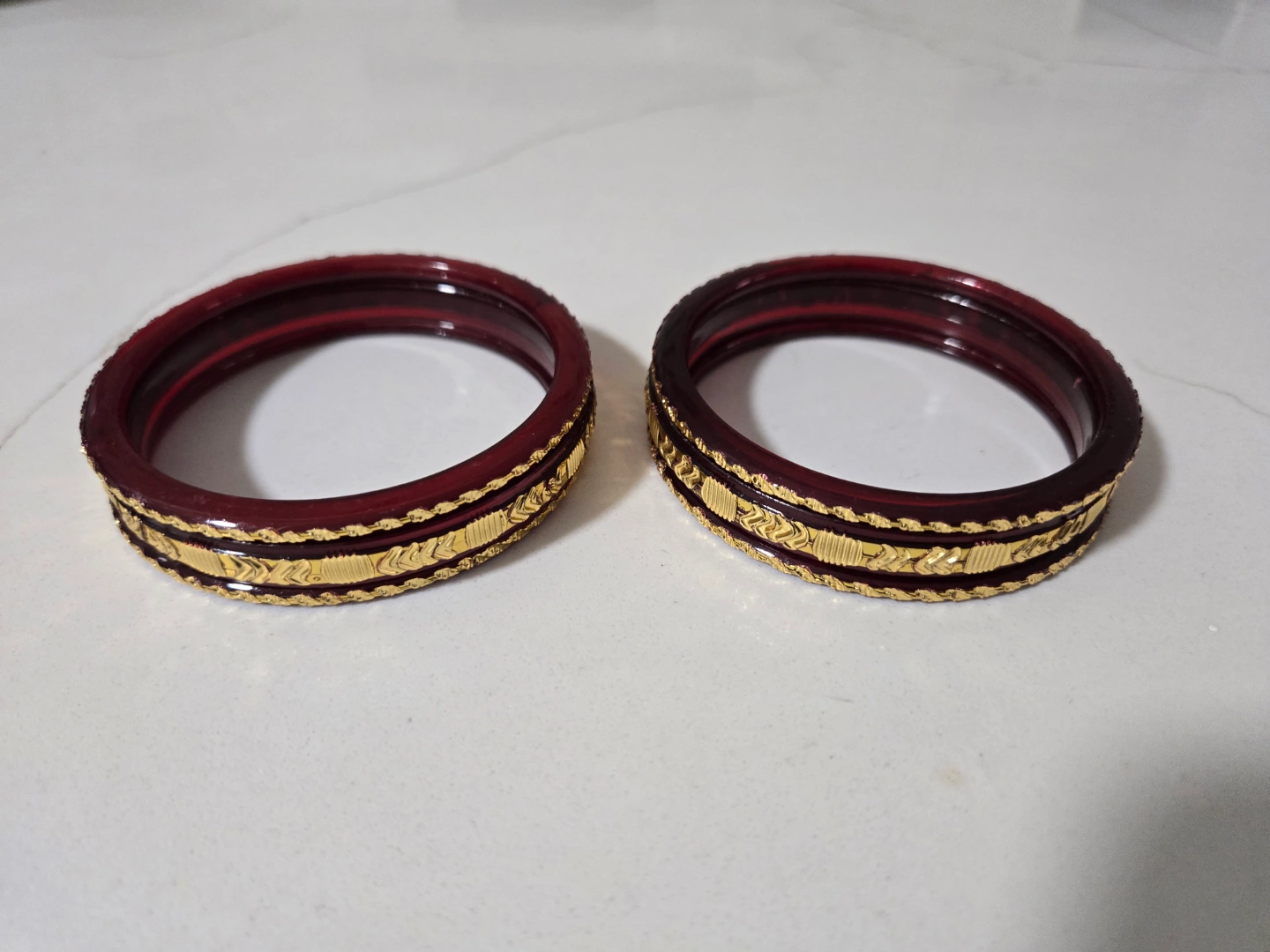 129Pair of bangles. Maroon color. Gold embellishments. The bangles can add a unique touch to any outfit.