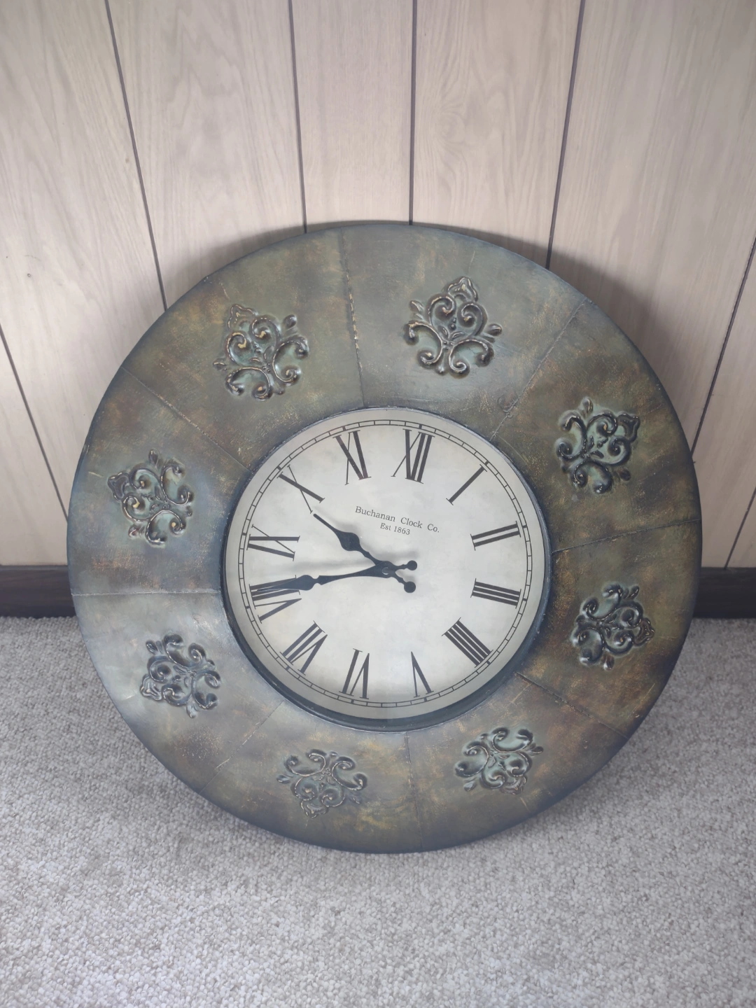 Round wall clock. Features a metallic finish. Ornamental accents around the clock face. A great way to keep track of the time in any room. 24 inches wide.