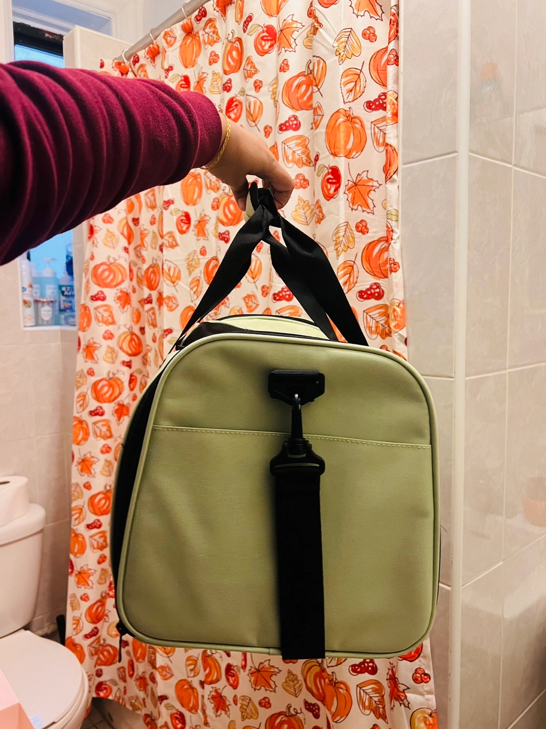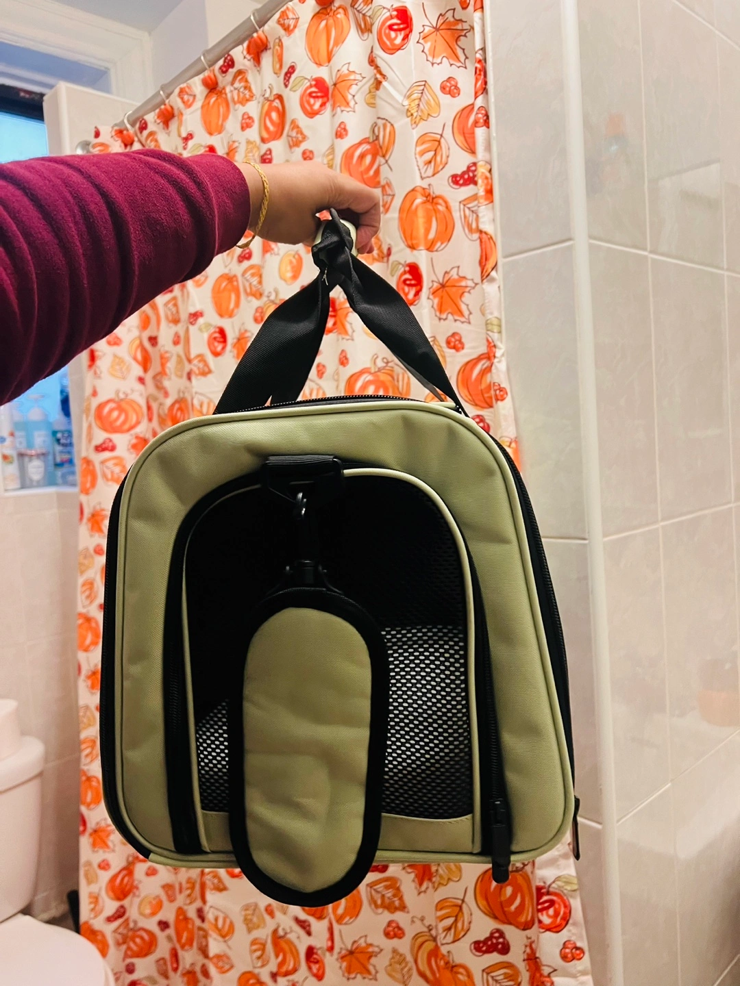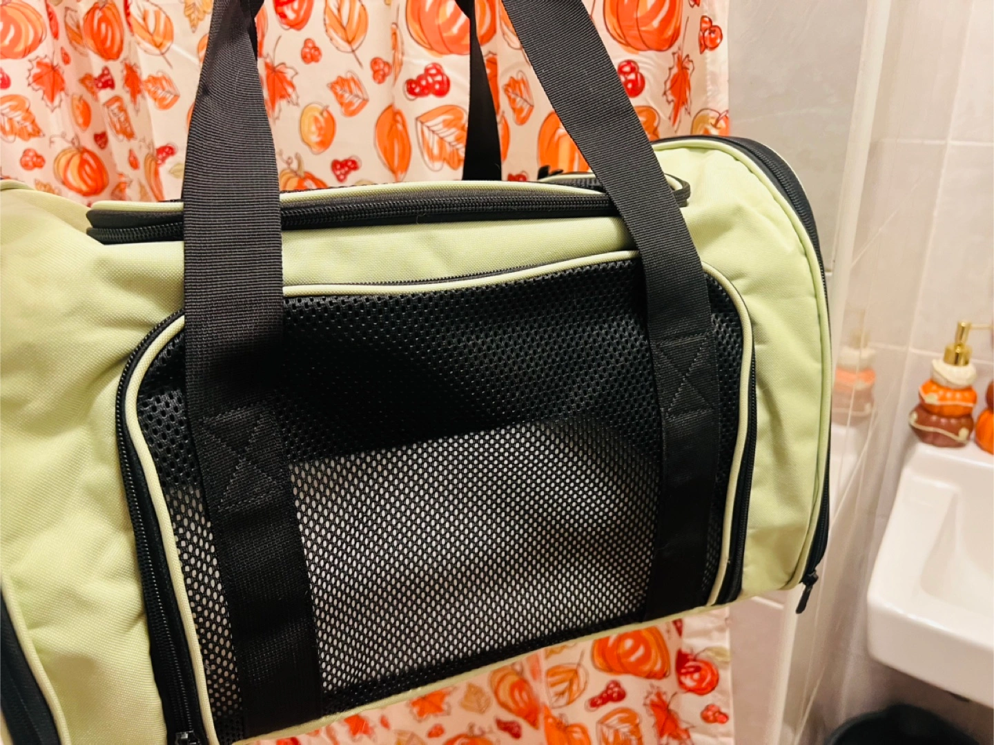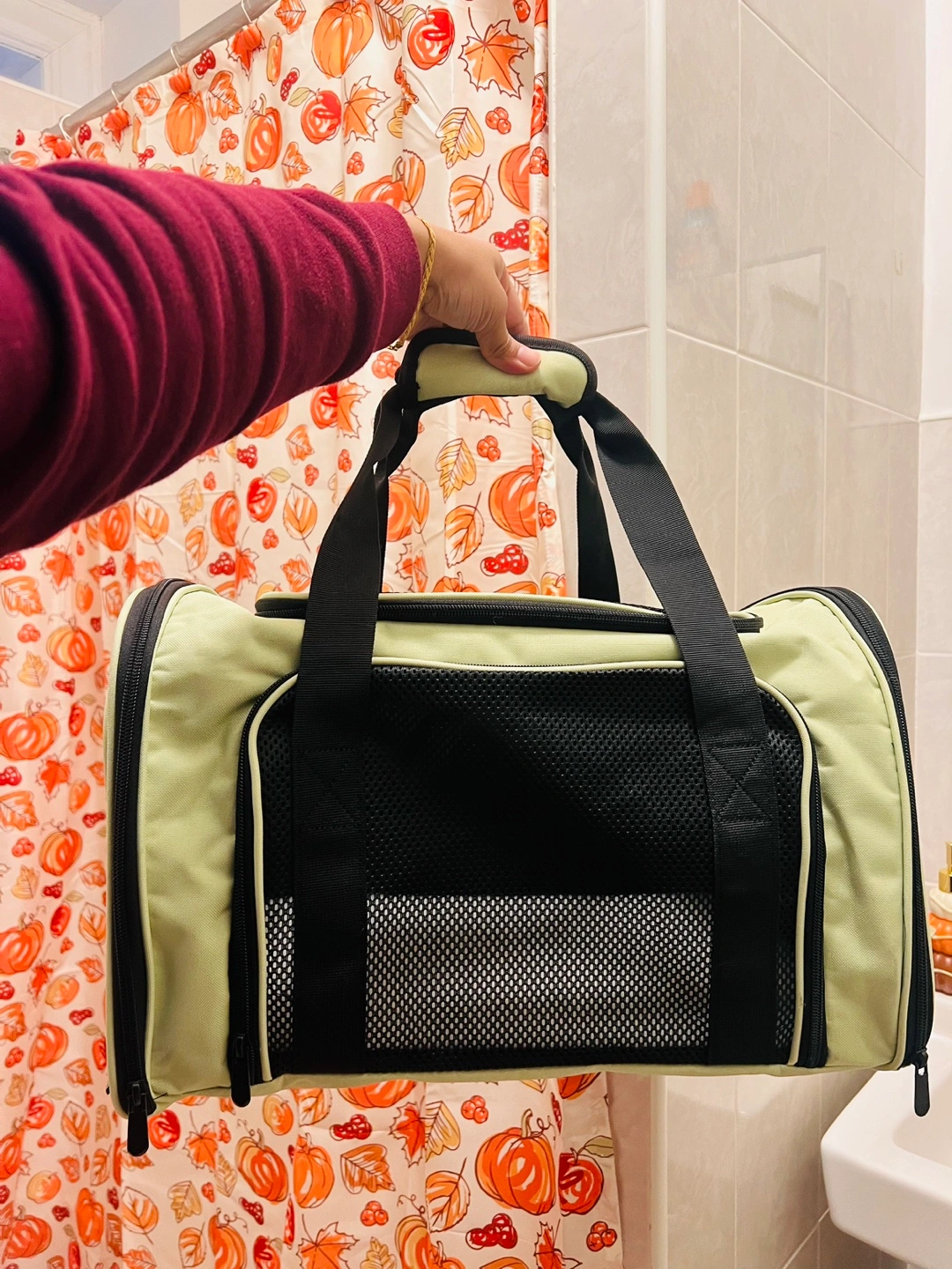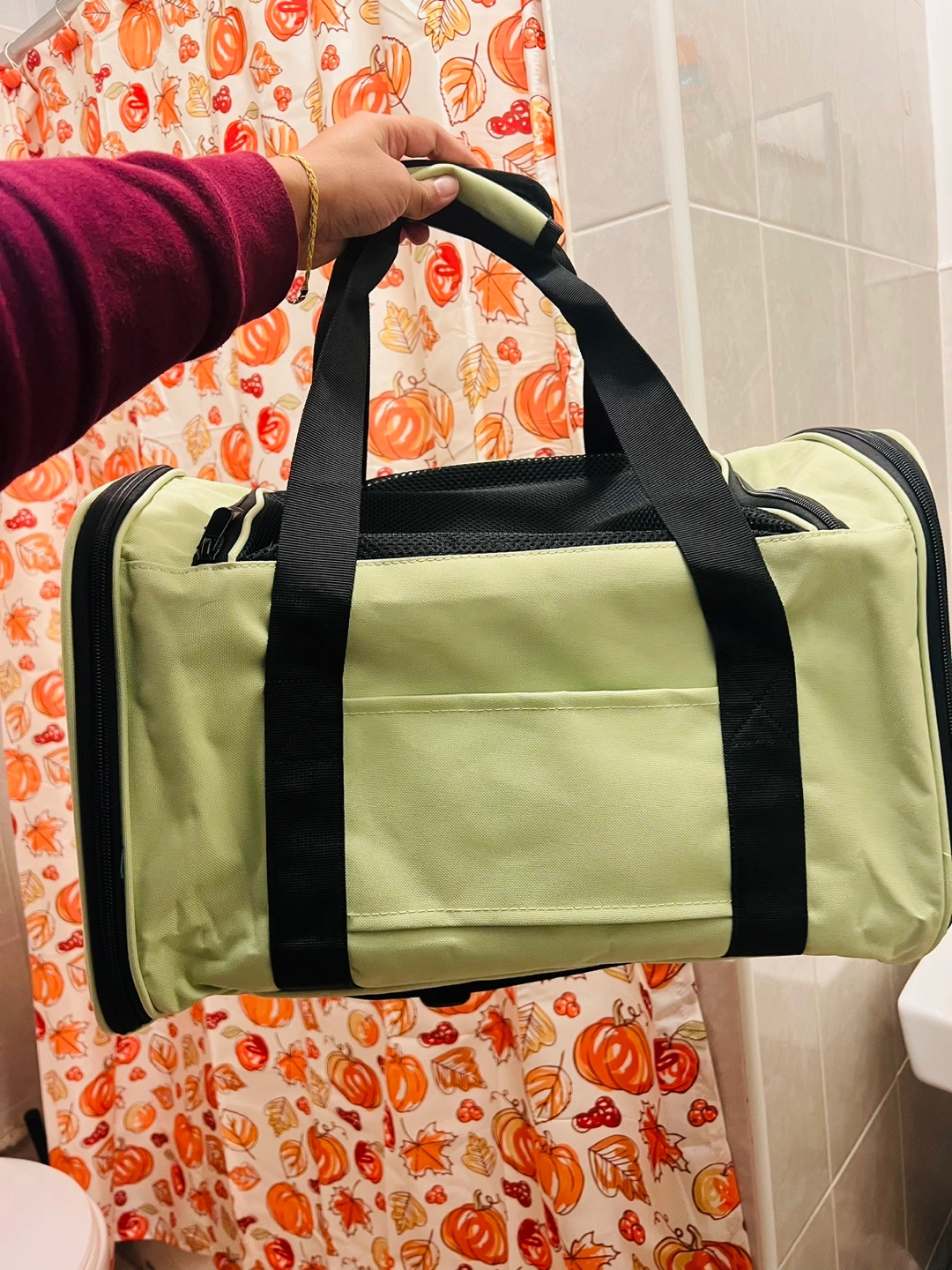Light green pet carrier. Features mesh ventilation and black accents. Top handle for easy carrying. Zipper closure. Good for small dogs or cats.
