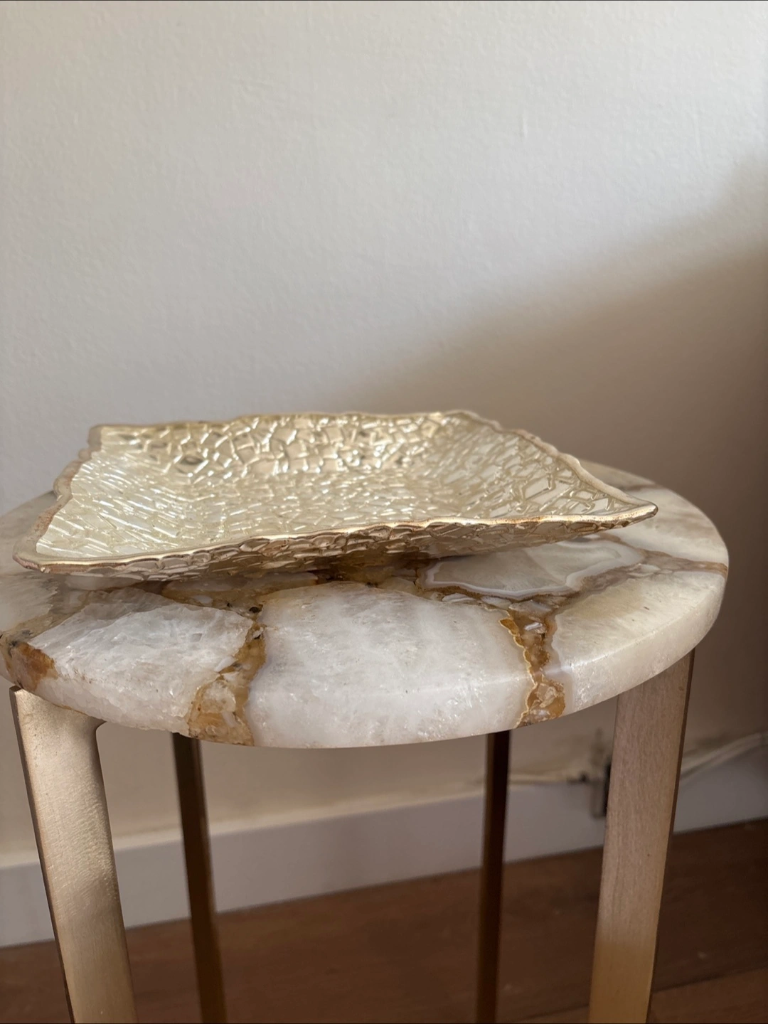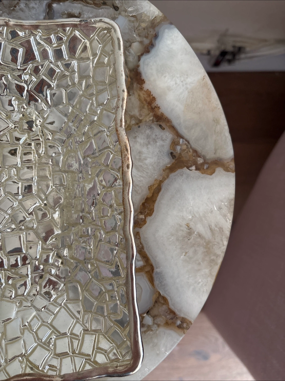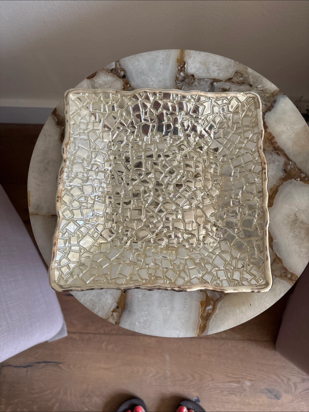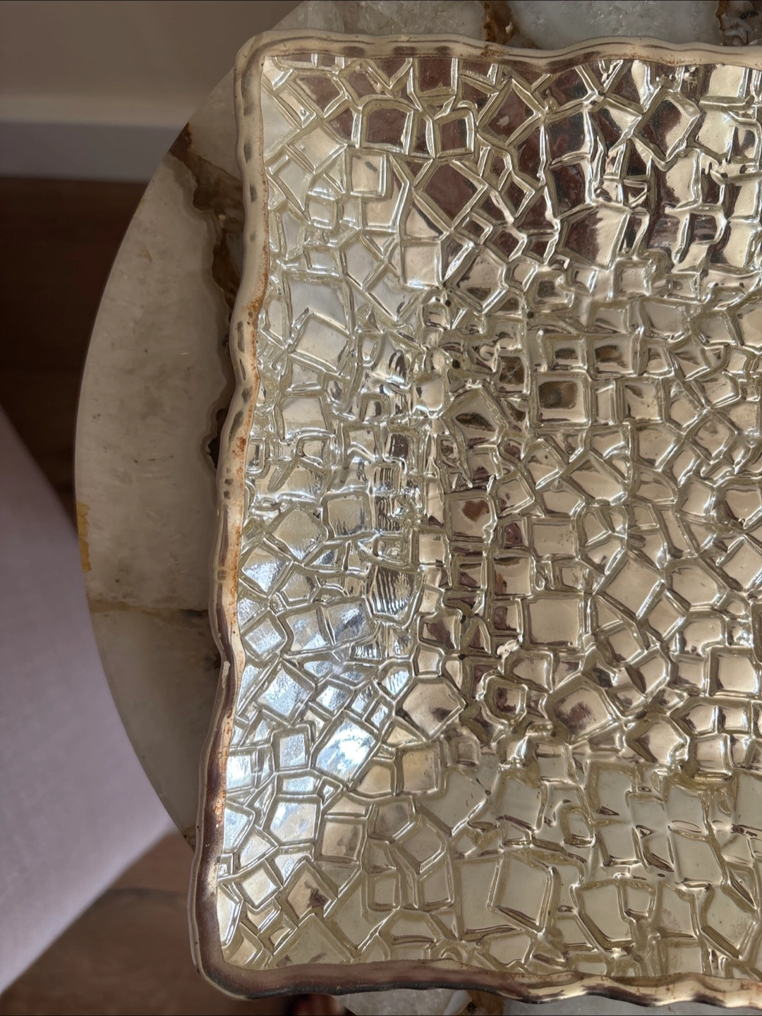 347Square shaped tray. Features a mirrored mosaic design. Has wavy edges with a silver rim. Consider placing this tray on your coffee table to create a sense of tranquility. Please note it does have some discoloration on the side but because of the design it blends in