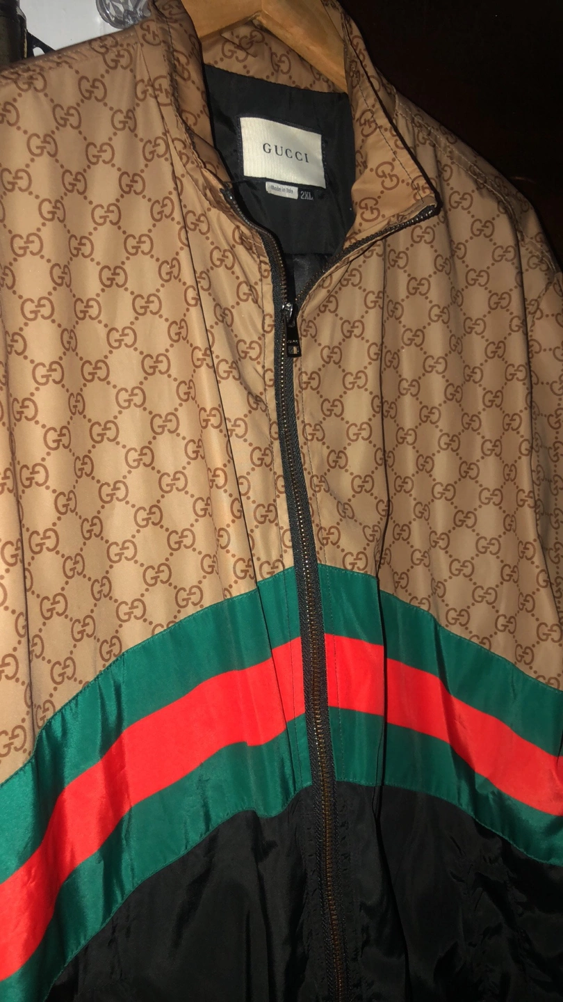 75The Gucci jacket displays a pattern on the front with a color block design near the waist. It has a zipper closure. Consider wearing it on a stroll through the park for a calming experience. used