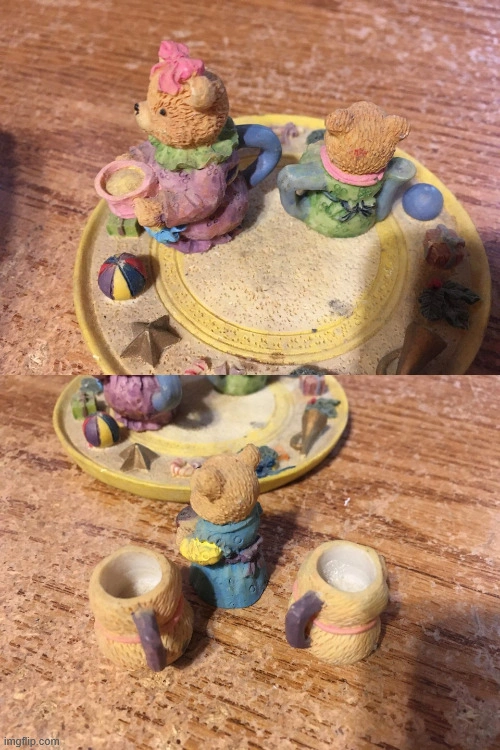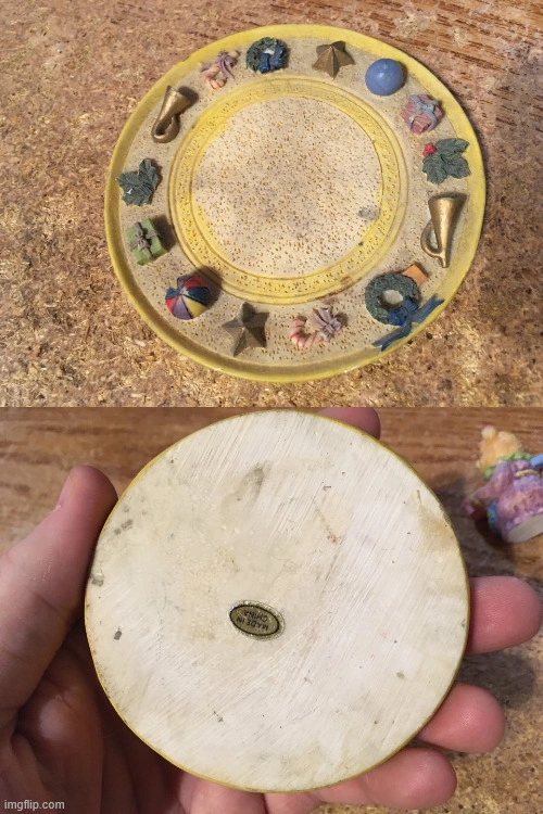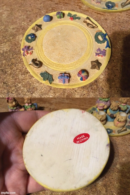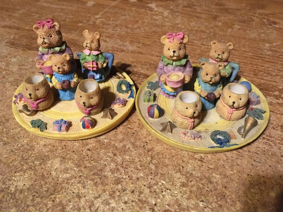 Figurines feature teddy bears on decorative plates. Bears hold gifts and treats. Plates are adorned with festive decorations. It can be used as a unique decoration to create a cozy ambiance. one of the plates coaster-like thing has marks on it. pick up at house