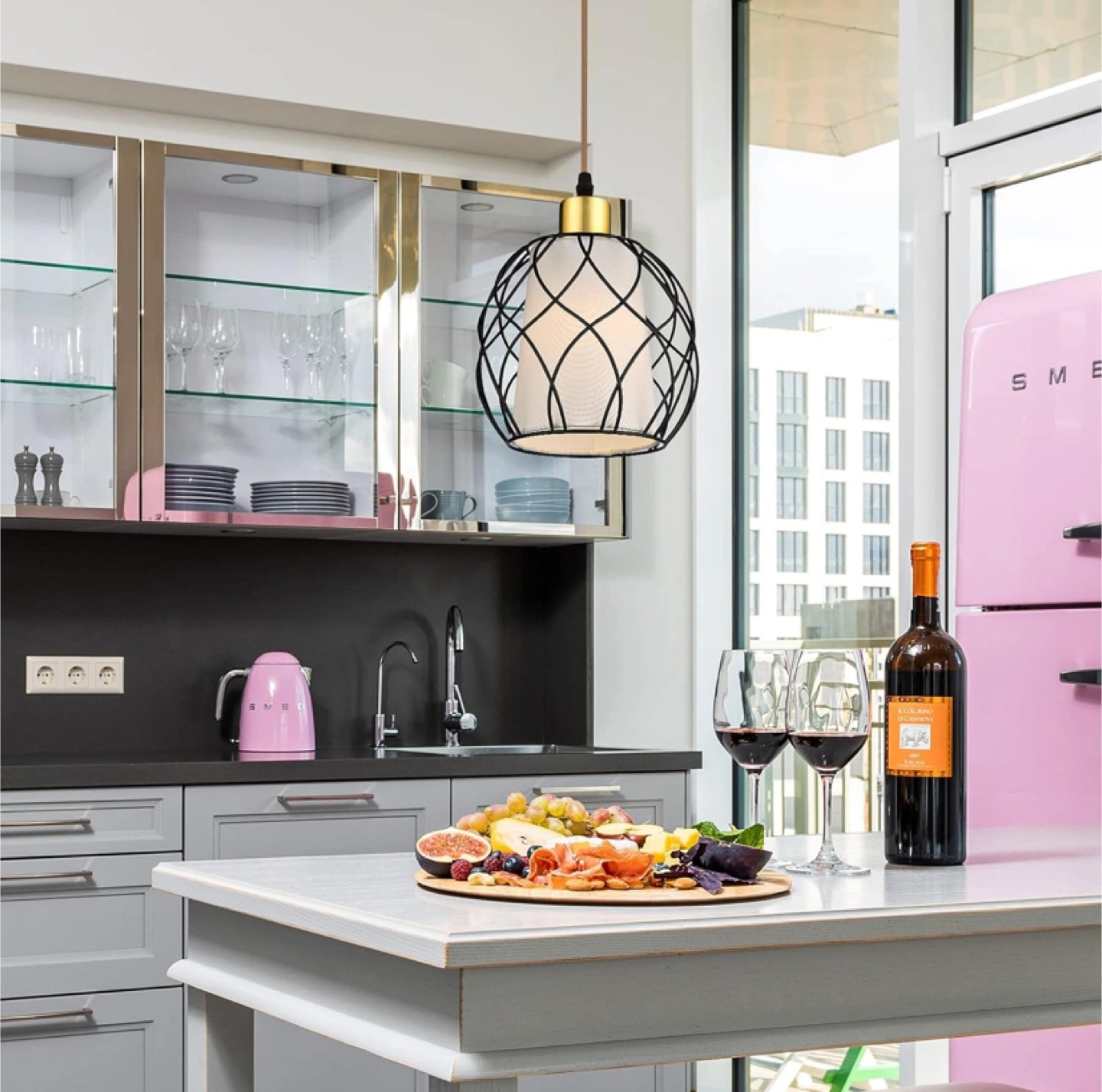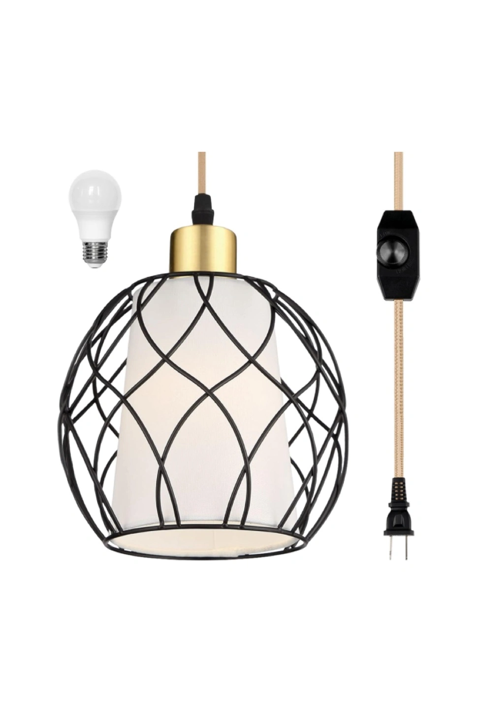 Modern pendant light with a geometric wire frame. Features a fabric shade. Includes a dimmable switch for brightness control. Perfect for illuminating a cozy corner while enjoying some wine.