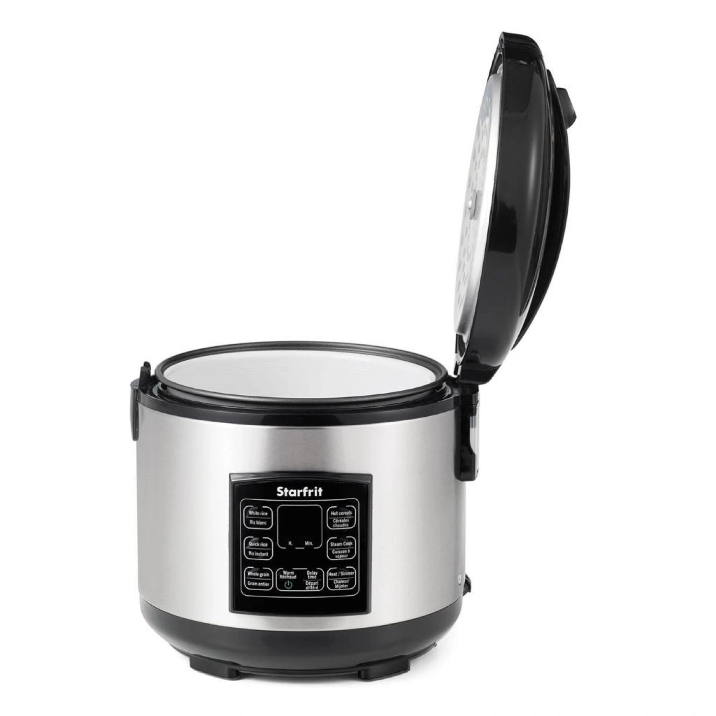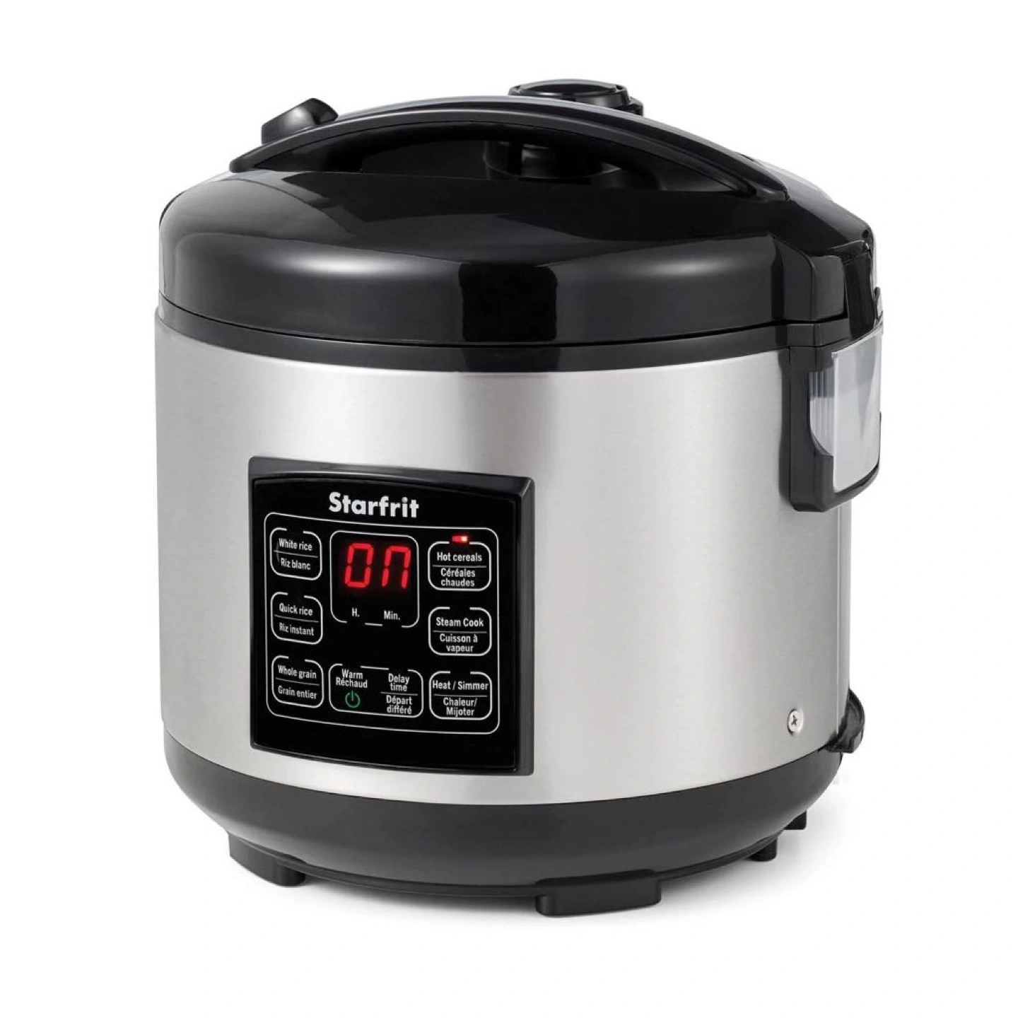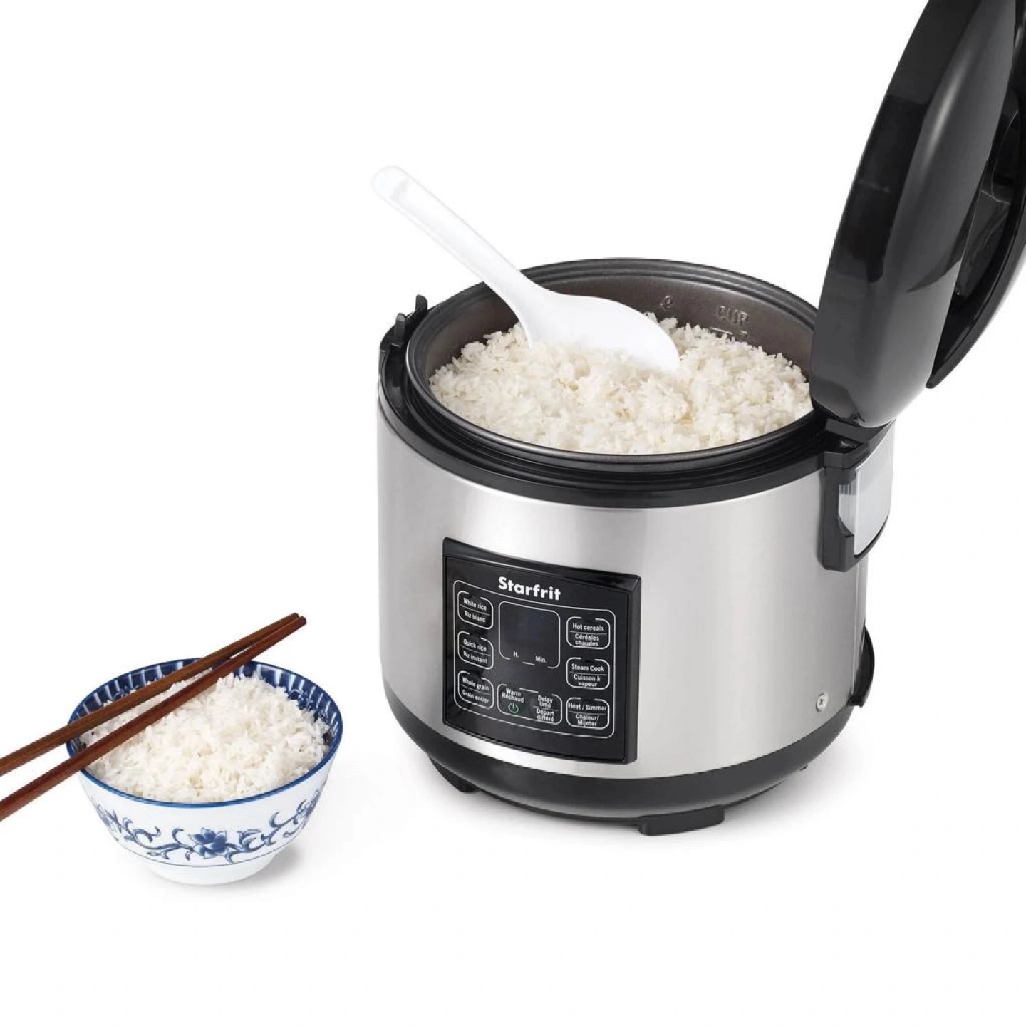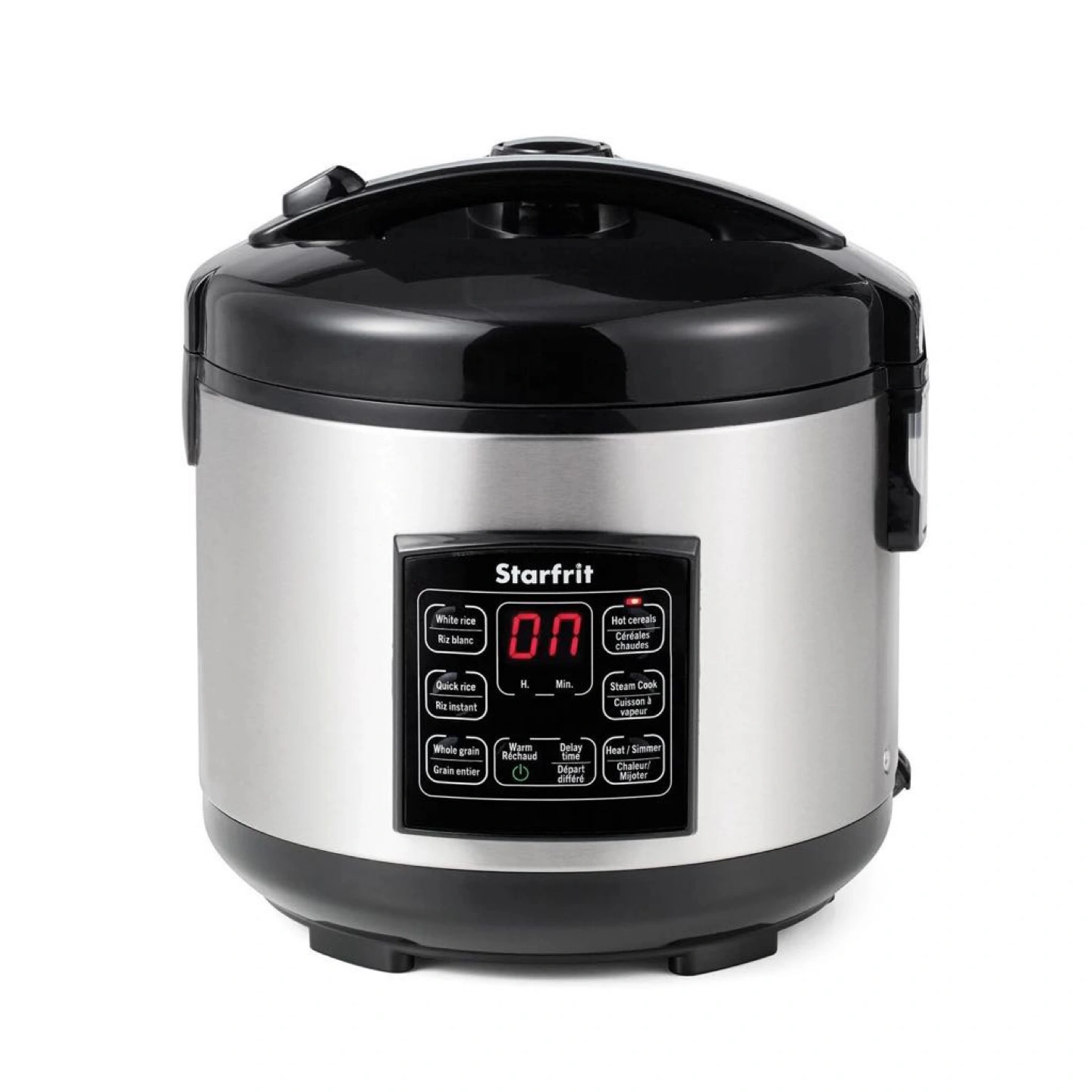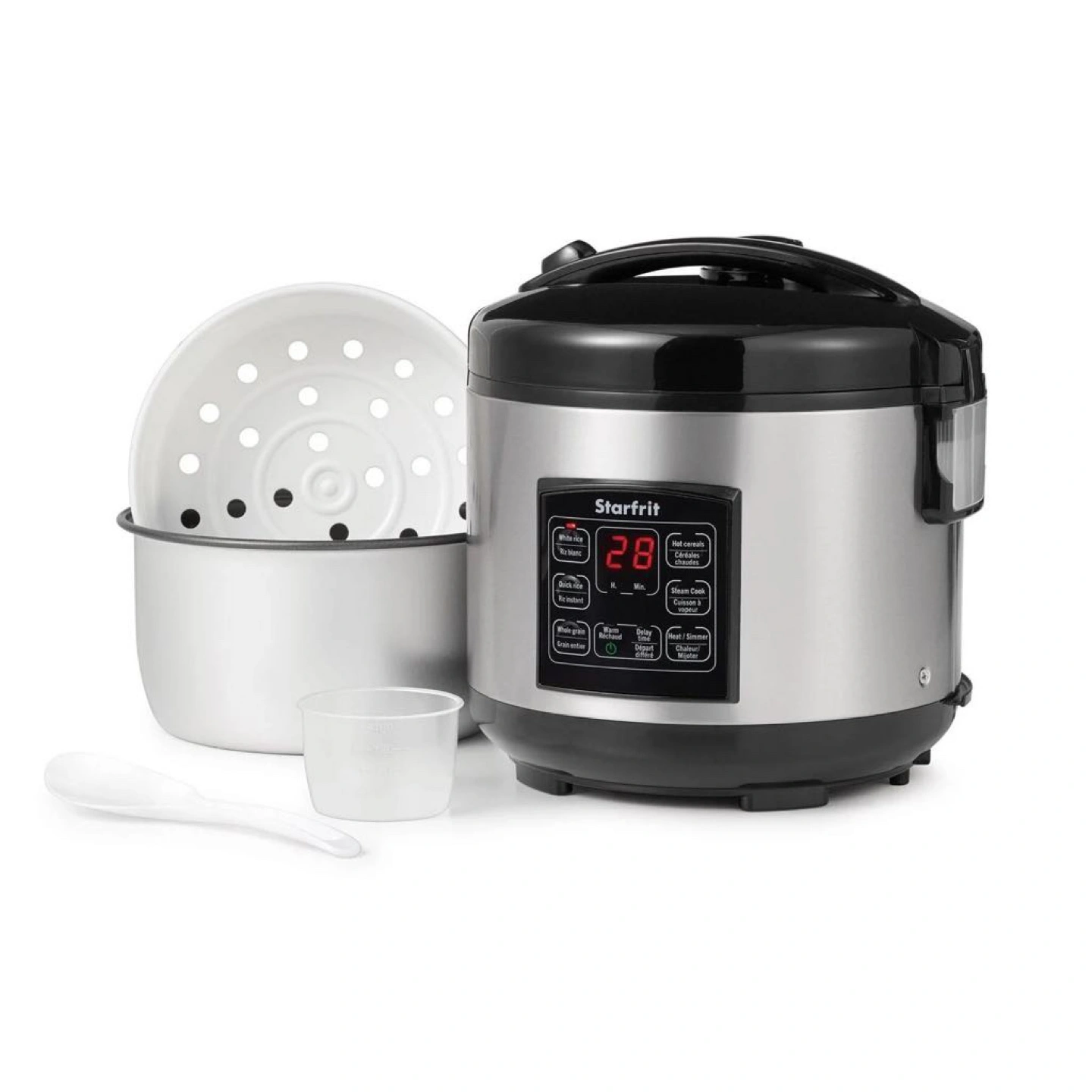 26Silver and black rice cooker. Features a digital display and several cooking functions. Comes with multiple accessories. Enjoy a relaxing meal with this convenient appliance.