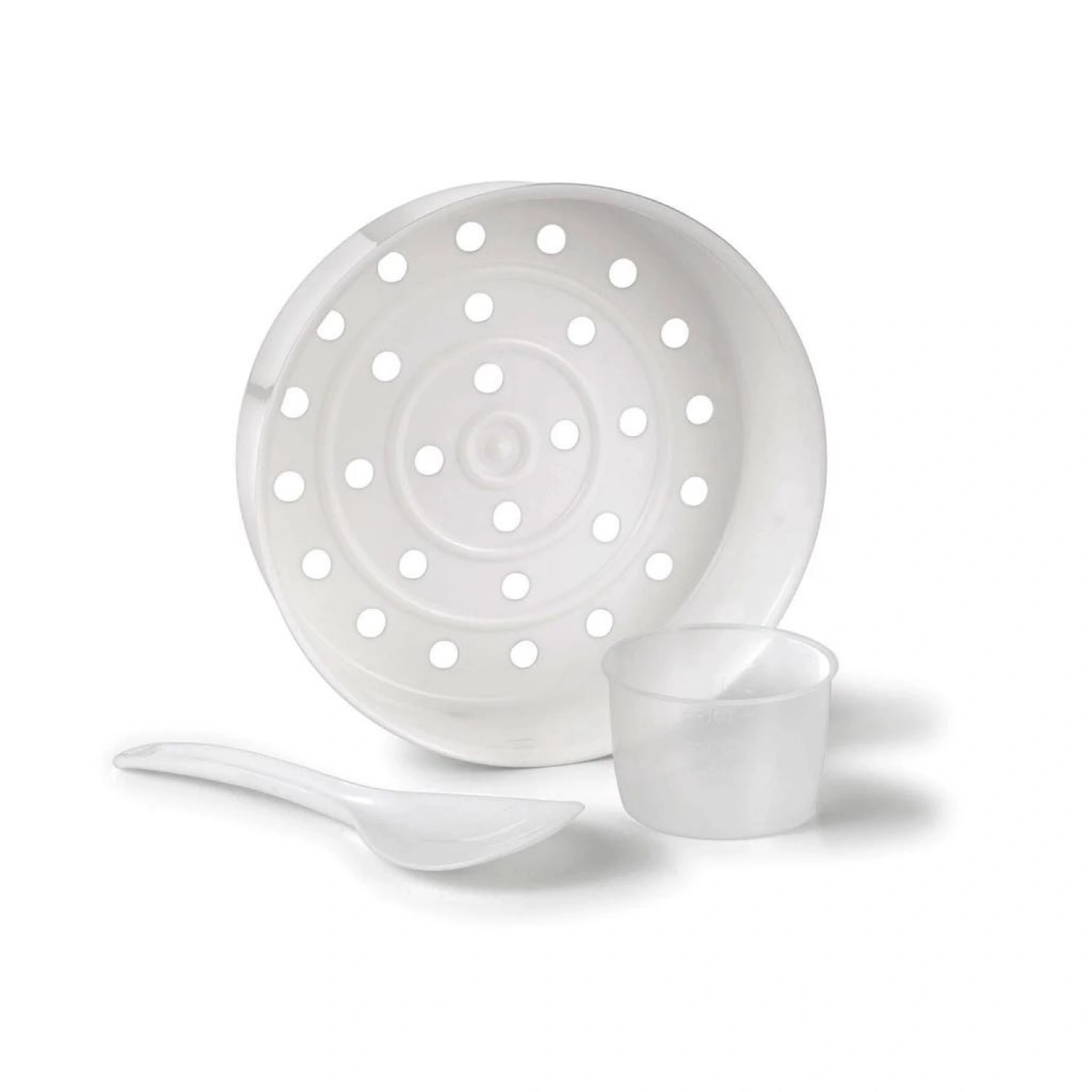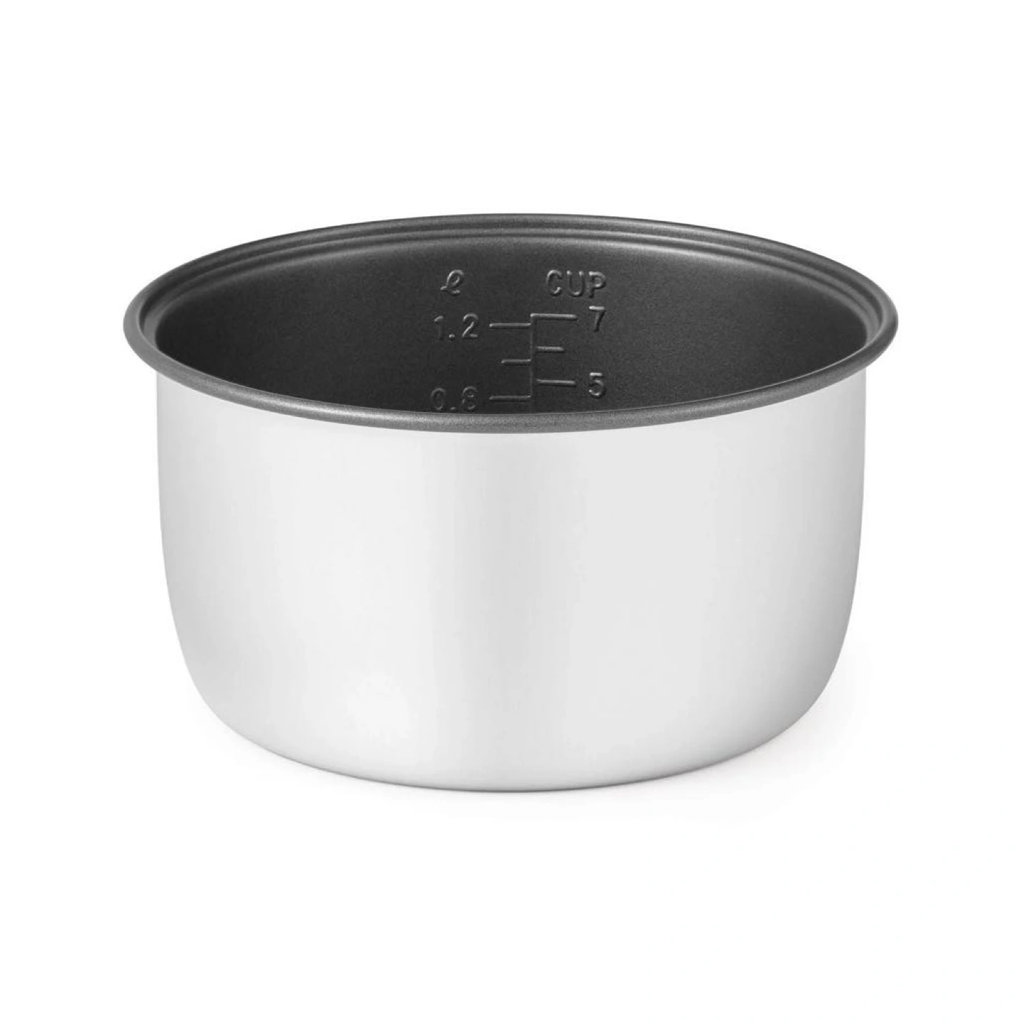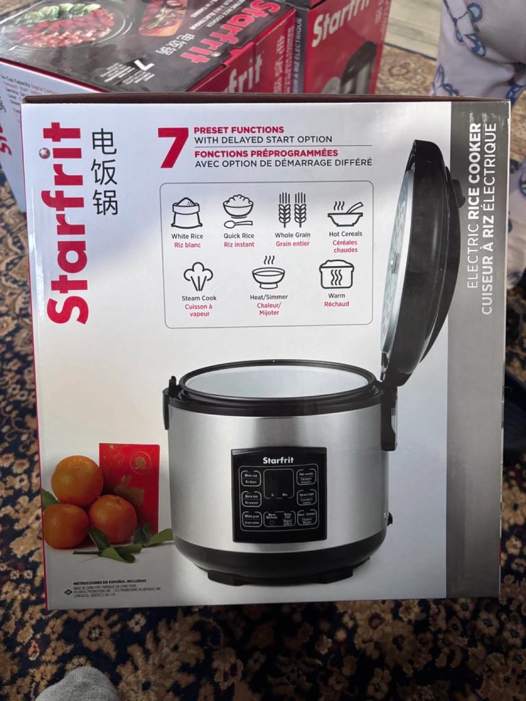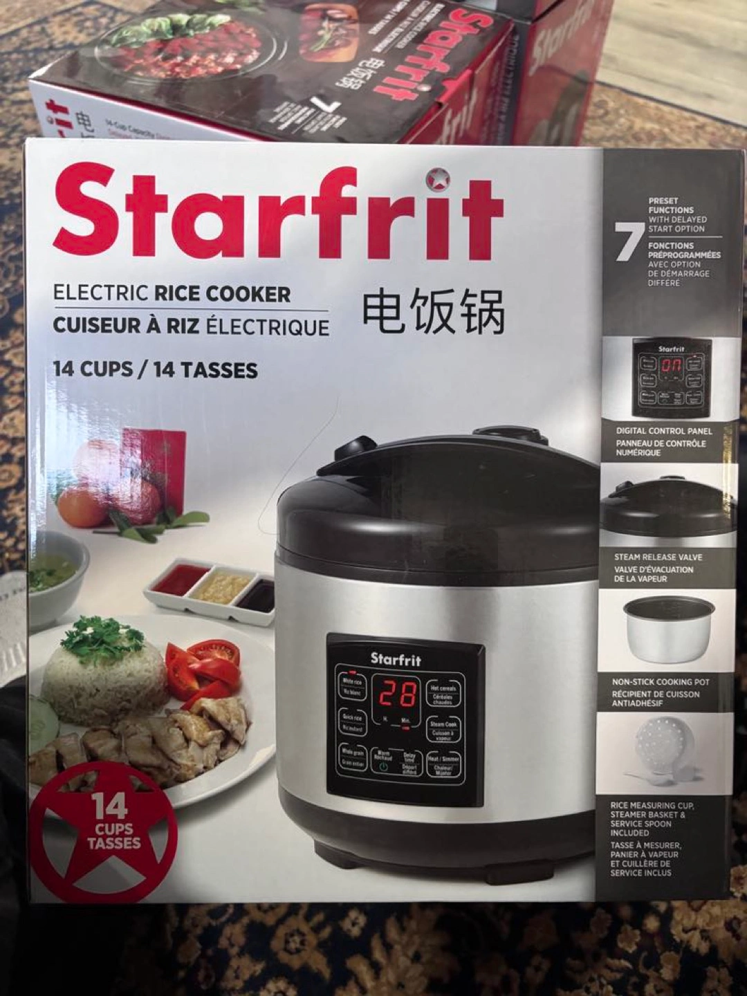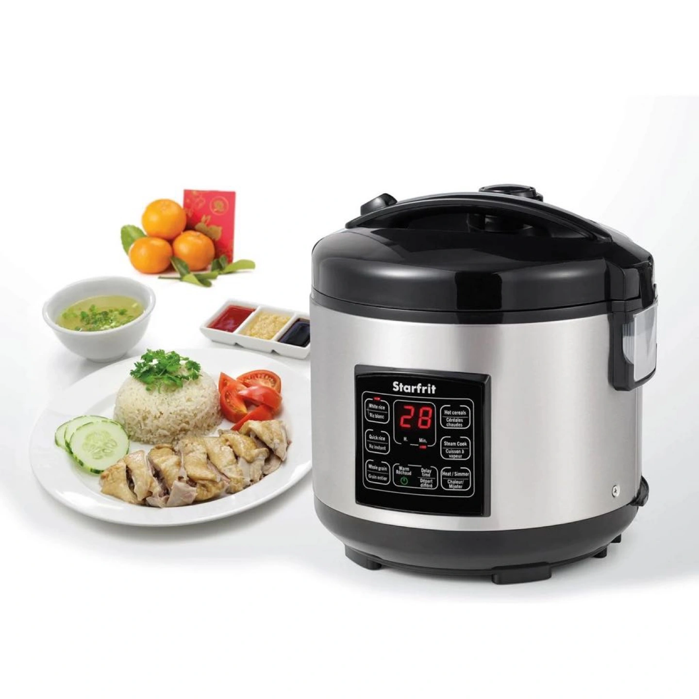26Silver and black rice cooker. Features a digital display and several cooking functions. Comes with multiple accessories. Enjoy a relaxing meal with this convenient appliance.