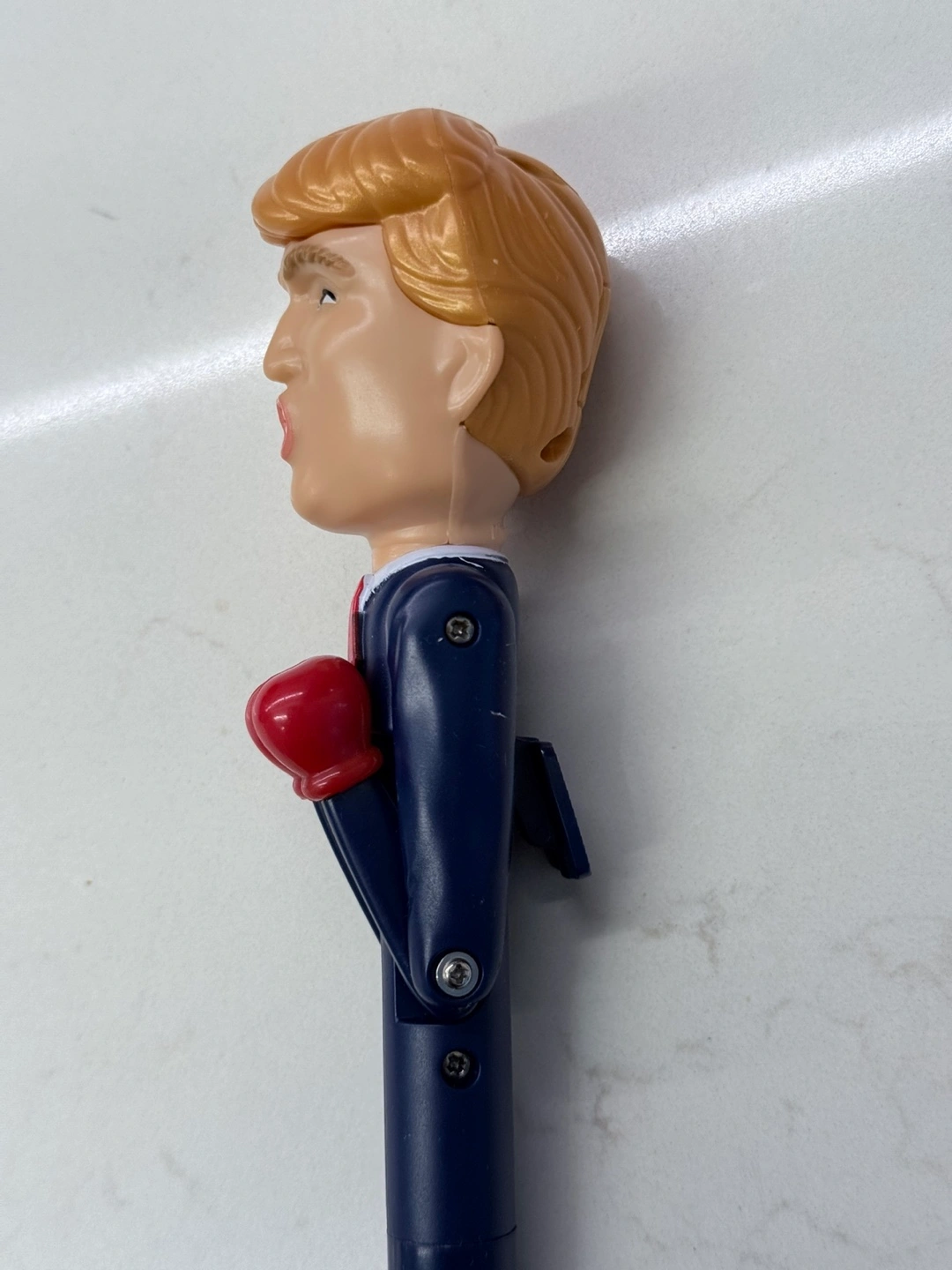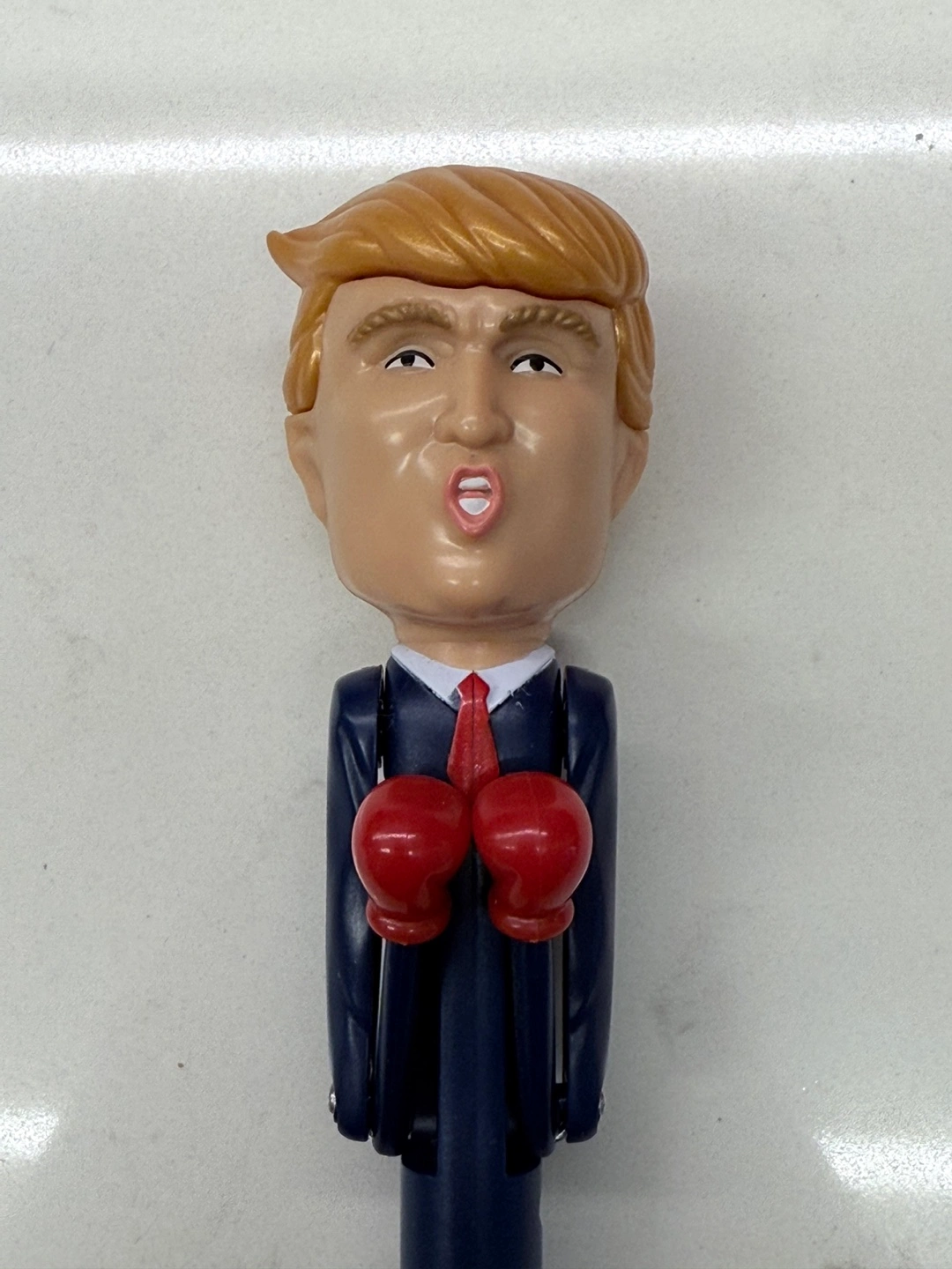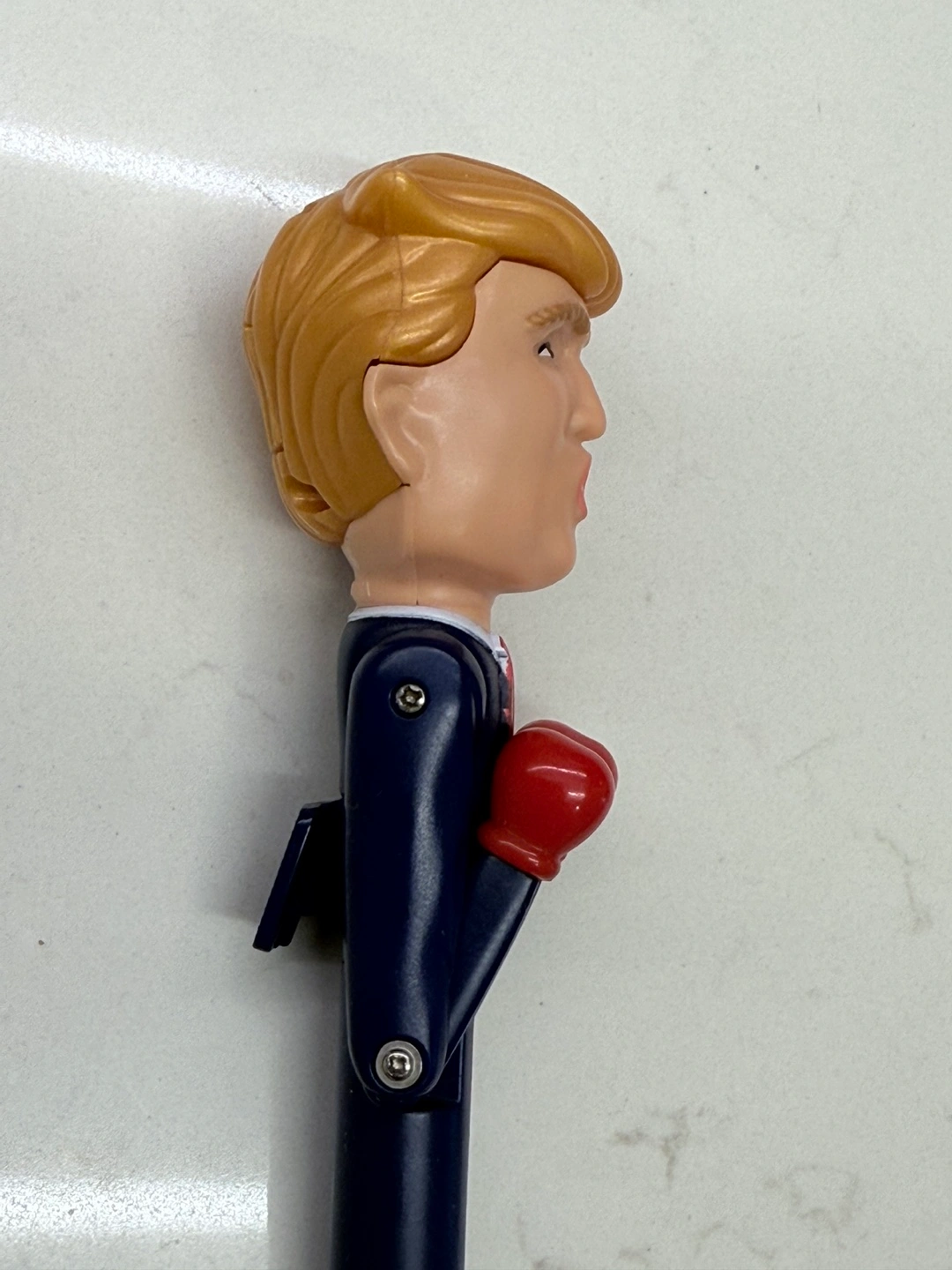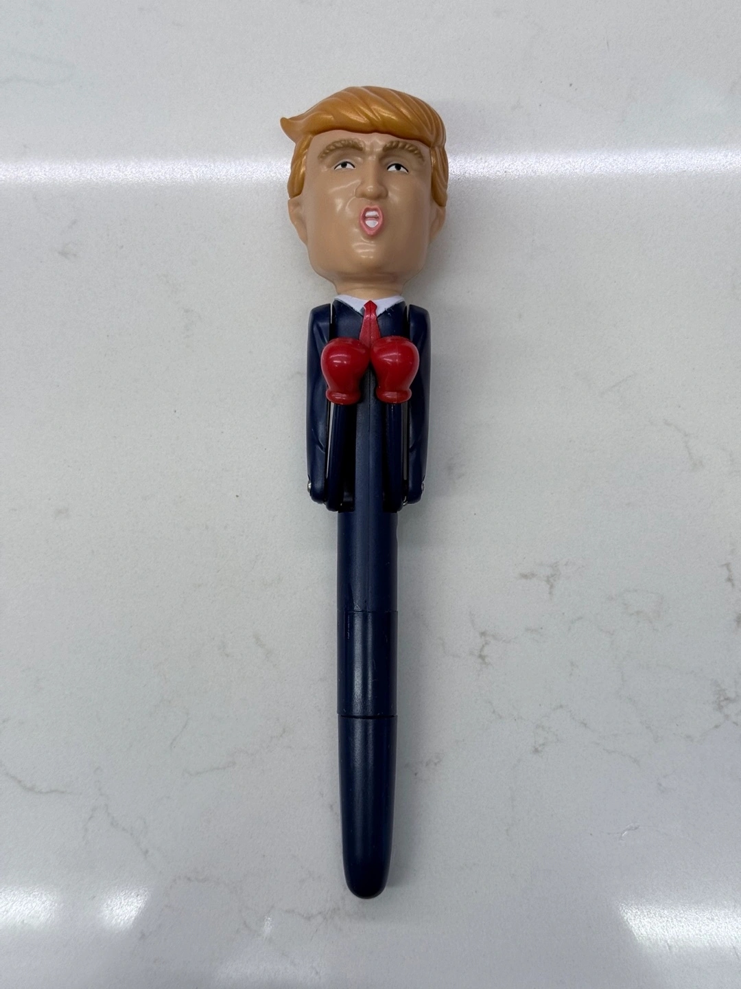 1000+Features a Donald Trump big head Pen. Includes a dark blue body with red boxing gloves. Hilarious to listen to all his tag lines when pressing buttons on the back, with a punch!! Can be used for fun ๐คฉ Probably worth something someday!! It is a pen too! 8โH x 1 1/2โ W at head