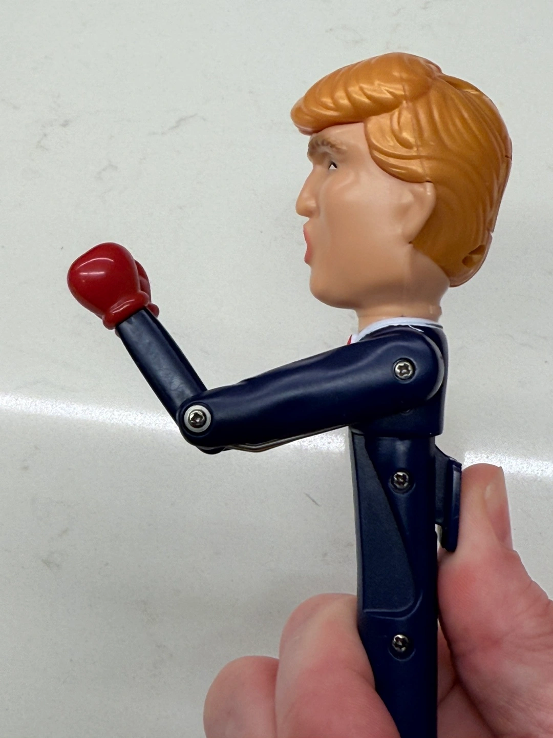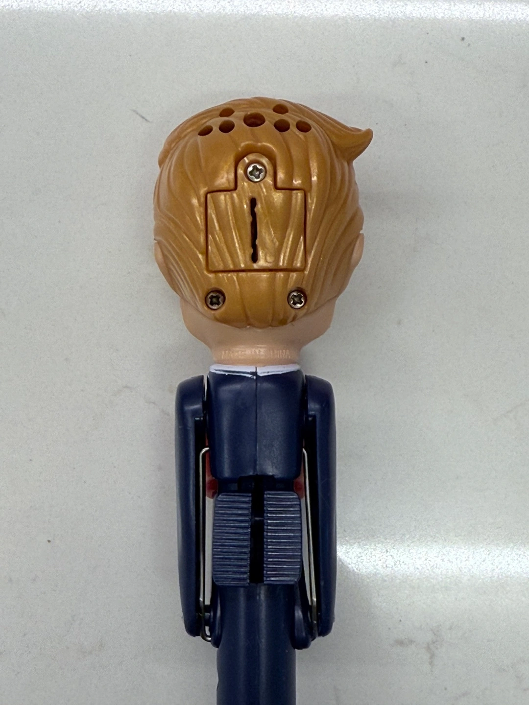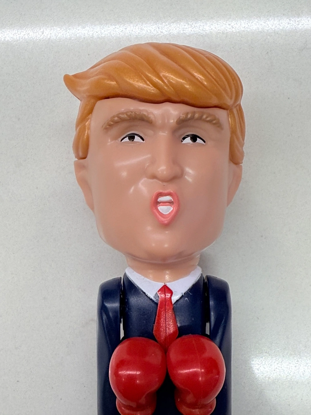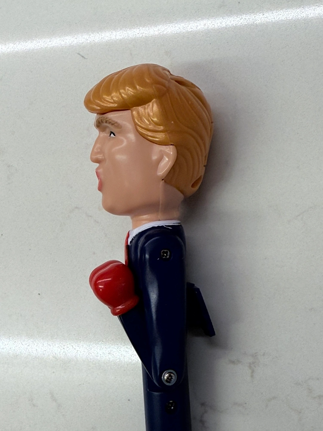 1000+Features a Donald Trump big head Pen. Includes a dark blue body with red boxing gloves. Hilarious to listen to all his tag lines when pressing buttons on the back, with a punch!! Can be used for fun ๐คฉ Probably worth something someday!! It is a pen too! 8โH x 1 1/2โ W at head