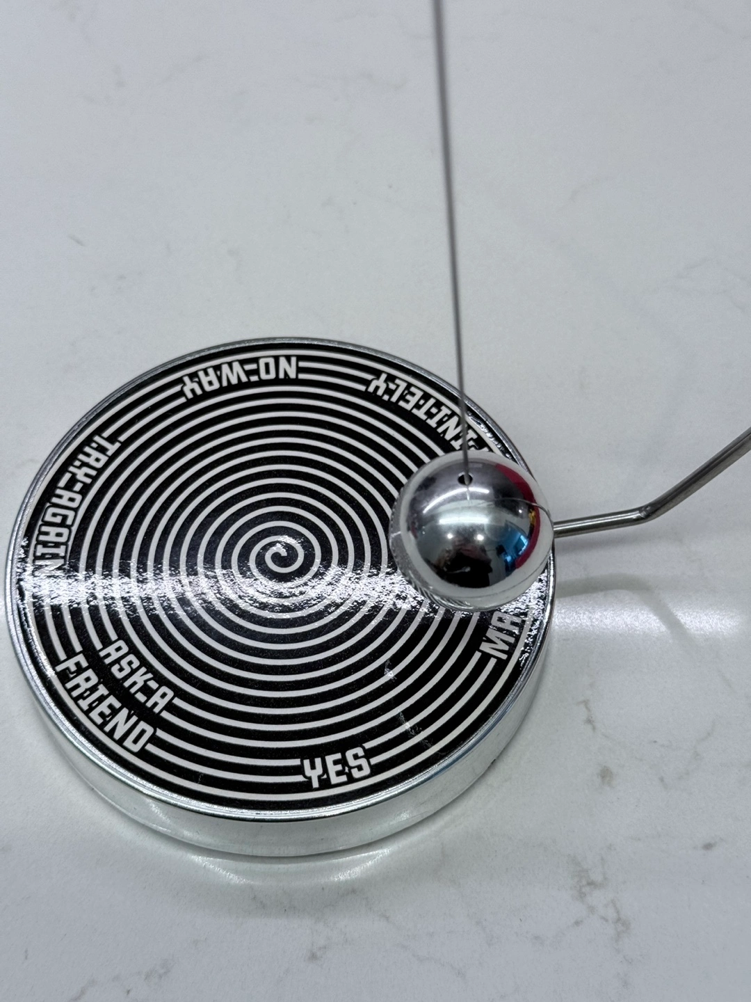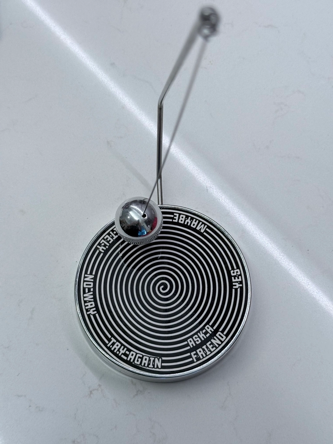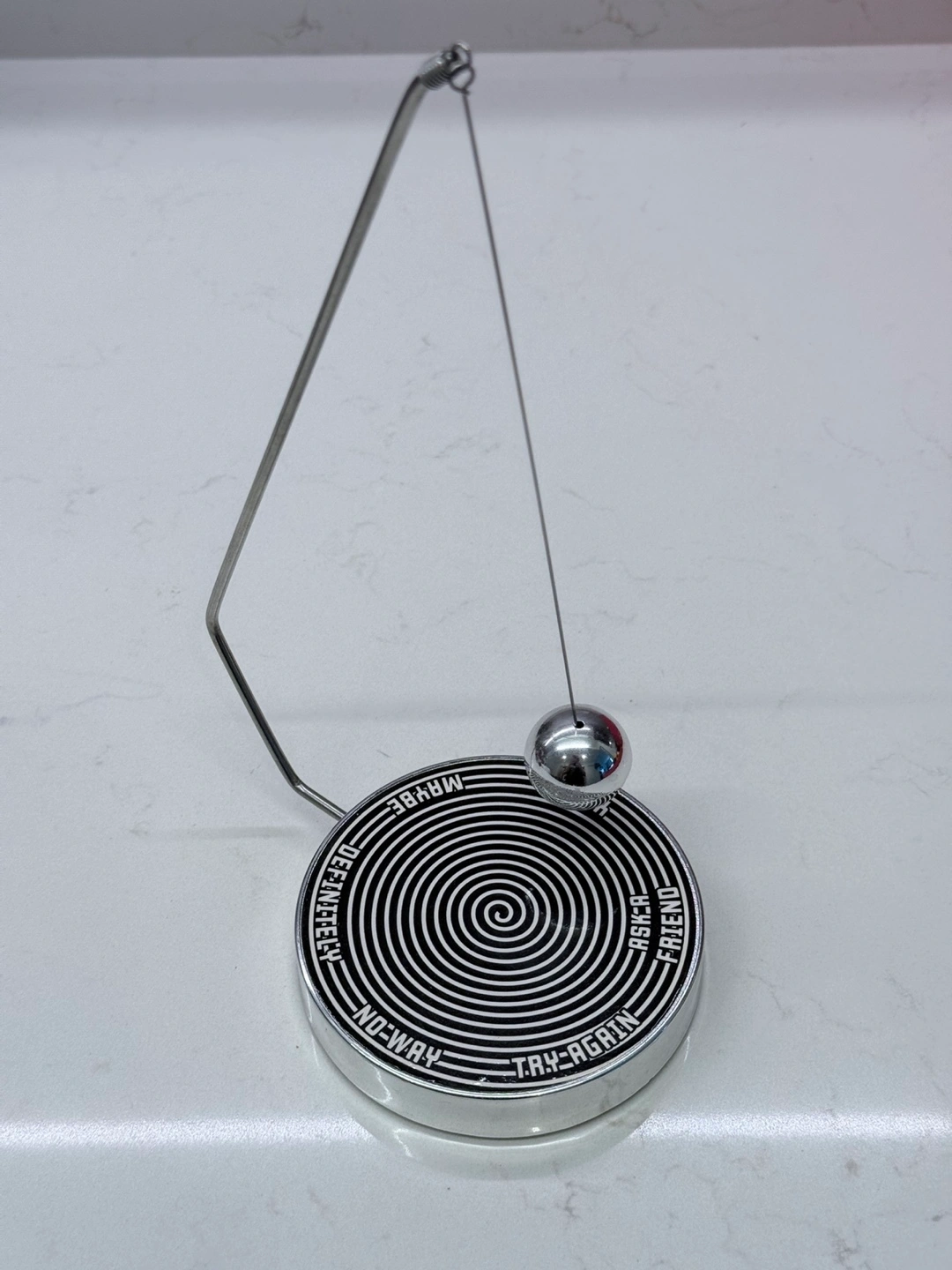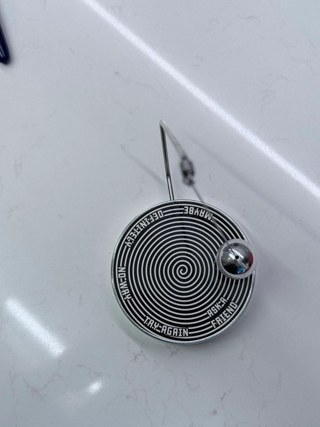 1000+Features a metal ball and a round base. The base has a spiral design with answers printed around the edge. Perfect for a moment of quiet reflection. Really fun to predict the future or answer questions!!