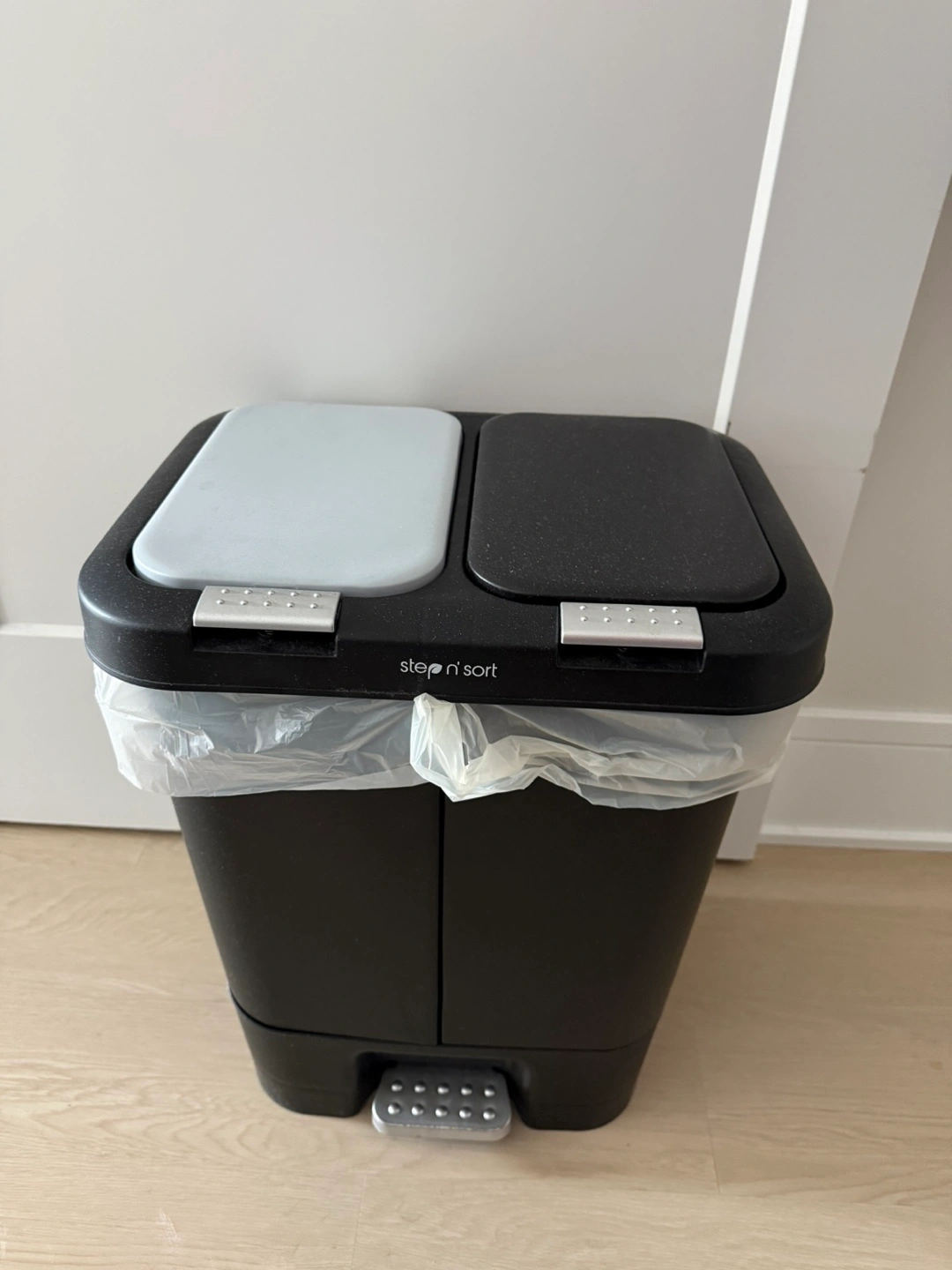 Black step trash can. Features two compartments. Includes step pedal and two removable lids. A trash can like this can help keep your space feeling clean and tidy.