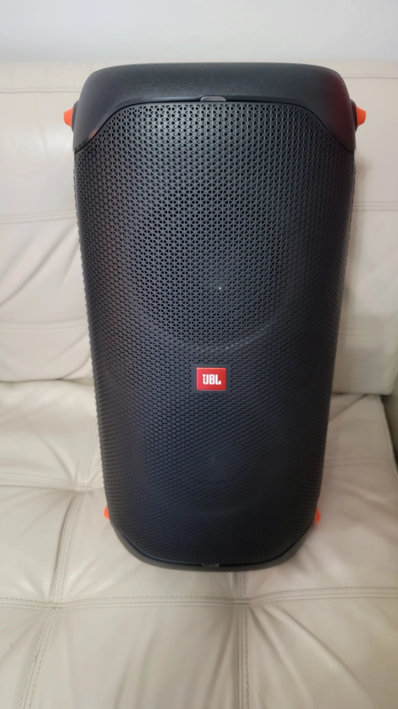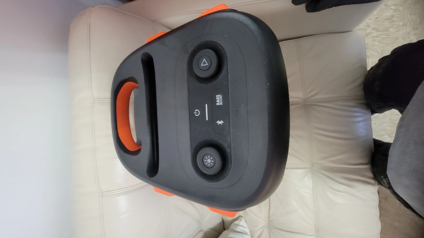 45Black speaker with orange accents. Rectangular shape with a mesh front. Top panel with multiple buttons. A wonderful addition to any home for music enjoyment.