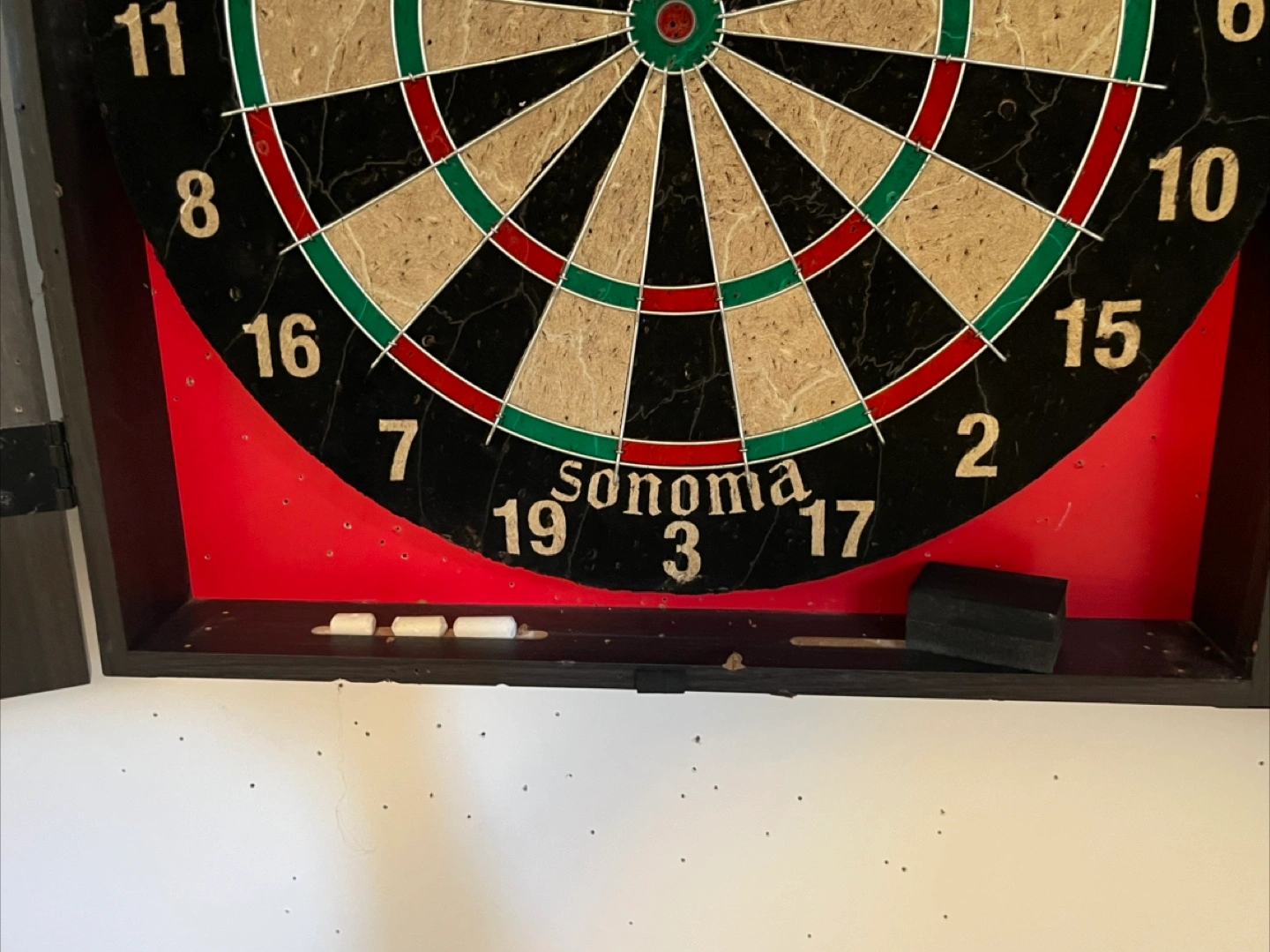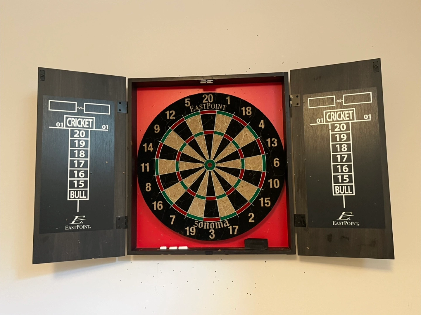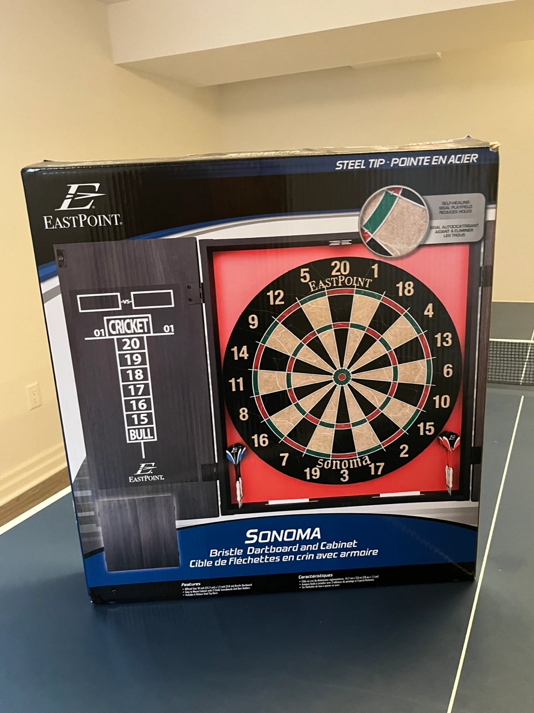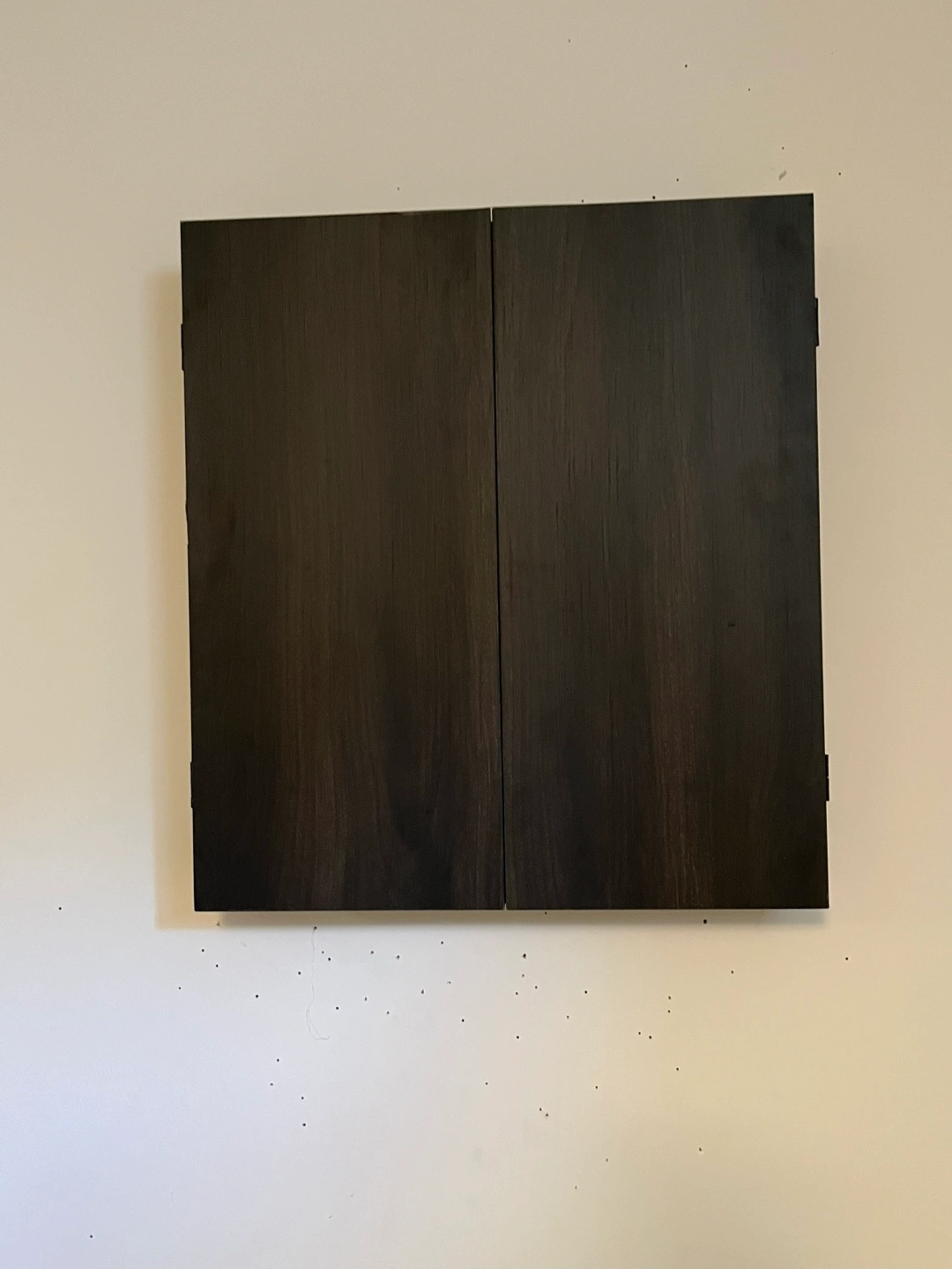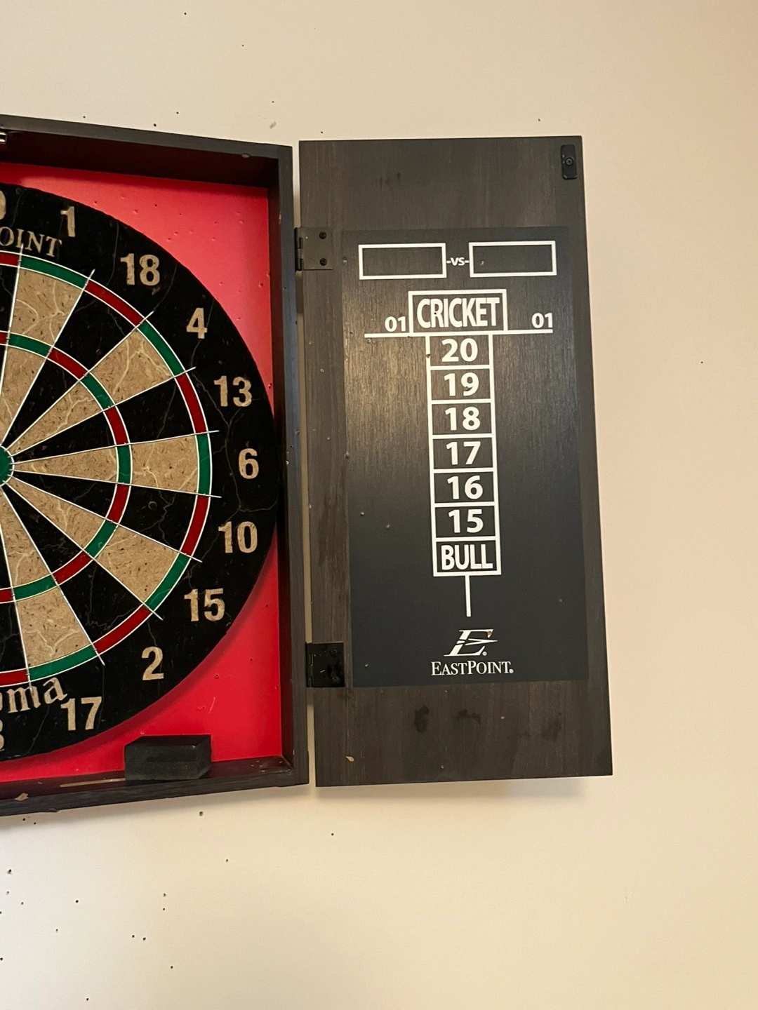 Cabinet for dartboard. Solid wood. Two doors with hinges. Includes a dart board and two side scoreboards. A fantastic way to spend some quality time with friends and family.
