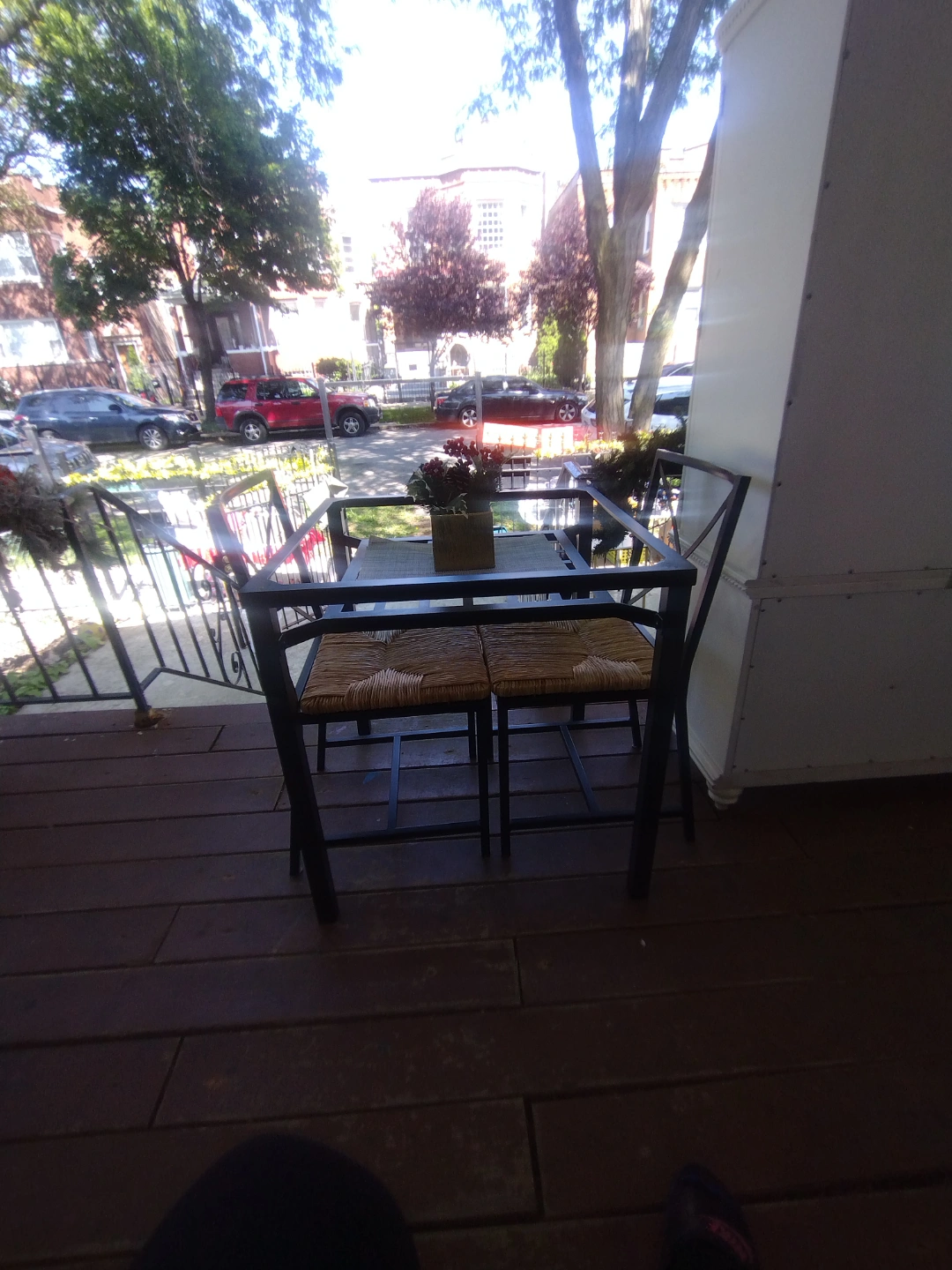 134Square table with two matching chairs. The frame appears to be made of metal. Chairs have woven seat cushions. Imagine enjoying a lovely afternoon tea with this set outside on your porch. Glass top. In great condition