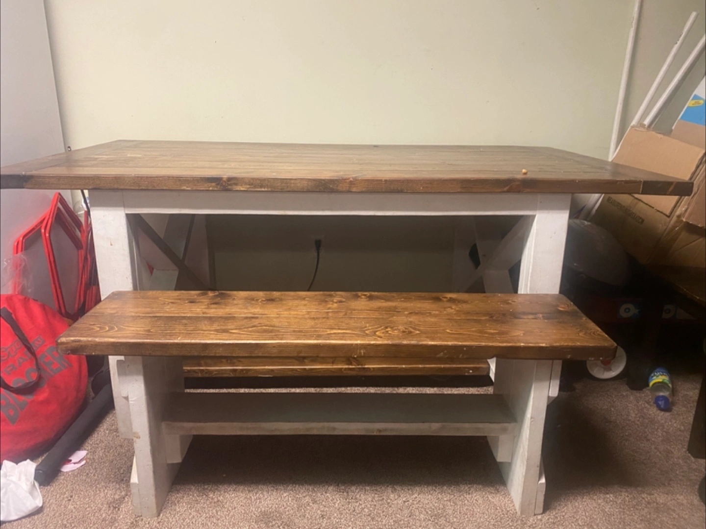 Custom made Wooden farmhouse table. Features a dark stained top and a white base. Matching bench with a similar stain. Good condition with lots of life left. Seats 6 comfortably