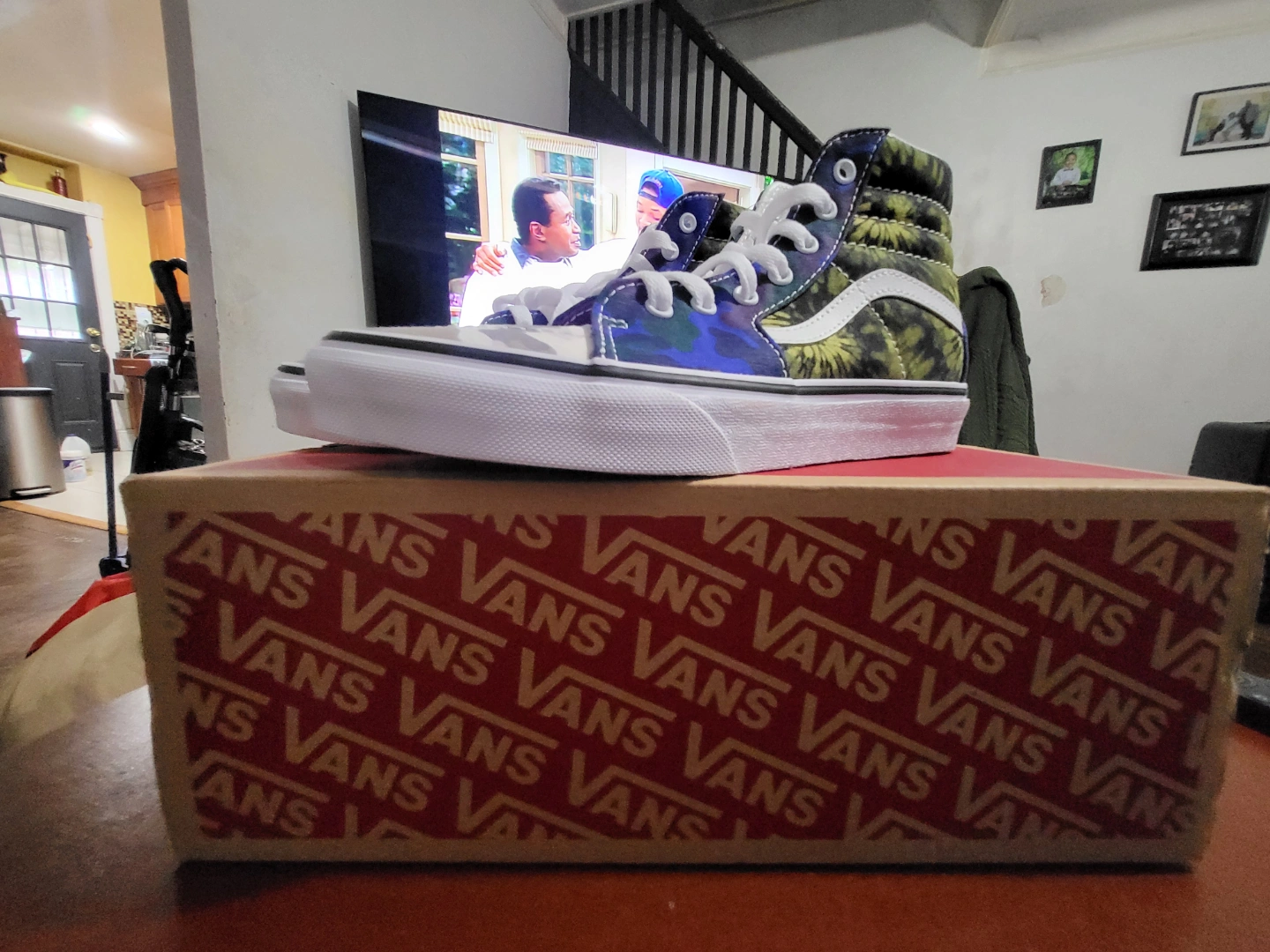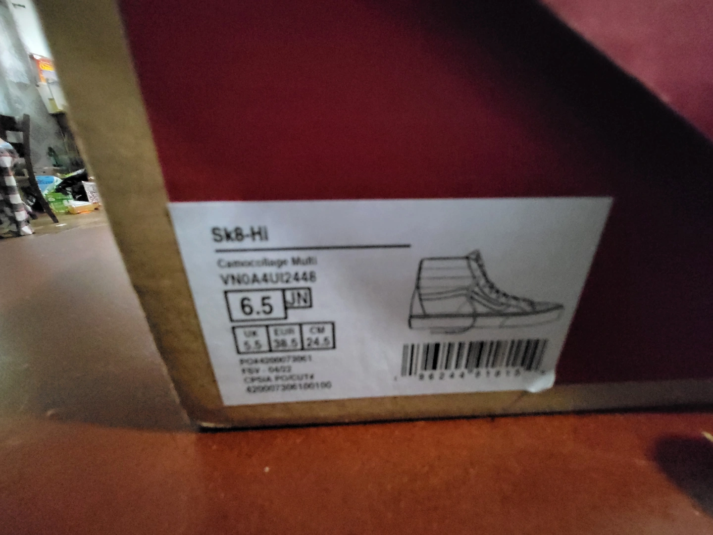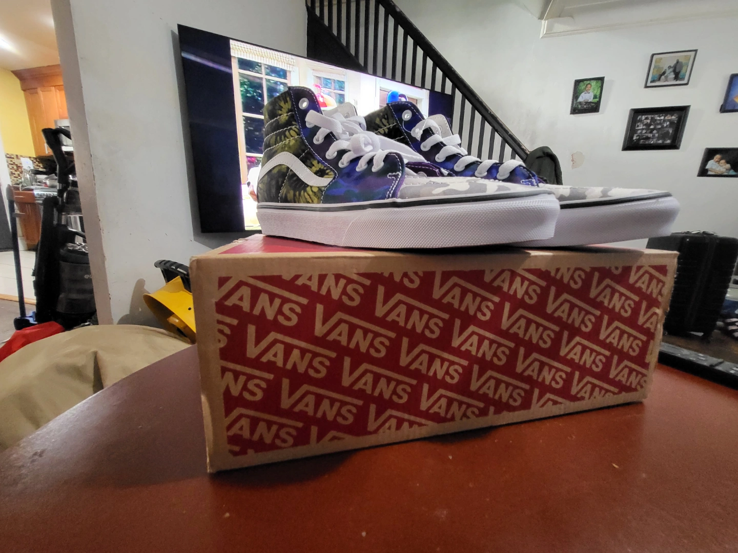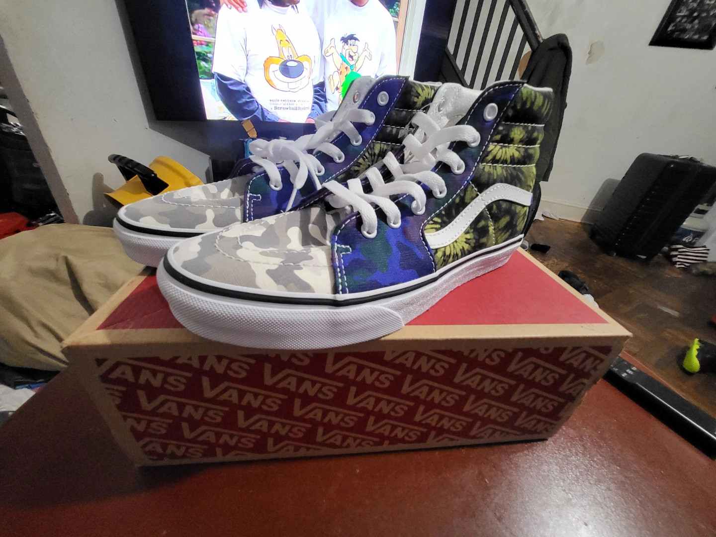 Vans skateboard sneakers. Camouflage pattern. White laces. Everyday shoes that you can use anywhere. You could take a walk outside in these lovely shoes.