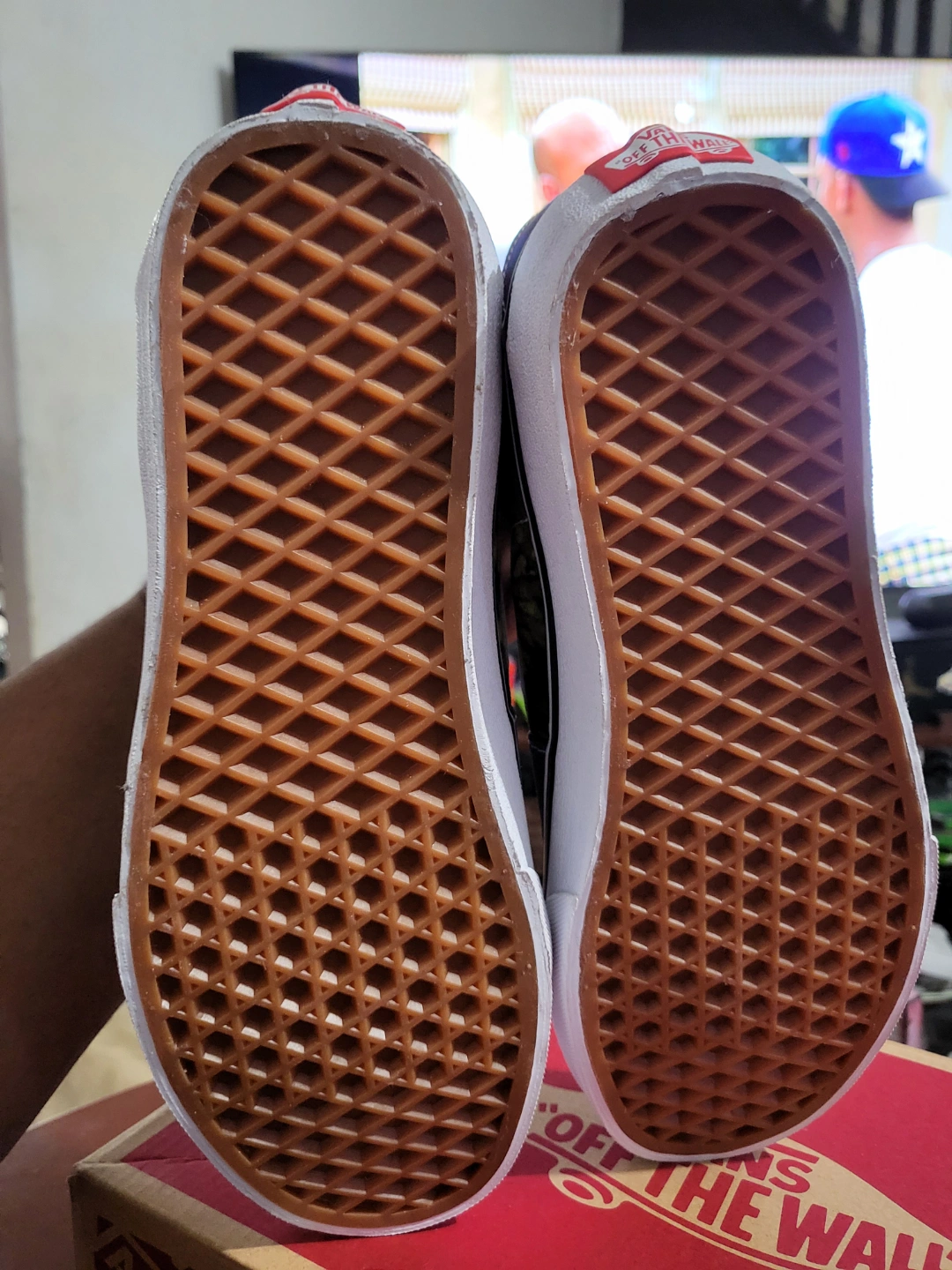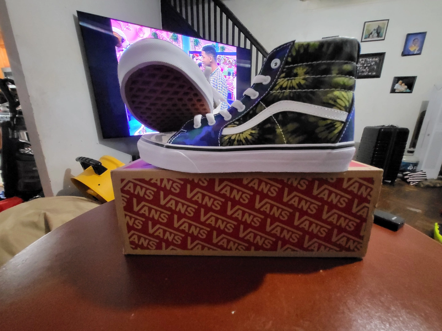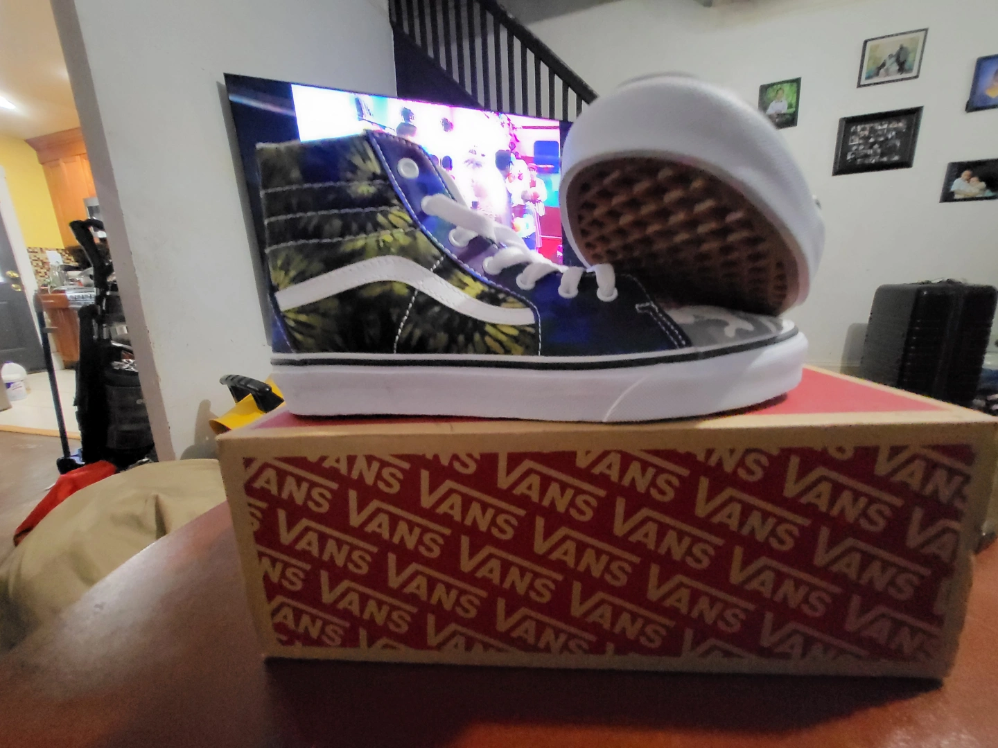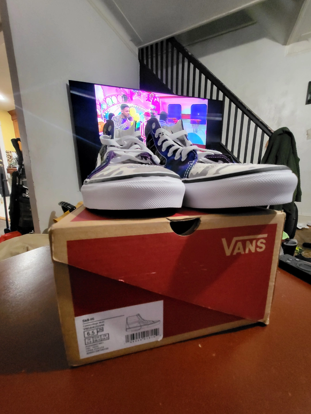 Vans skateboard sneakers. Camouflage pattern. White laces. Everyday shoes that you can use anywhere. You could take a walk outside in these lovely shoes.