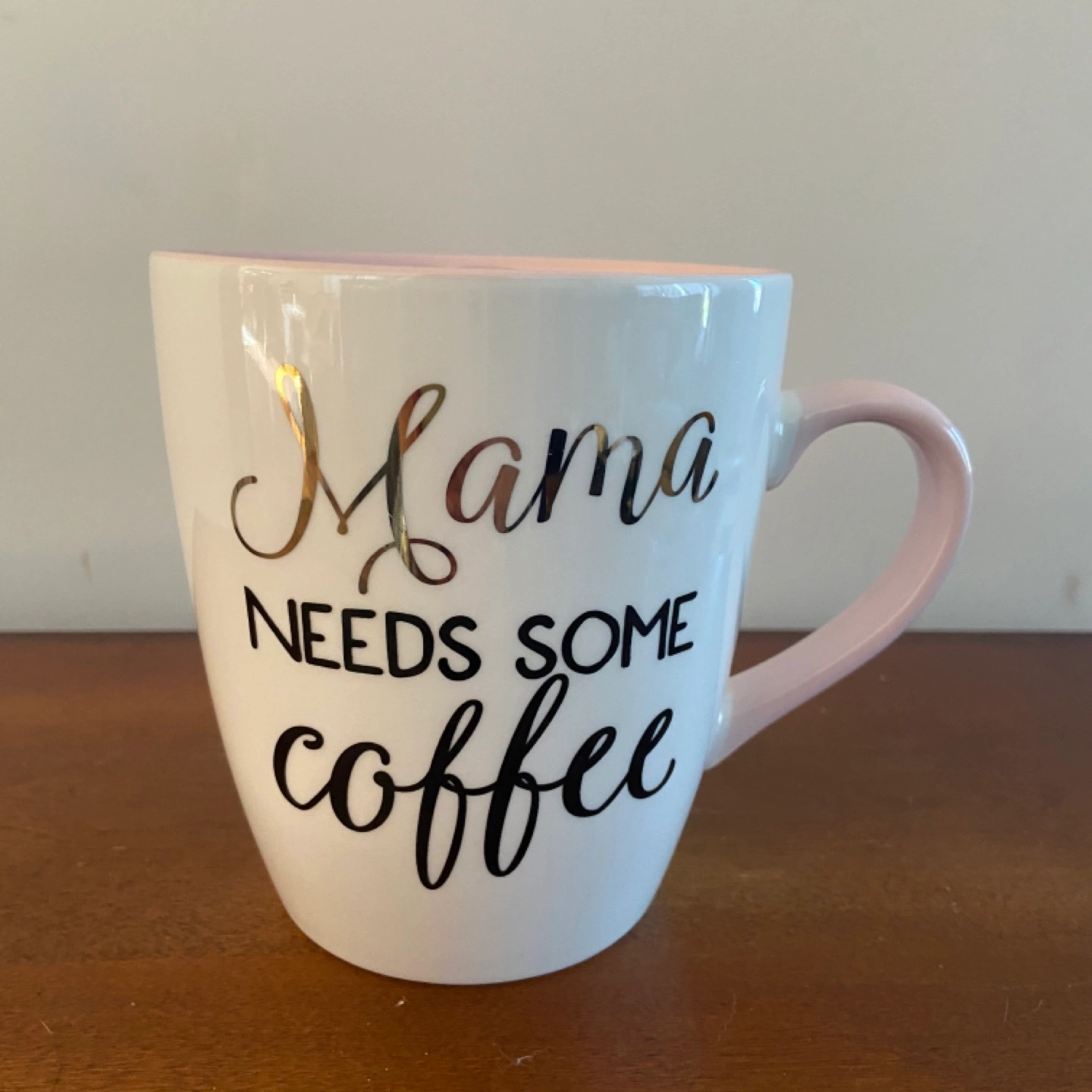 White mug with a pink handle. Features the phrase "Mama Needs Some Coffee". A nice item for a soothing cup of coffee in the morning.