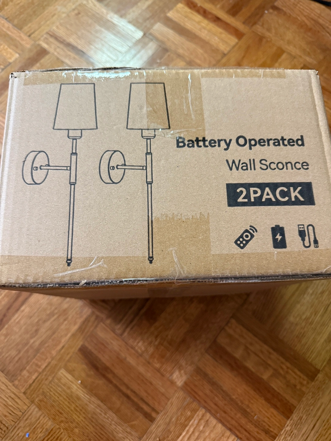 Packaged wall sconces. They are battery operated. Comes in a two pack. Perfect for adding a touch of coziness to any room.(brand new in box)