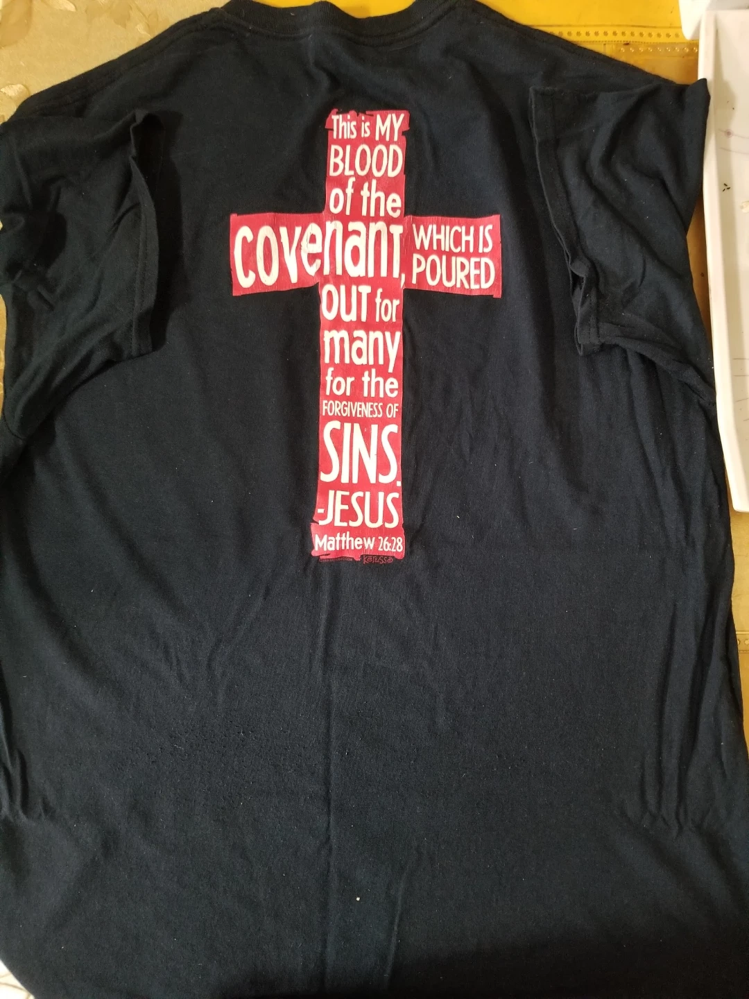 A black t-shirt. Features text and graphic on the front and back. Could be a comfortable, casual shirt to wear on a relaxing day.