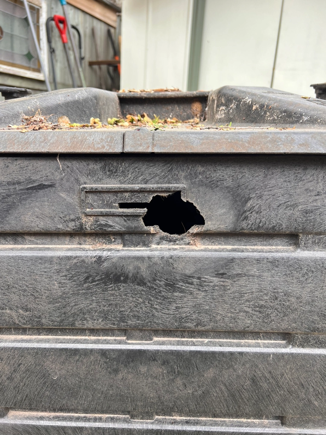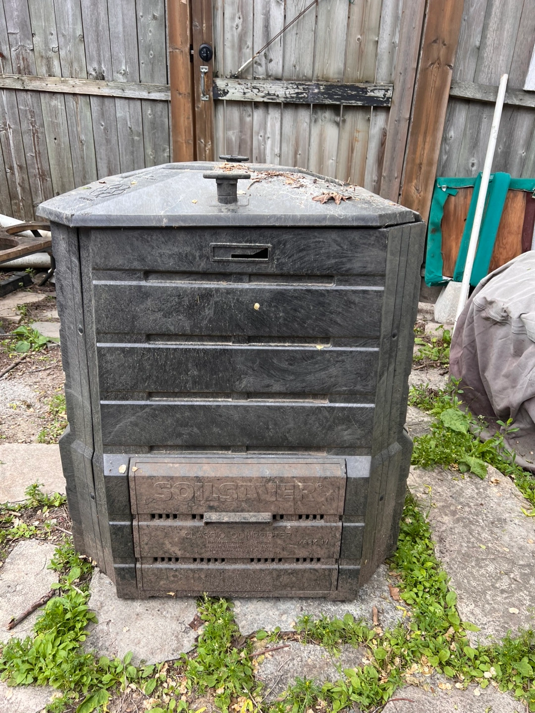 Soilsaver backyard composter. Used and in used condition. Comes with two access panels for getting the compost. All parts are there. Has one small hole where the air vent is. Photo taken to show the hole.