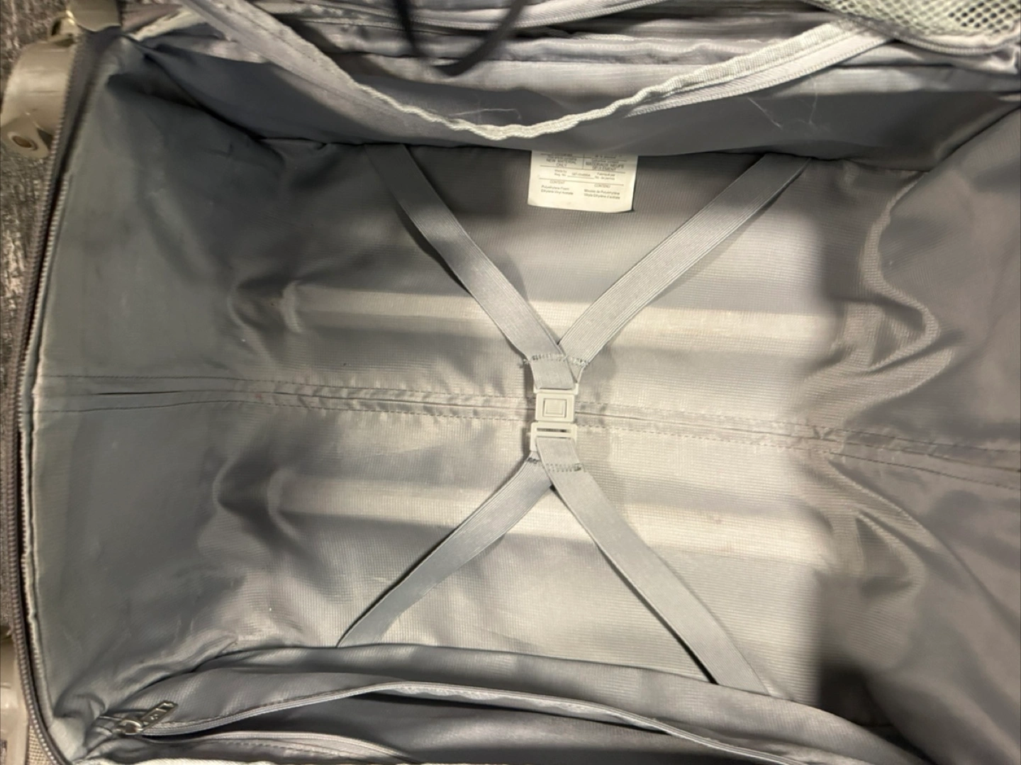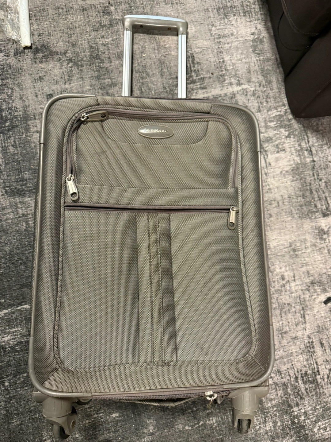 A gray suitcase with a retractable handle. Includes a zipper pocket on the front. Interior features a mesh pocket and straps. With this item, your travel will be smoother and more organized.