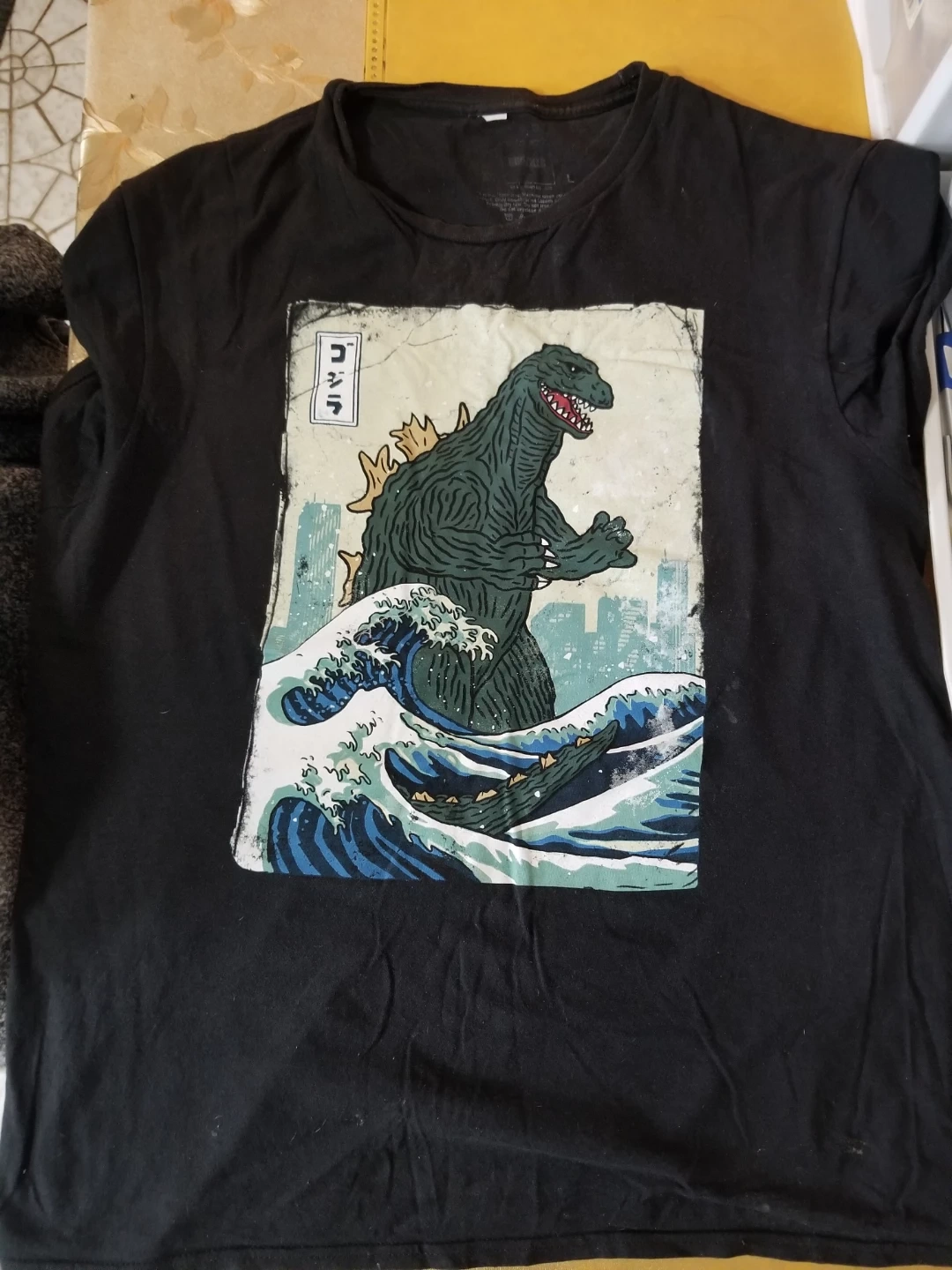 Black t-shirt. Features a Godzilla graphic. The shirt depicts Godzilla and the Japanese wave art style.