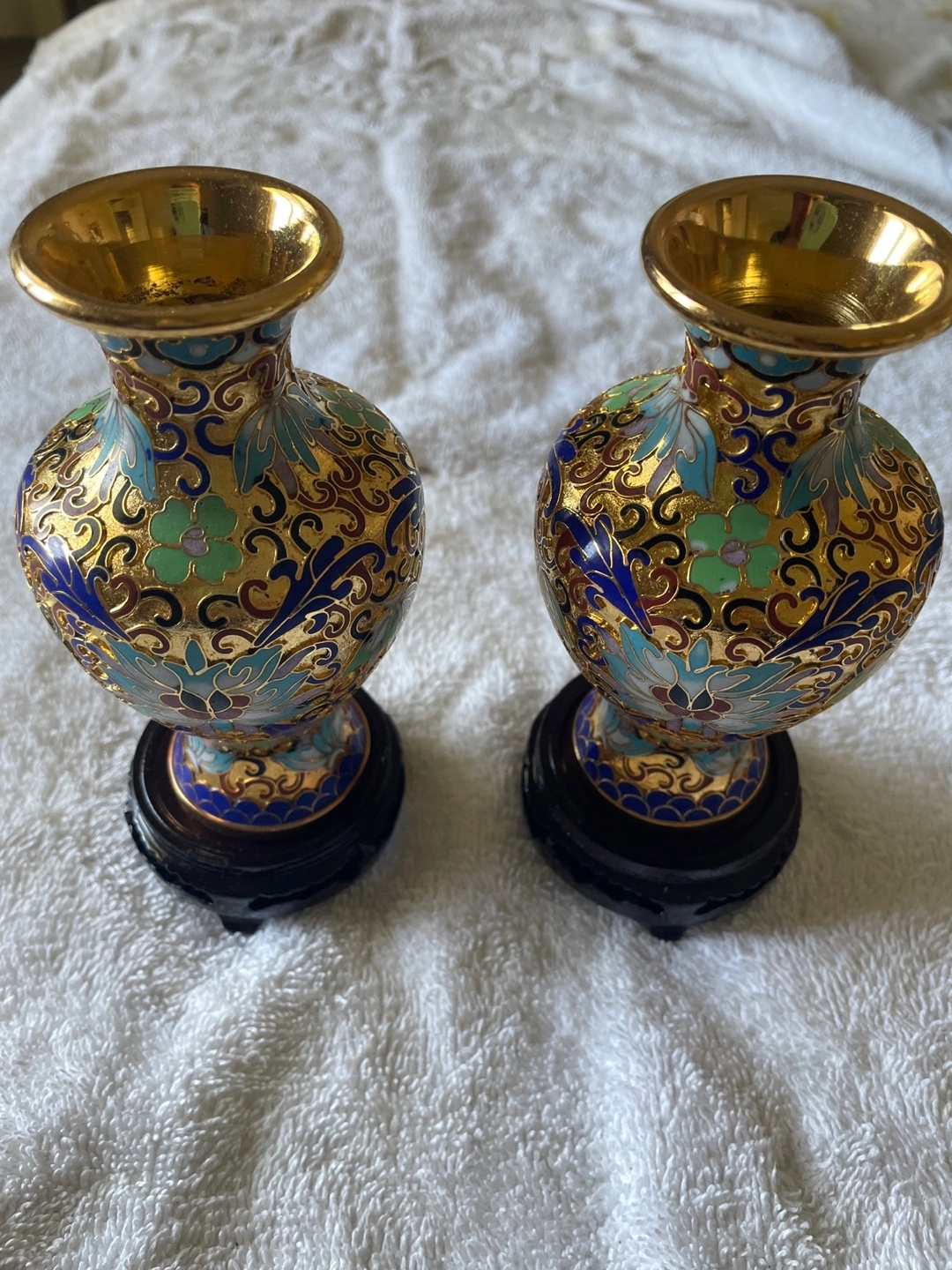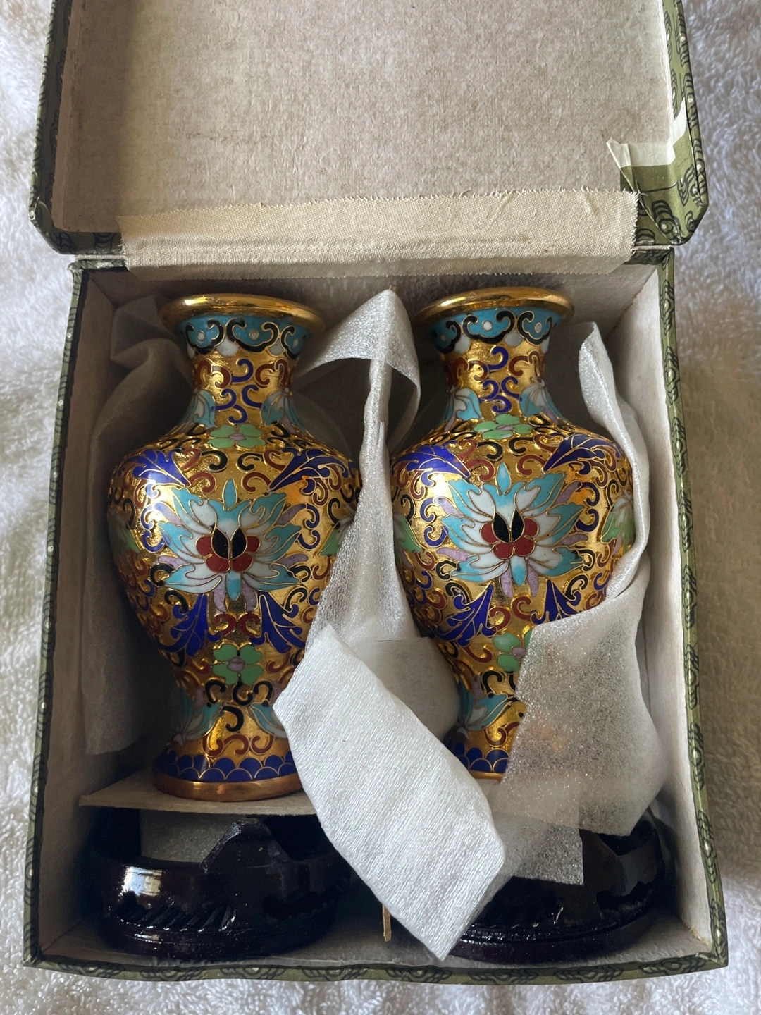 60Two beautiful Cloisonné decorative vases, both 5” on a wooden display. Made by JingFa from China. Brand new still in original box. For local pickup in Jackson Heights 11372.