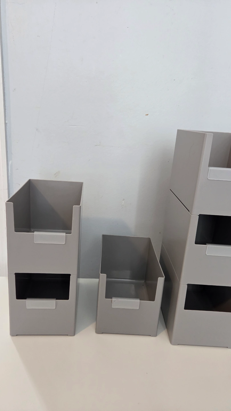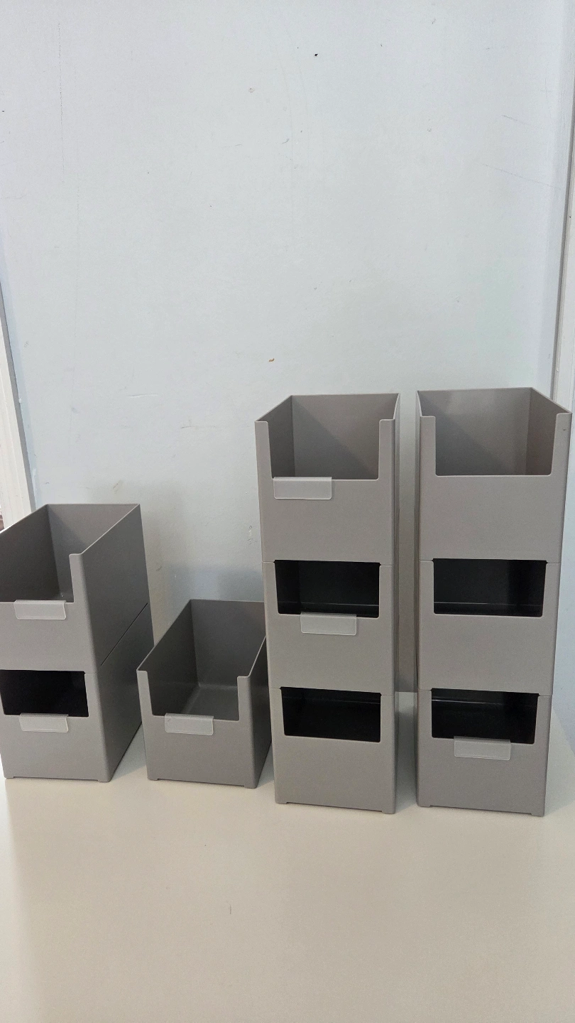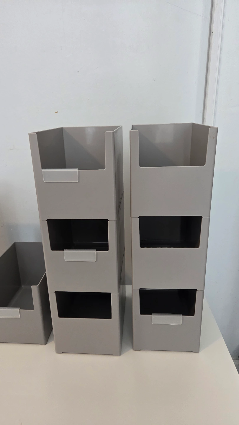 Gray stackable storage containers. These containers can help you organize and sort various items. Perfect for creating a more organized space.