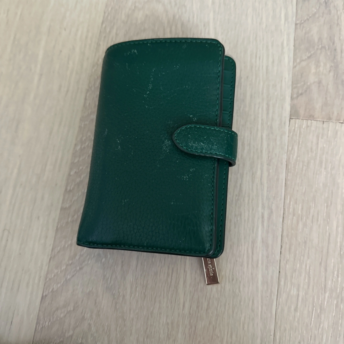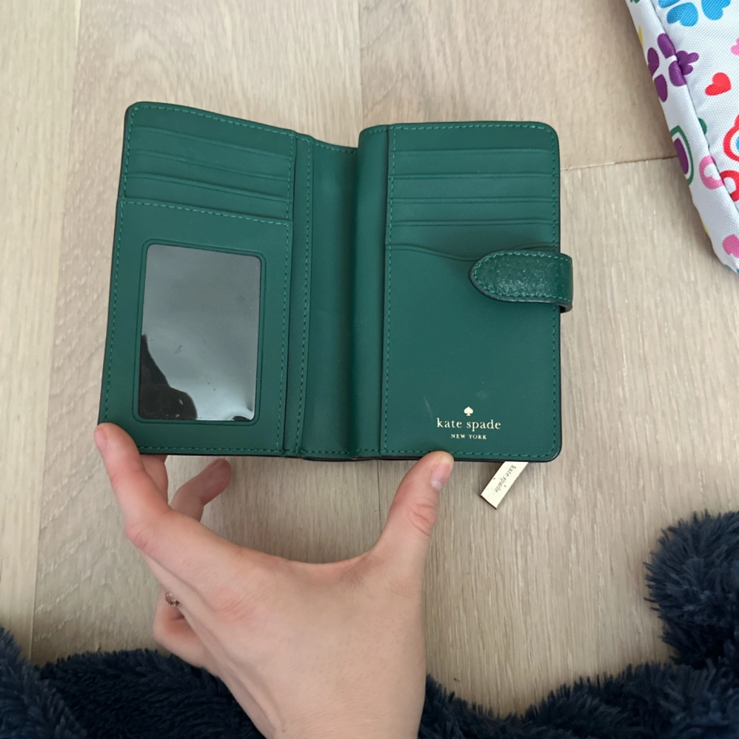 75Green wallet. Snap closure. Several card slots. A great wallet for keeping things organized.