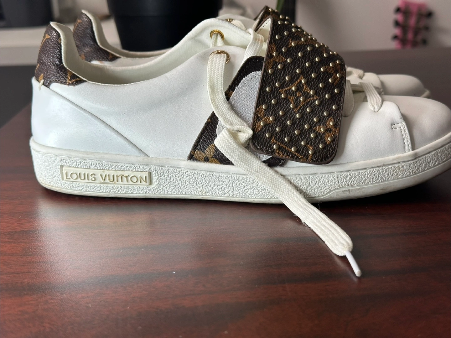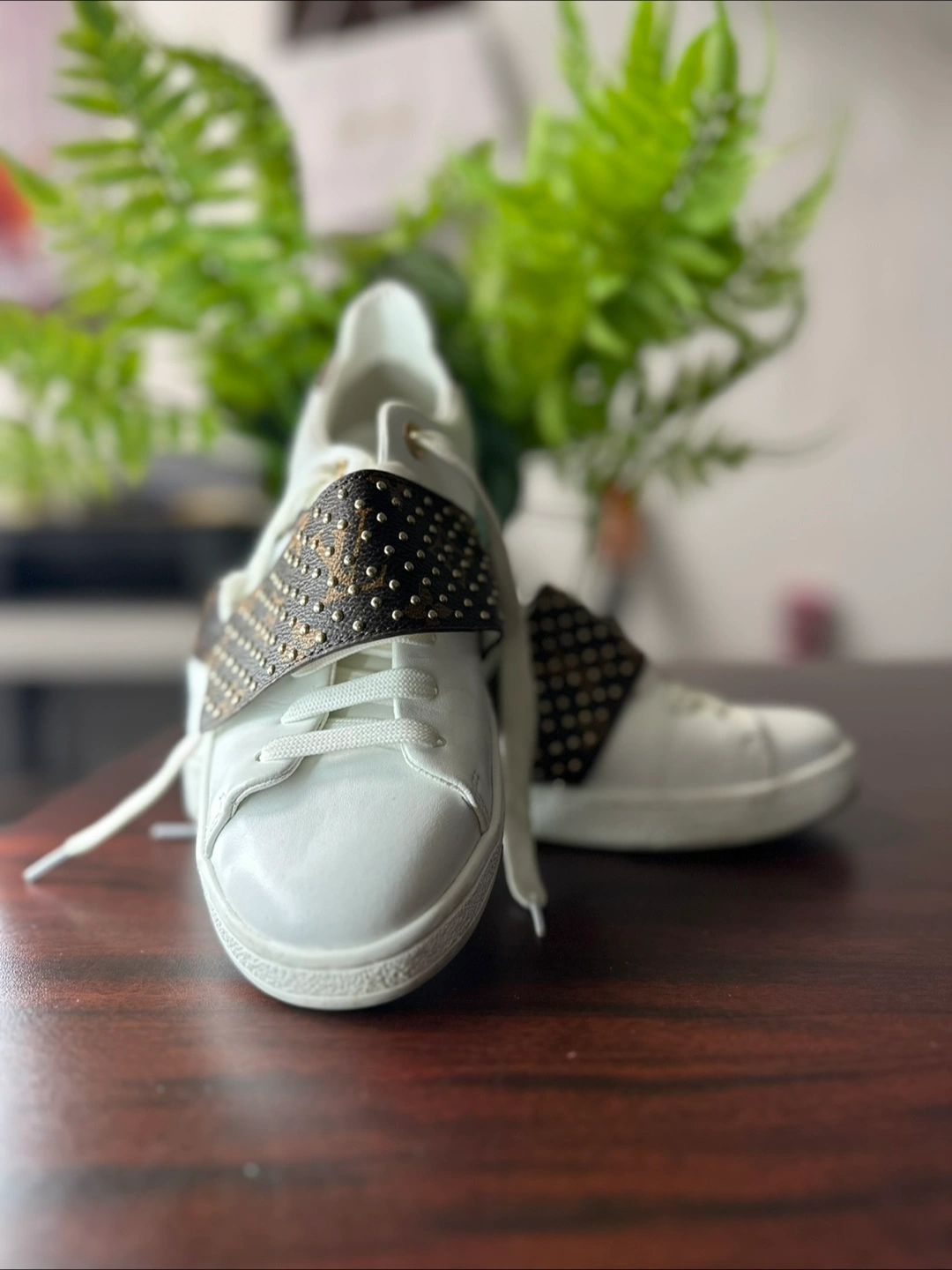 188White sneakers with a studded brown strap. Feature brown accents and the Louis Vuitton logo on the side. You could stroll through a garden path while wearing these.