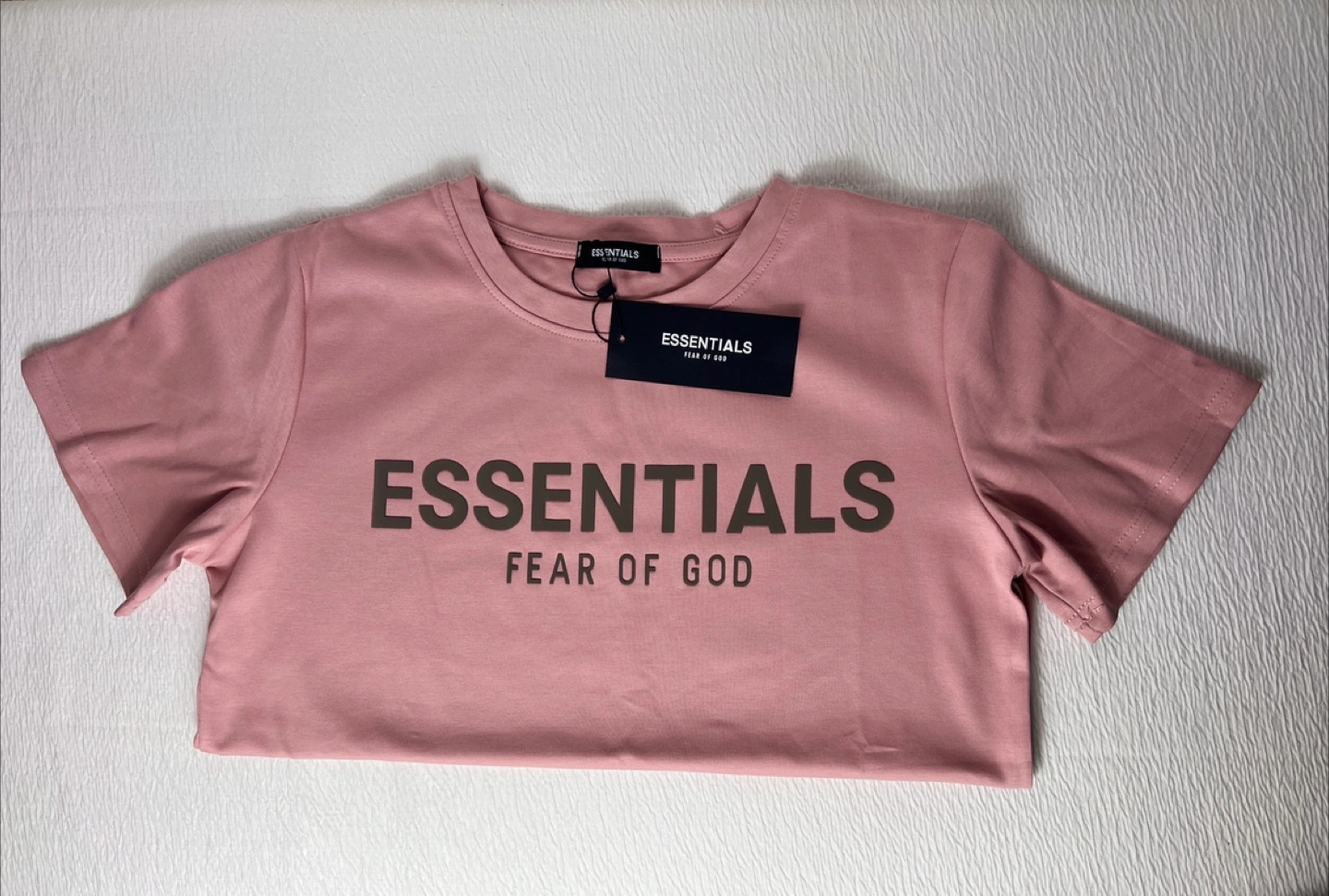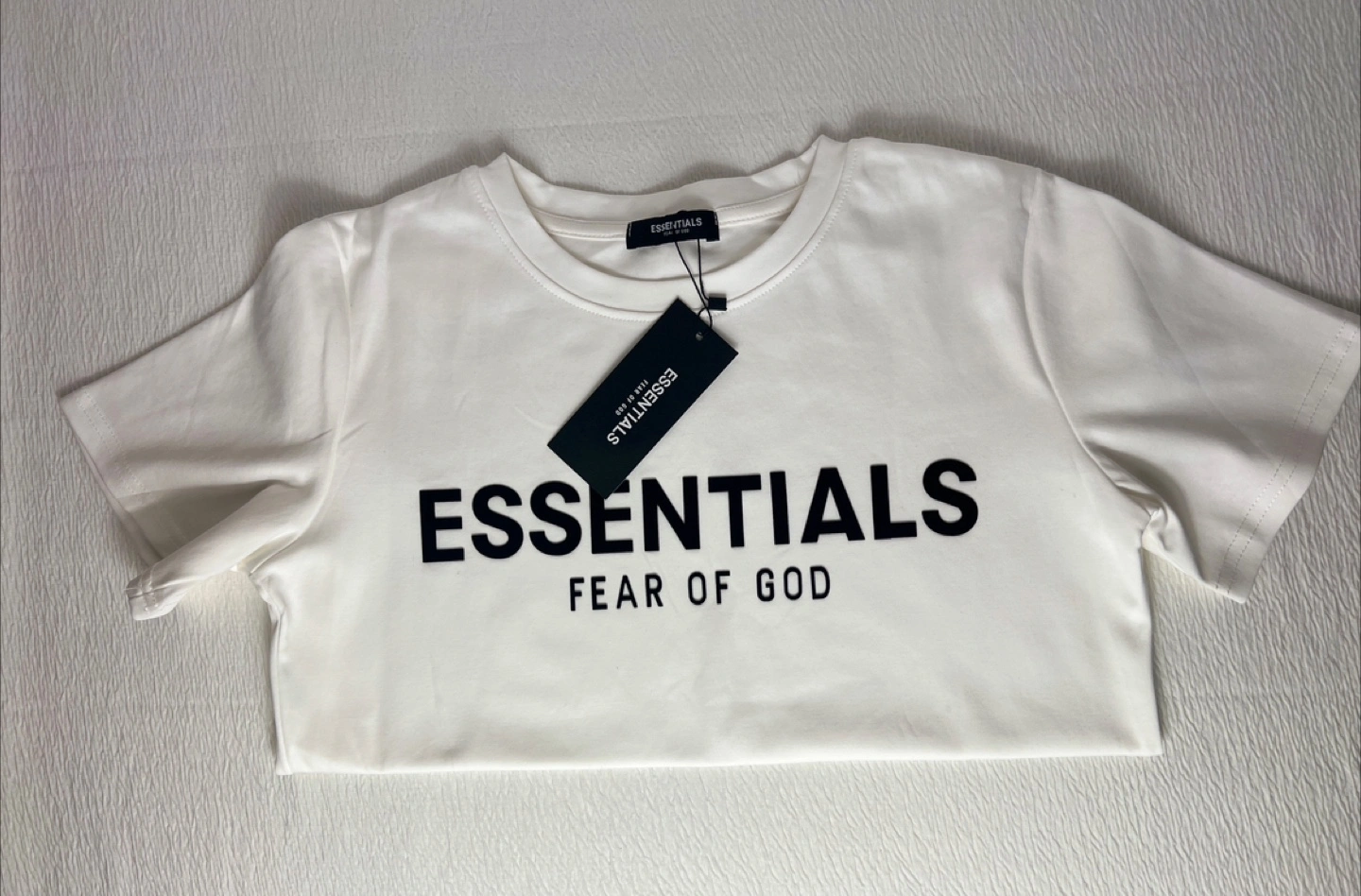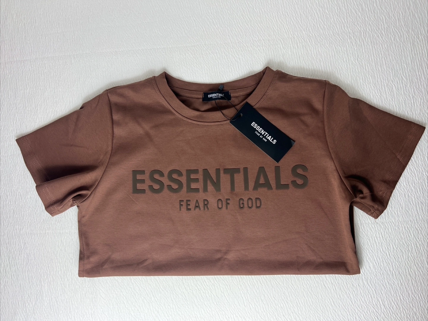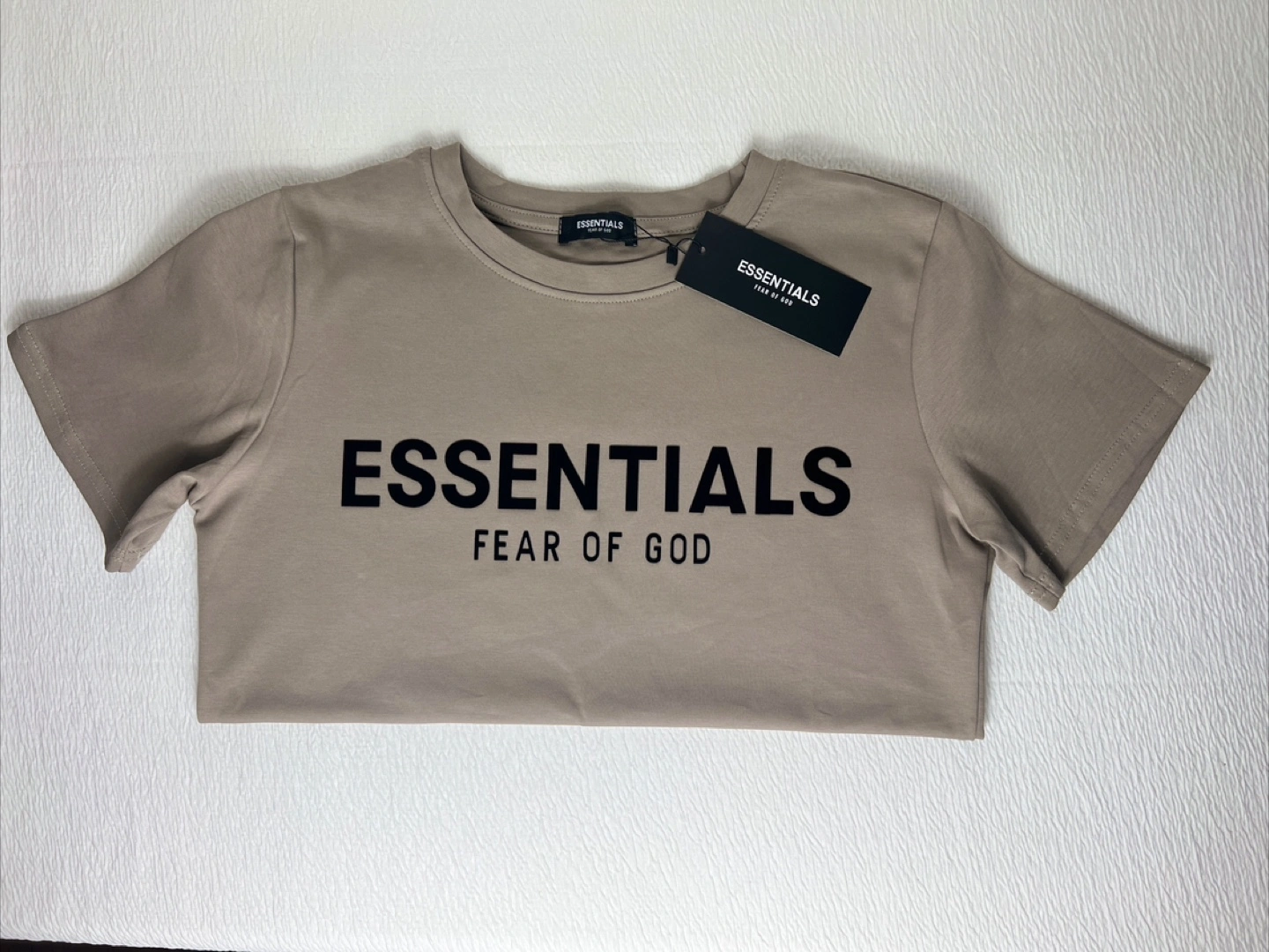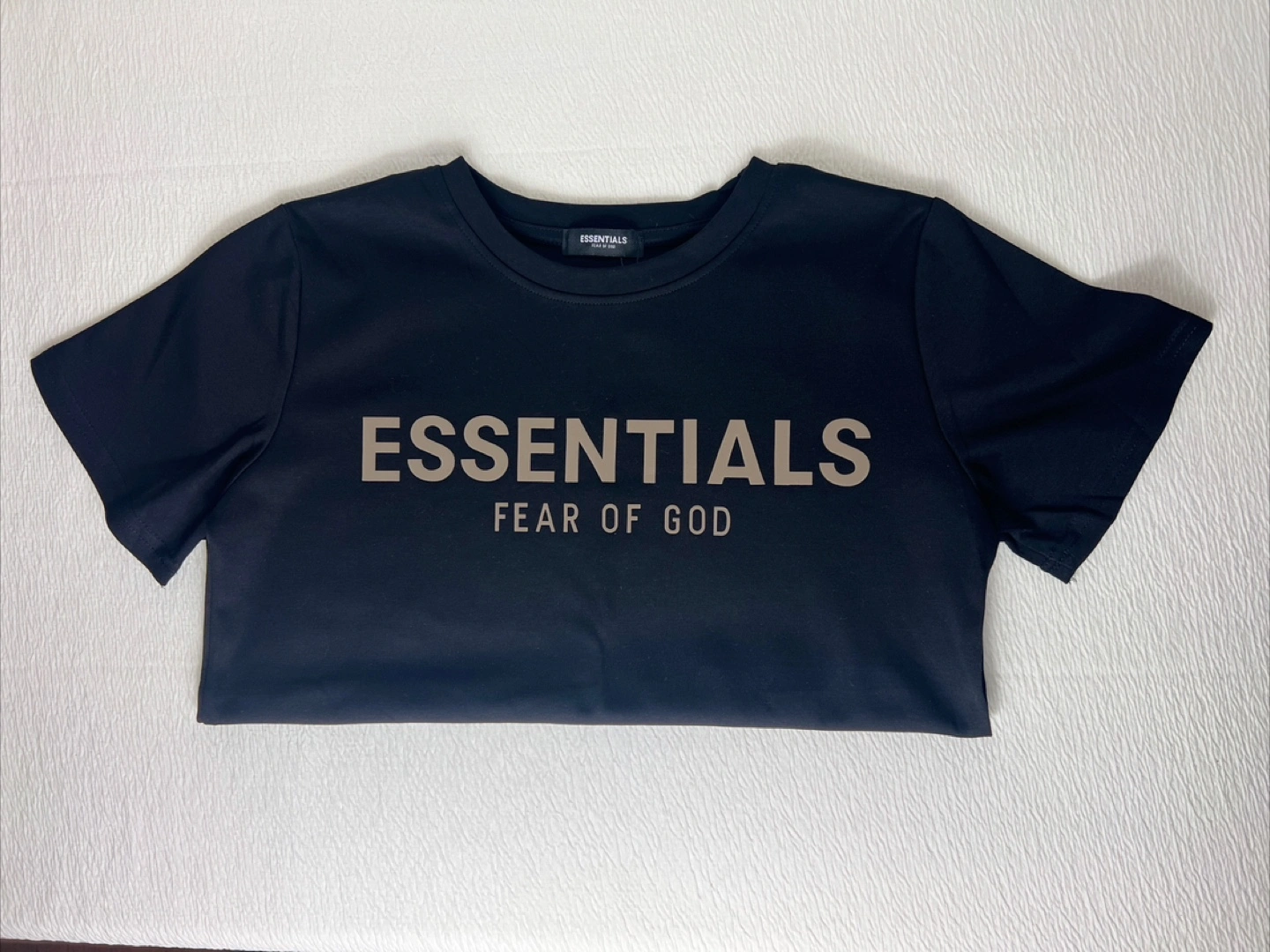 105A short sleeve t-shirt. Features the word "Essentials". Also has "Fear of God" printed beneath. Comfortable enough for everyday wear. One size fits up to XL