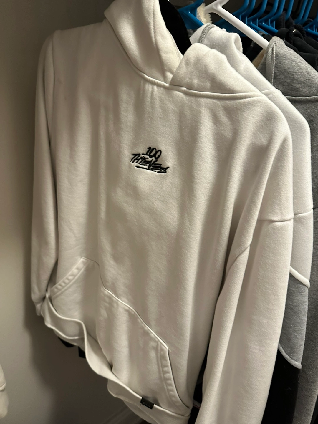 White hoodie. Long sleeves. Features a pocket in the front. Great for snuggling up in on a cold day.