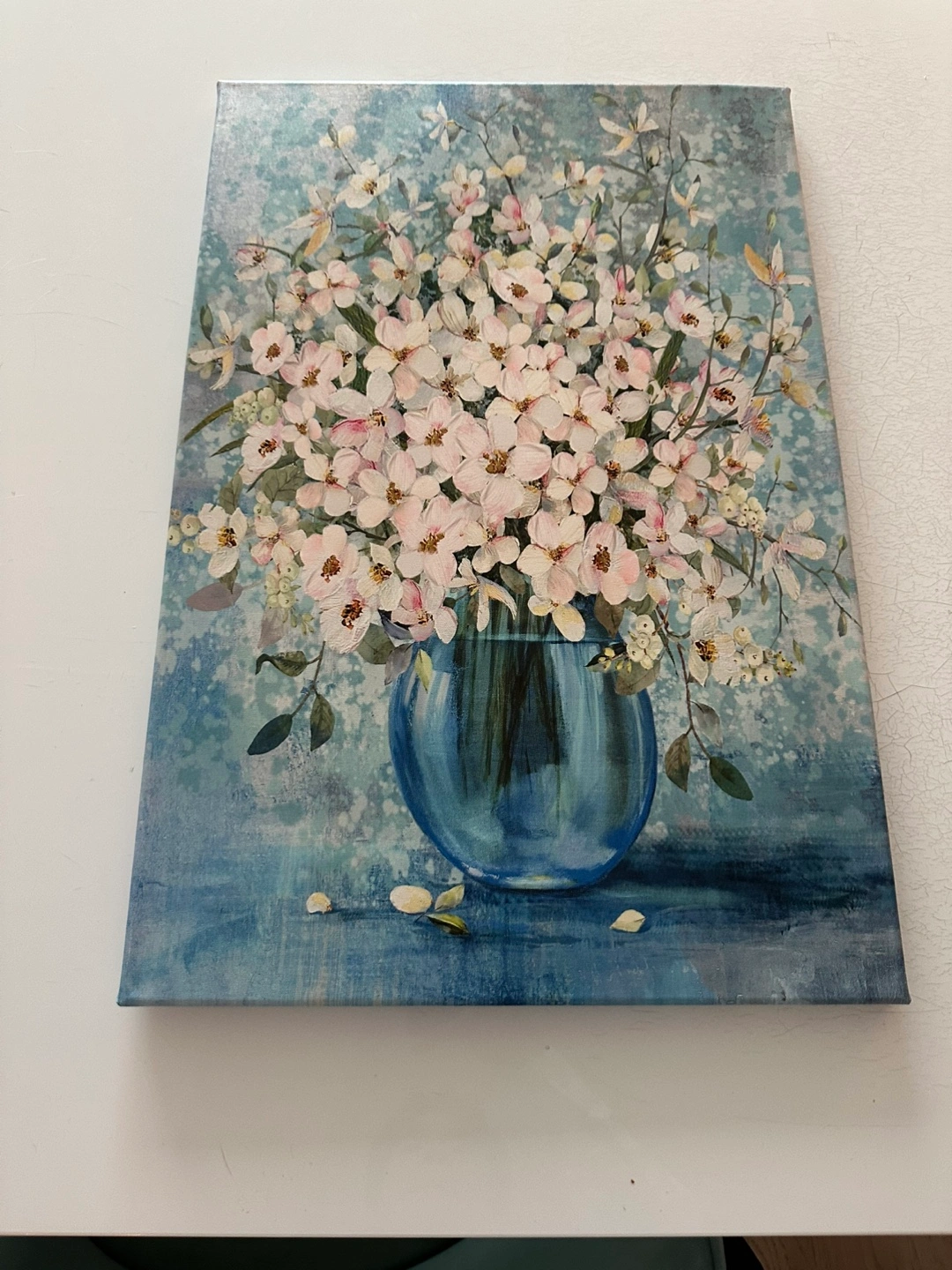 Artwork of a vase full of flowers. Features a blue background. Would look lovely in a bedroom for a sense of peace and serenity.